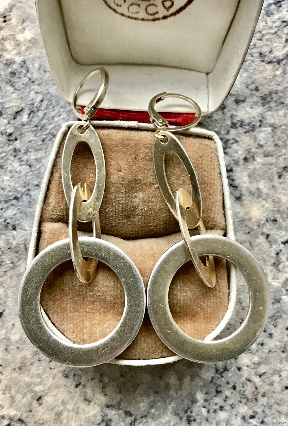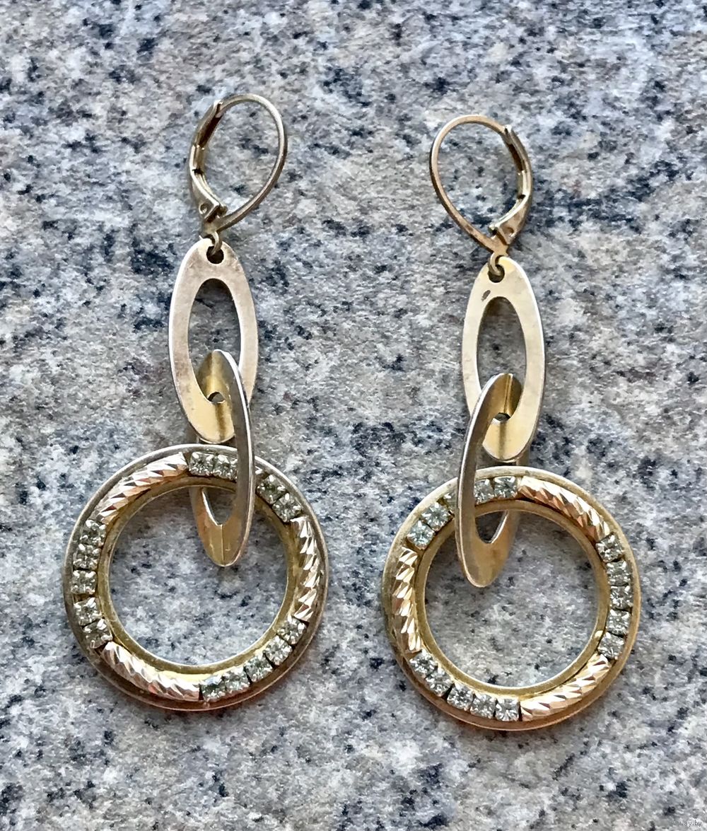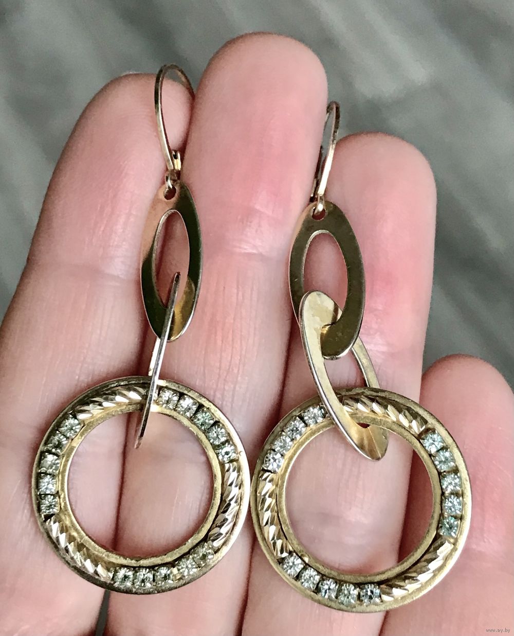 Крупные серьги из металла золотого тона (местами есть незначительные потёртости позолоты) и вставок из кристаллов. Высота серьги 6,3см., диаметр нижней подвески 2,4см.