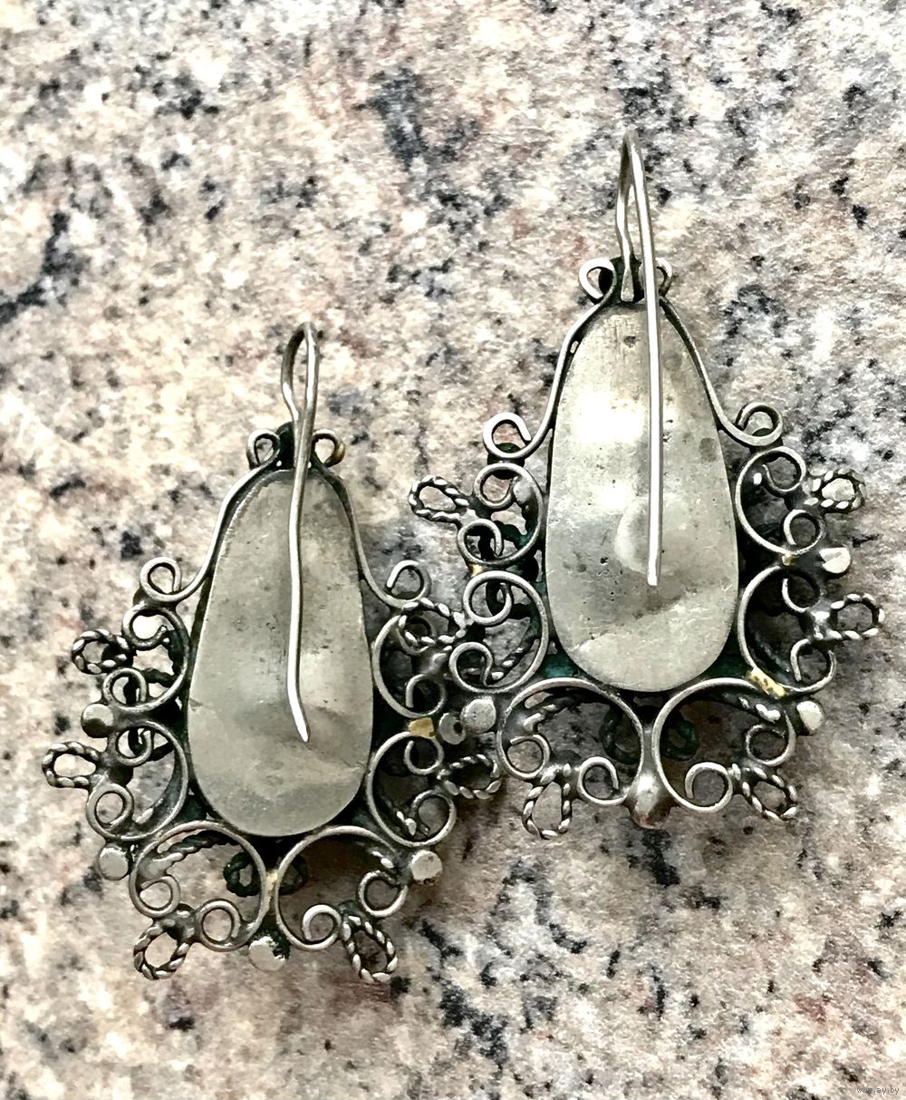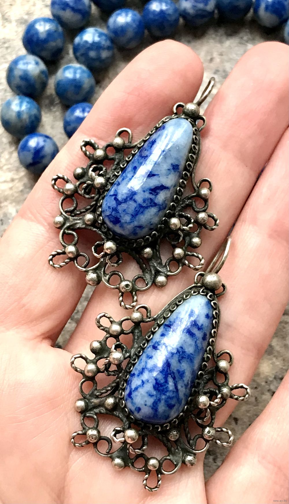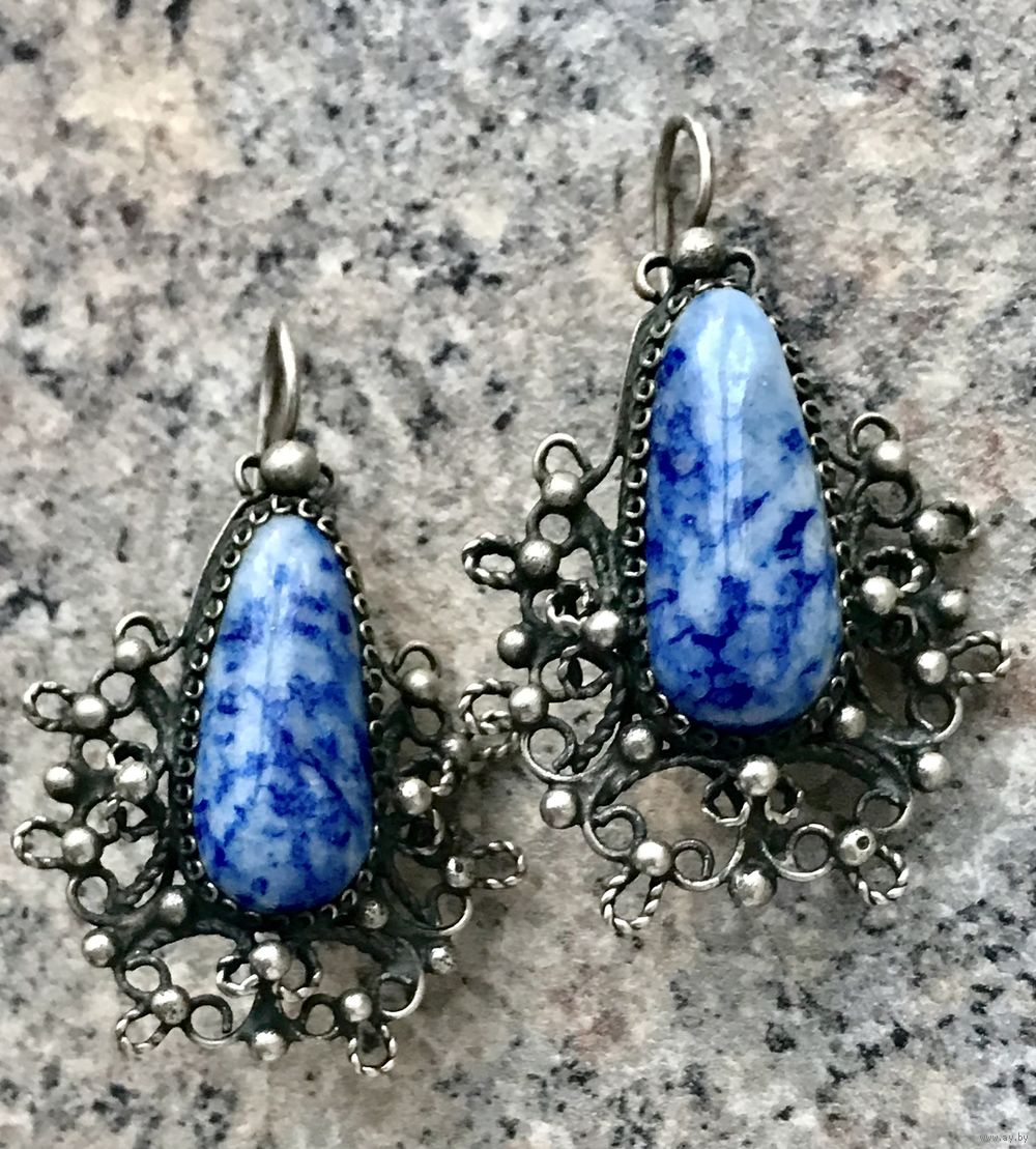 Винтажные крупные серьги из мельхиора со вставками из лазурита, ручная работа. Высота серьги 5см., ширина 3,3см. Вставка 2,5х1см. Вес 22гр. Состояние хорошее.