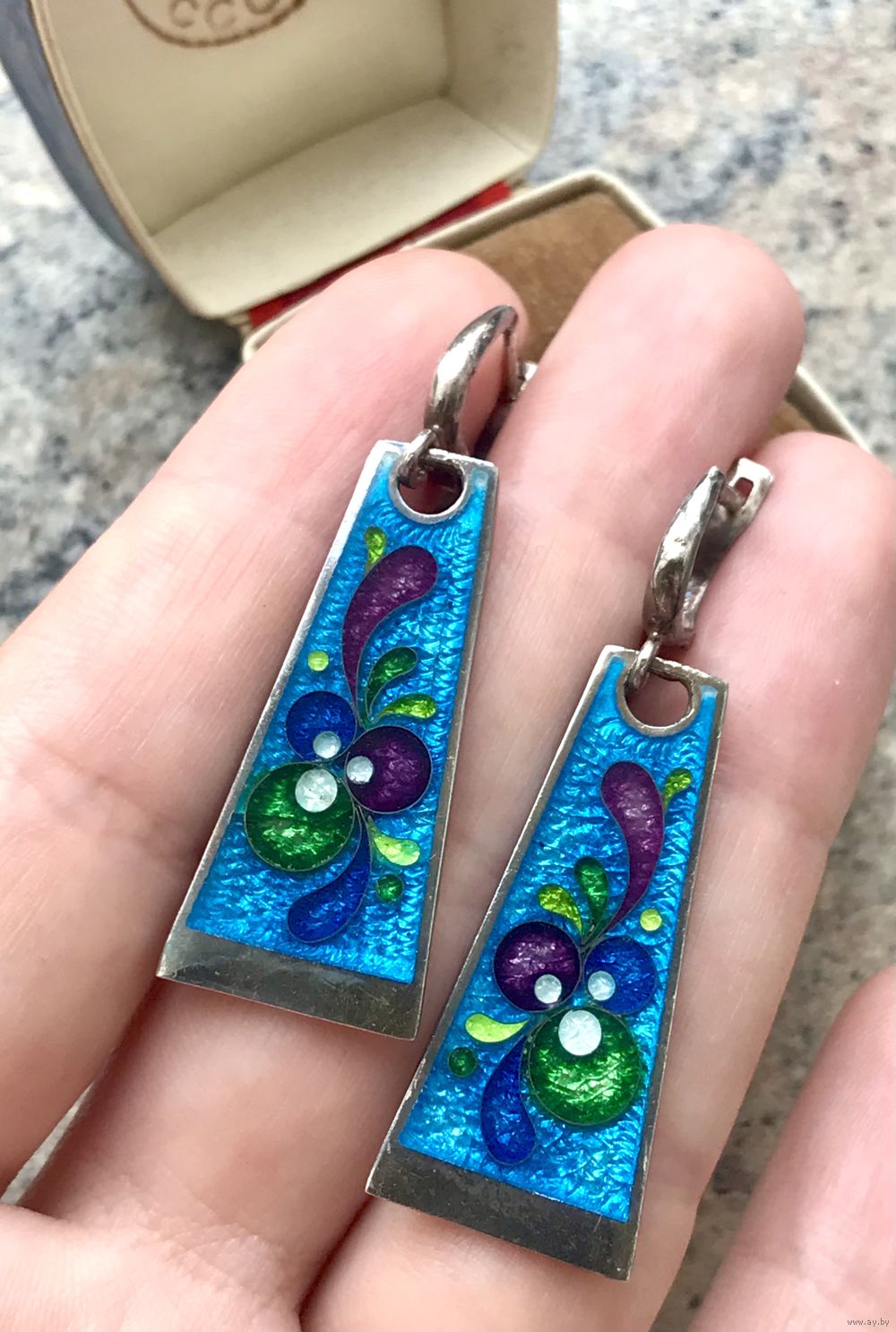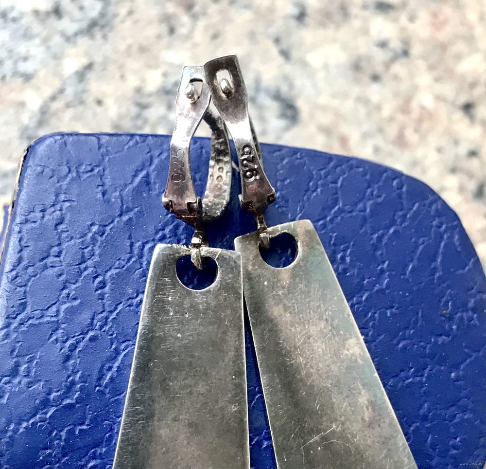 Серьги в технике минанкари (перегородчатая эмаль), основа из серебра 925пр. Высота серьги 4,5см., подвеска в виде трапеции высотой 3,5см., ширина от 0,7см. до 1,5см. у основания. Вес 9гр. Состояние хорошее.
