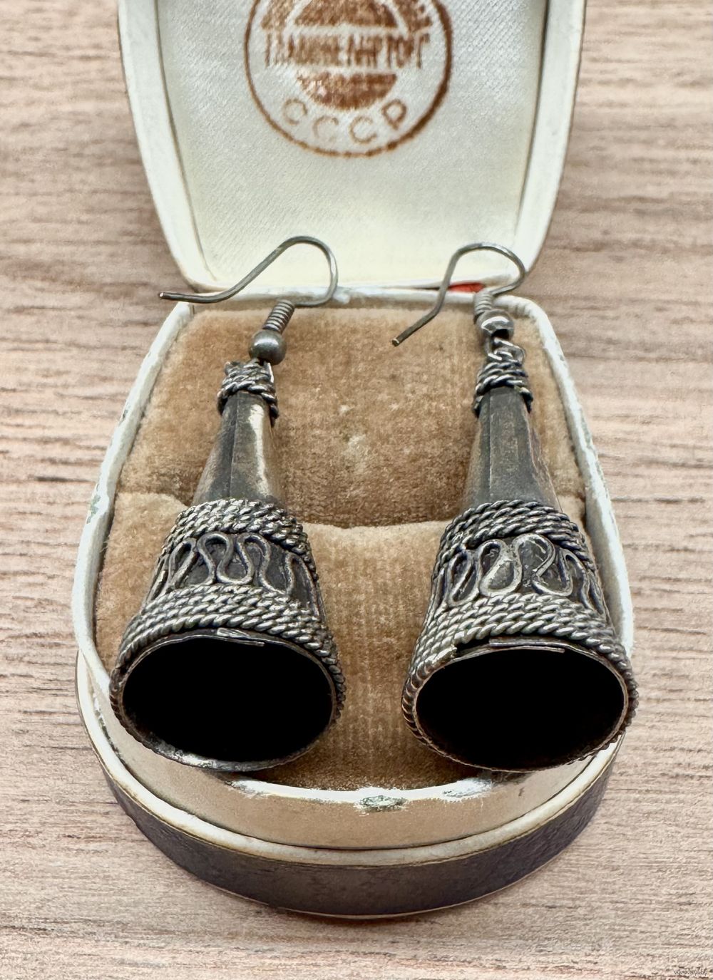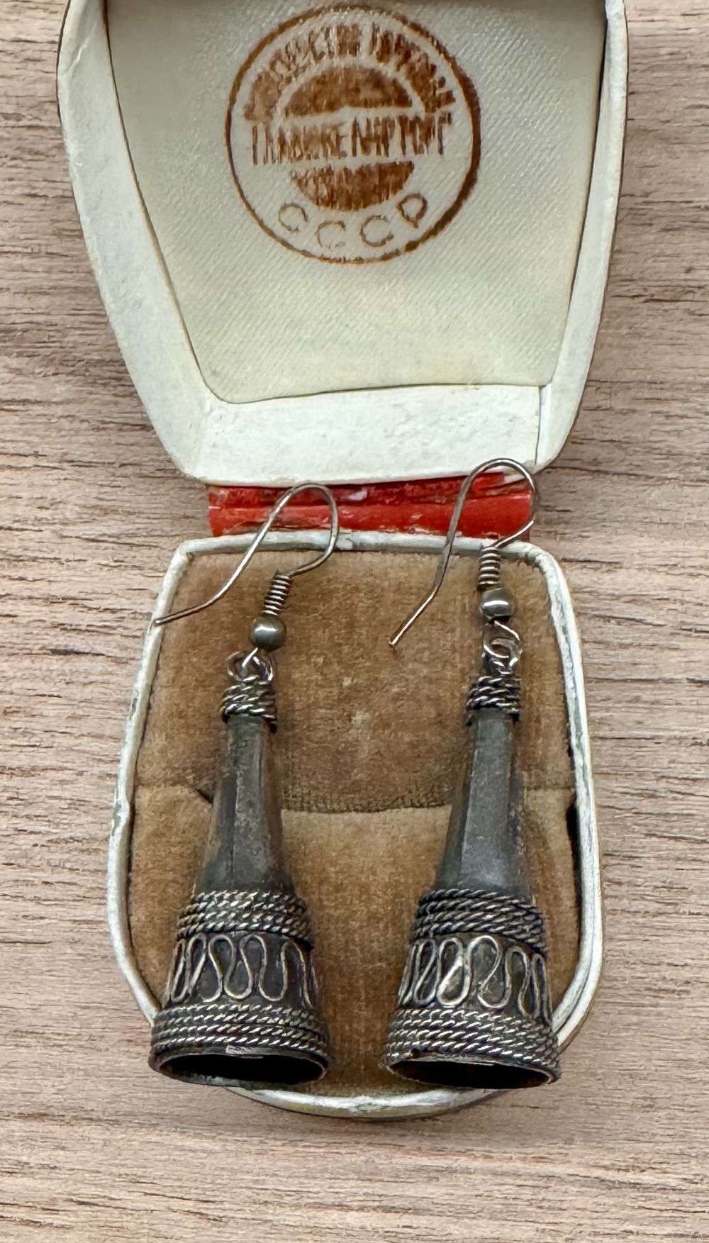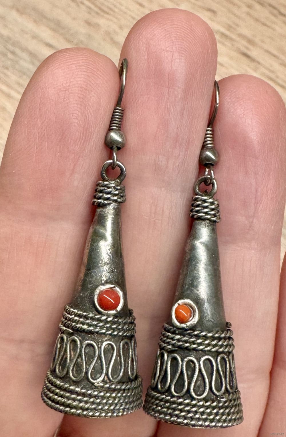 Этнические серьги из металла серебристого тона, вставки из смальты под коралл. Высота серьги 5см. Состояние хорошее.