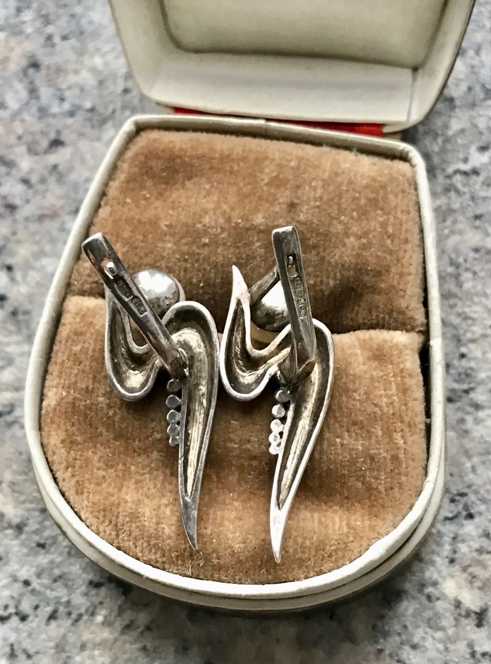 Серьги из серебра 925пр. (стоит пробирное клеймо Украины) и жемчужными вставками. Высота серьги 2,8см. Состояние хорошее.