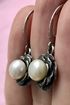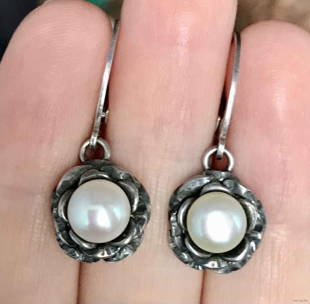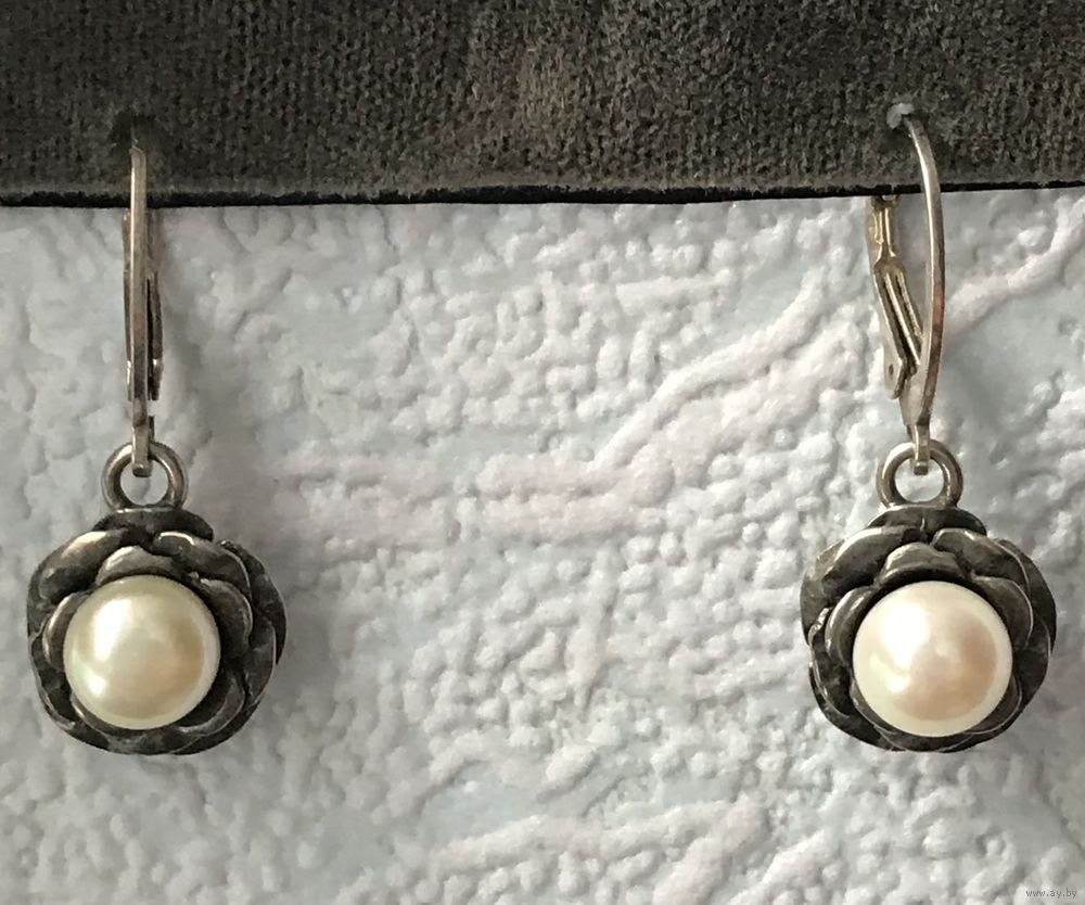 Серьги из серебра и жемчужных вставок. На каждой застёжке стоит отметка 925. Высота серьги 3,2см., диаметр жемчужины 0,7см. Состояние хорошее.