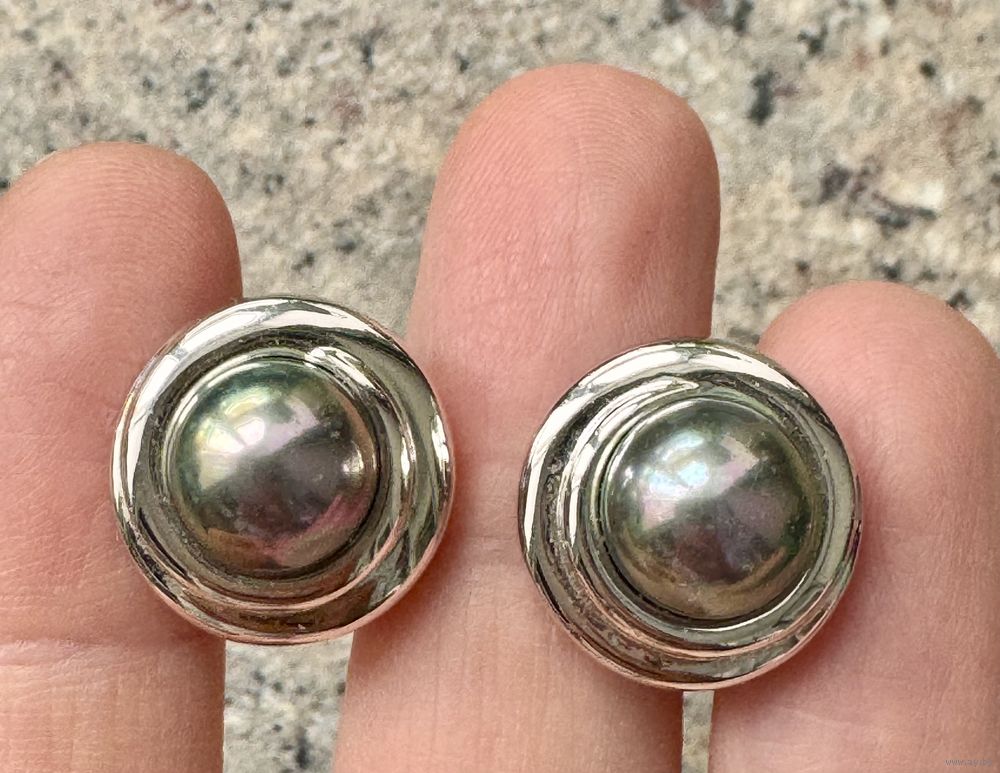Крупные винтажные серьги-пусеты с основой из металла серебристого тона, вставка-имитация чёрного жемчуга. Диаметр шляпки 1,6см., диаметр вставки 1см. Маркированы (атрибутировать не удалось). Состояние хорошее.