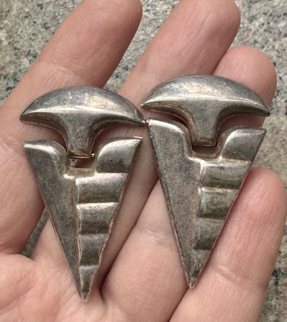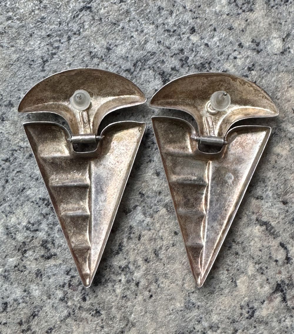 Крупные винтажные серьги-пусеты из серебра (с обратной стороны каждой стоит отметка 925 и еще как е-то обозначения). Нижняя часть подвижна. Высота серьги 4,5см., вес пары 7,39гр. Утеряны оригинальные зажимы, прилагаю силиконовые заглушки. Состояние хорошее.