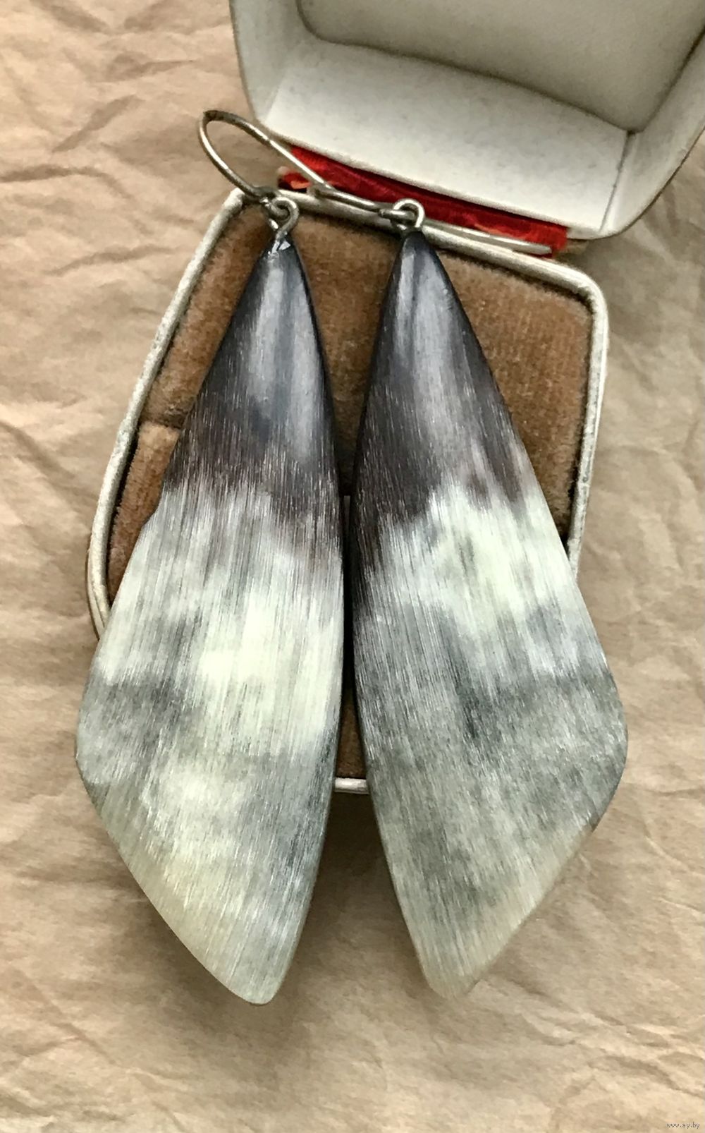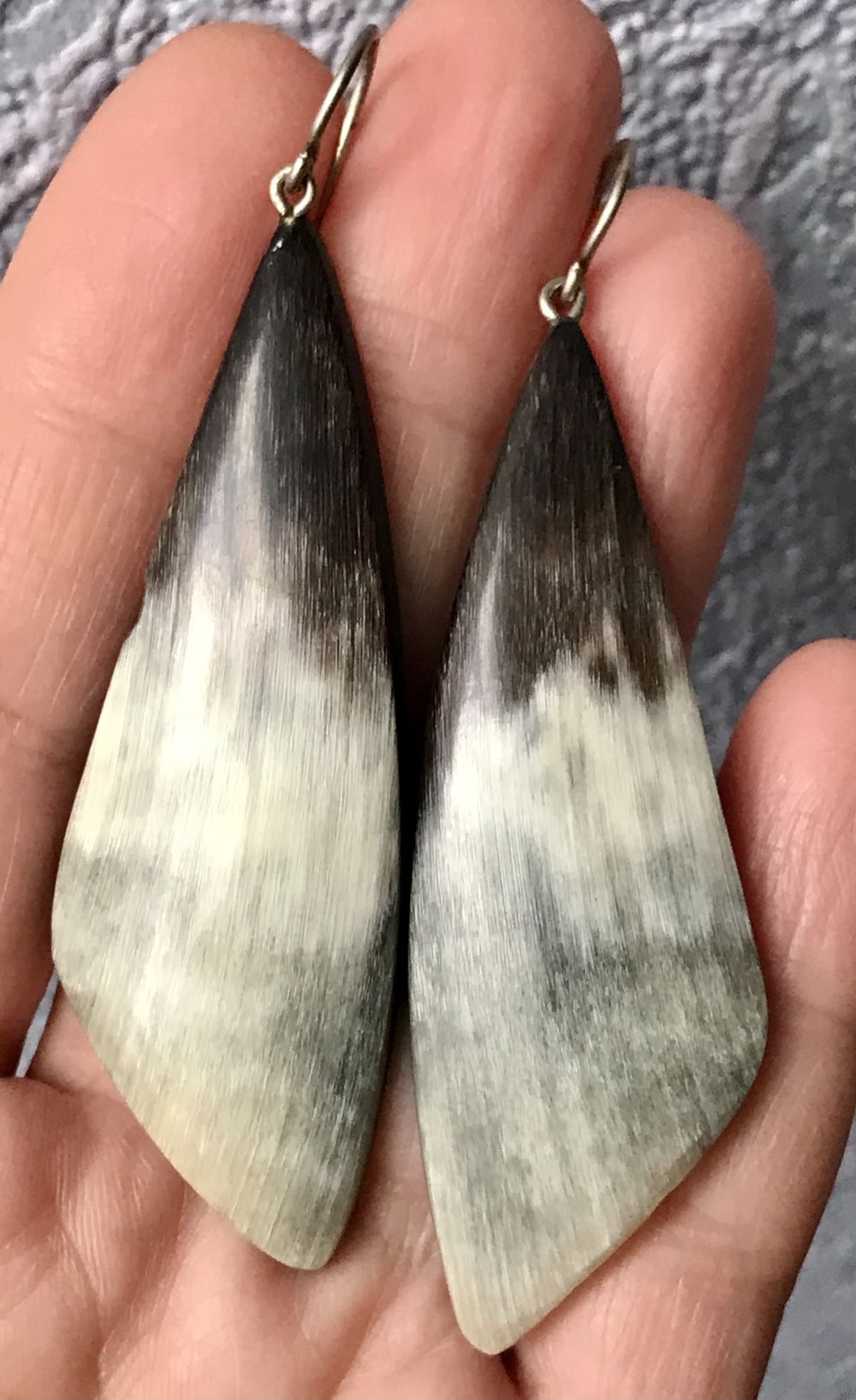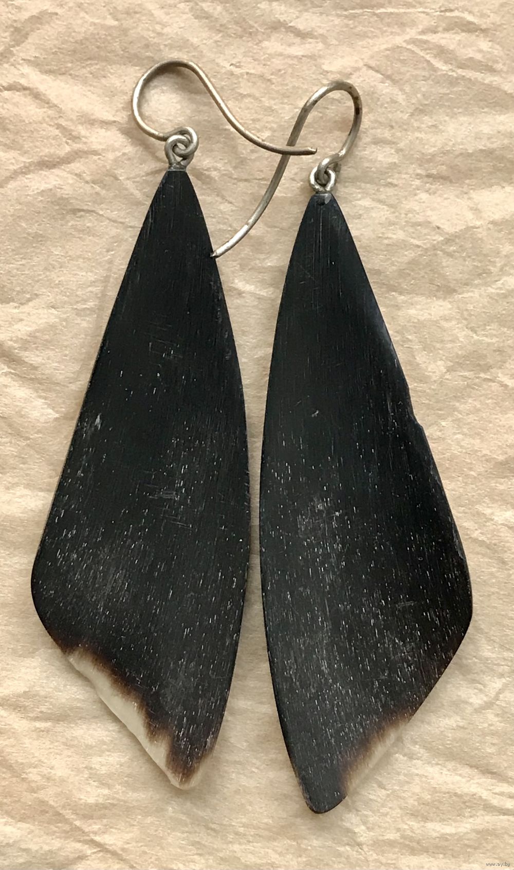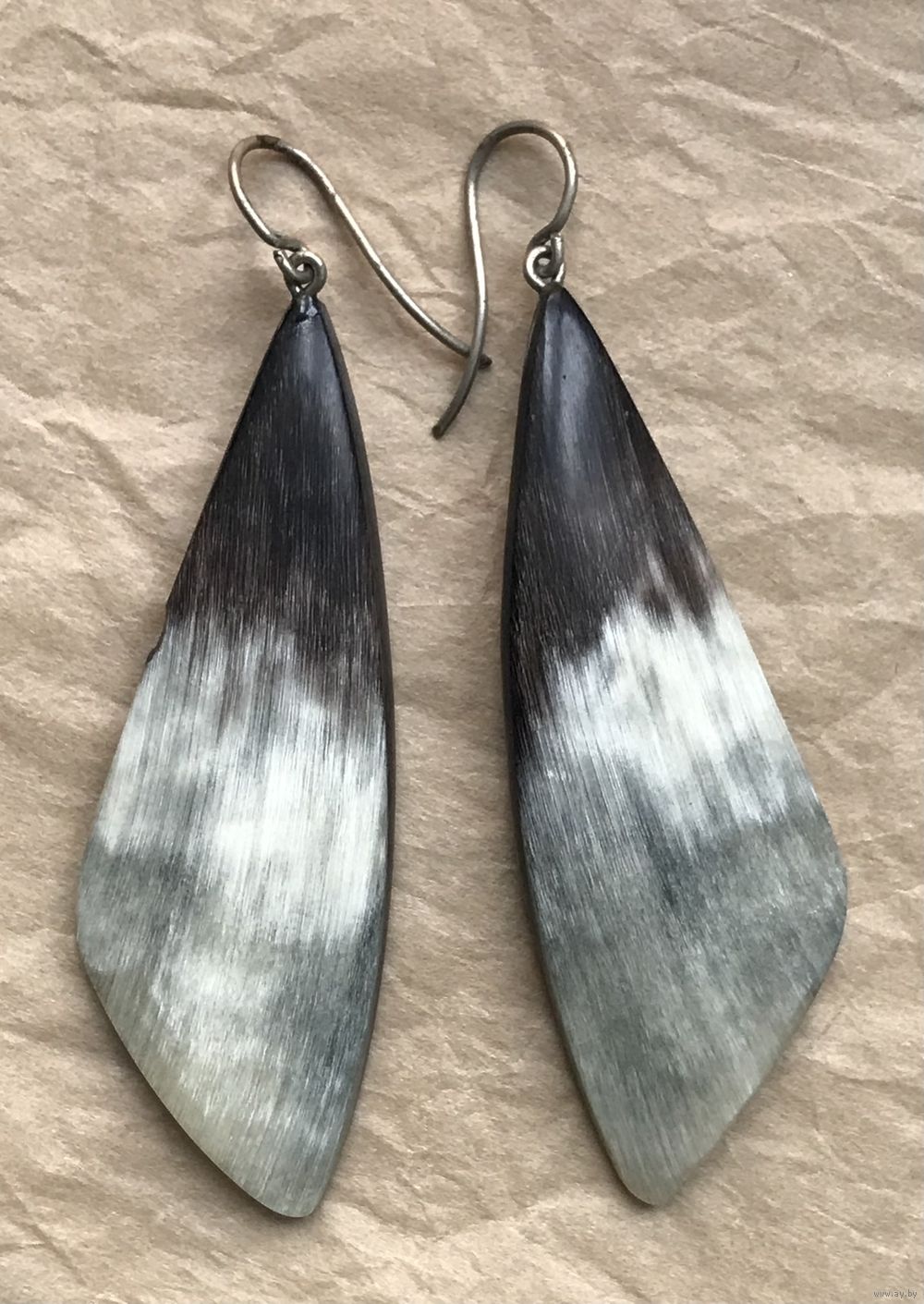 Крупные винтажные серьги с подвесками из рога. Петли сделаны из мельхиора. Высота серьги с петлей 7,5см. На подвесках местами есть небольшие скольчики (учтено в цене).