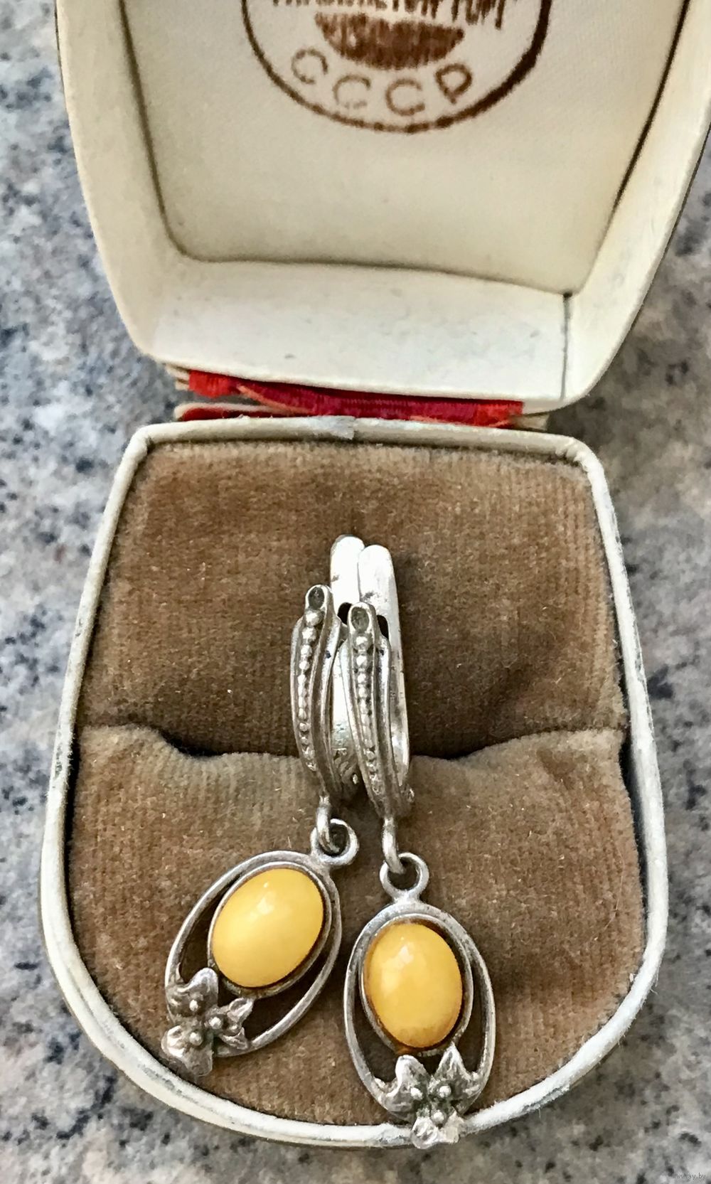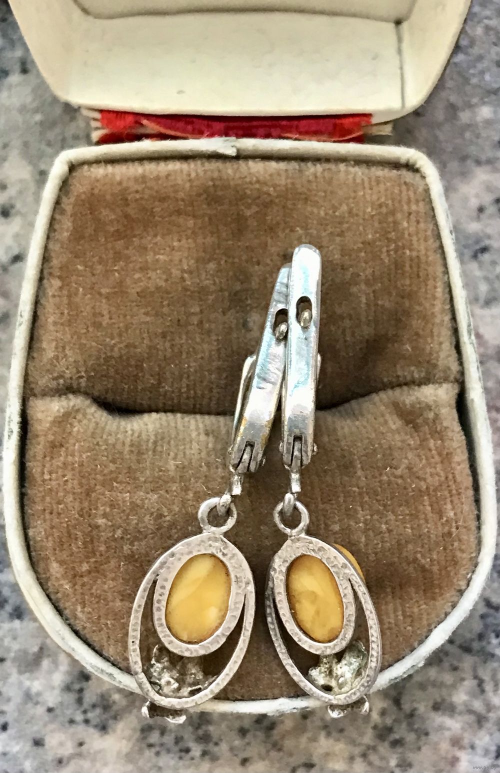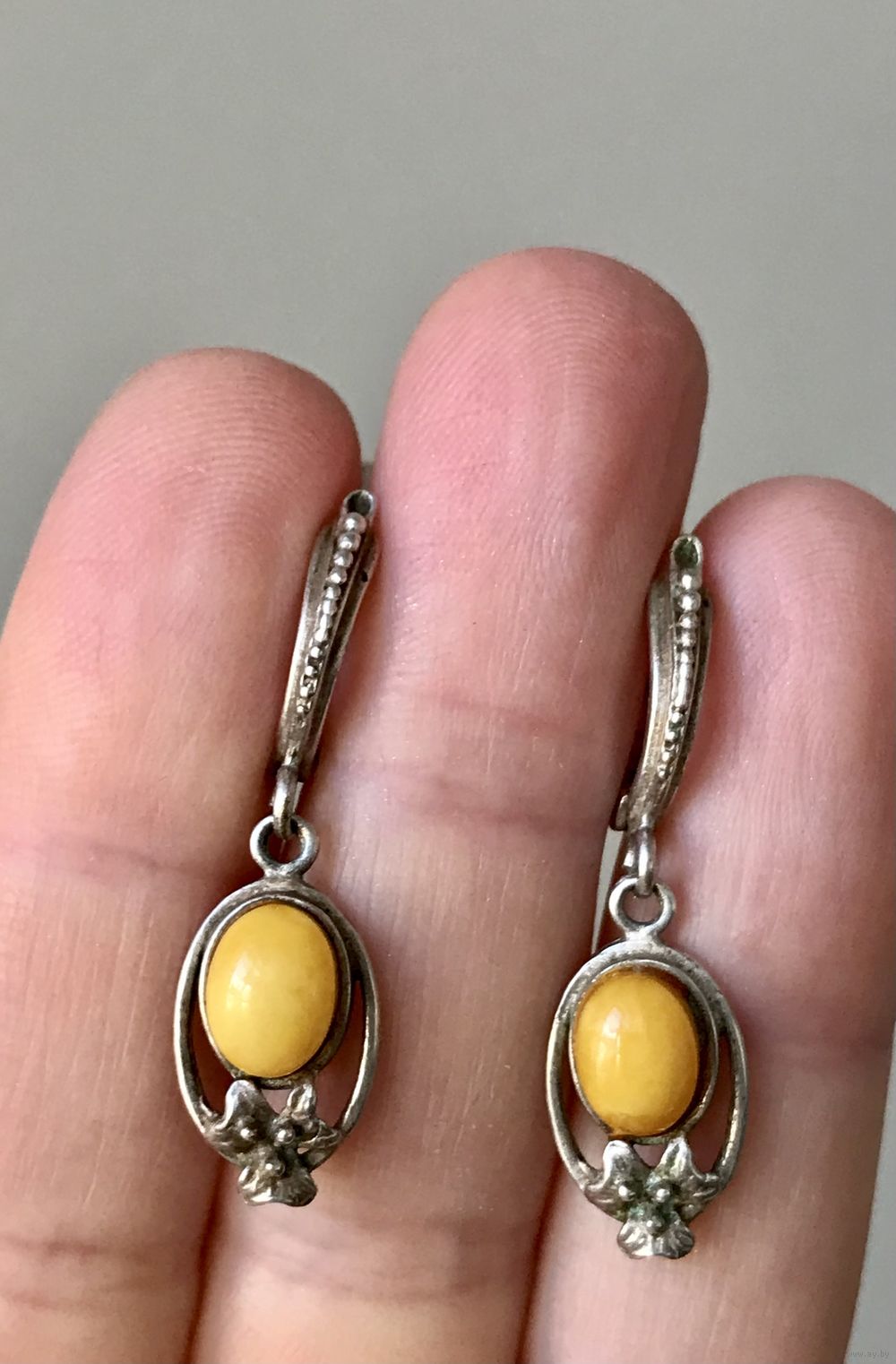 Серьги с основой из металла с серебрением (на металле местами незначительные потёртости) и вставками из янтаря. Высота серьги 3,5см.