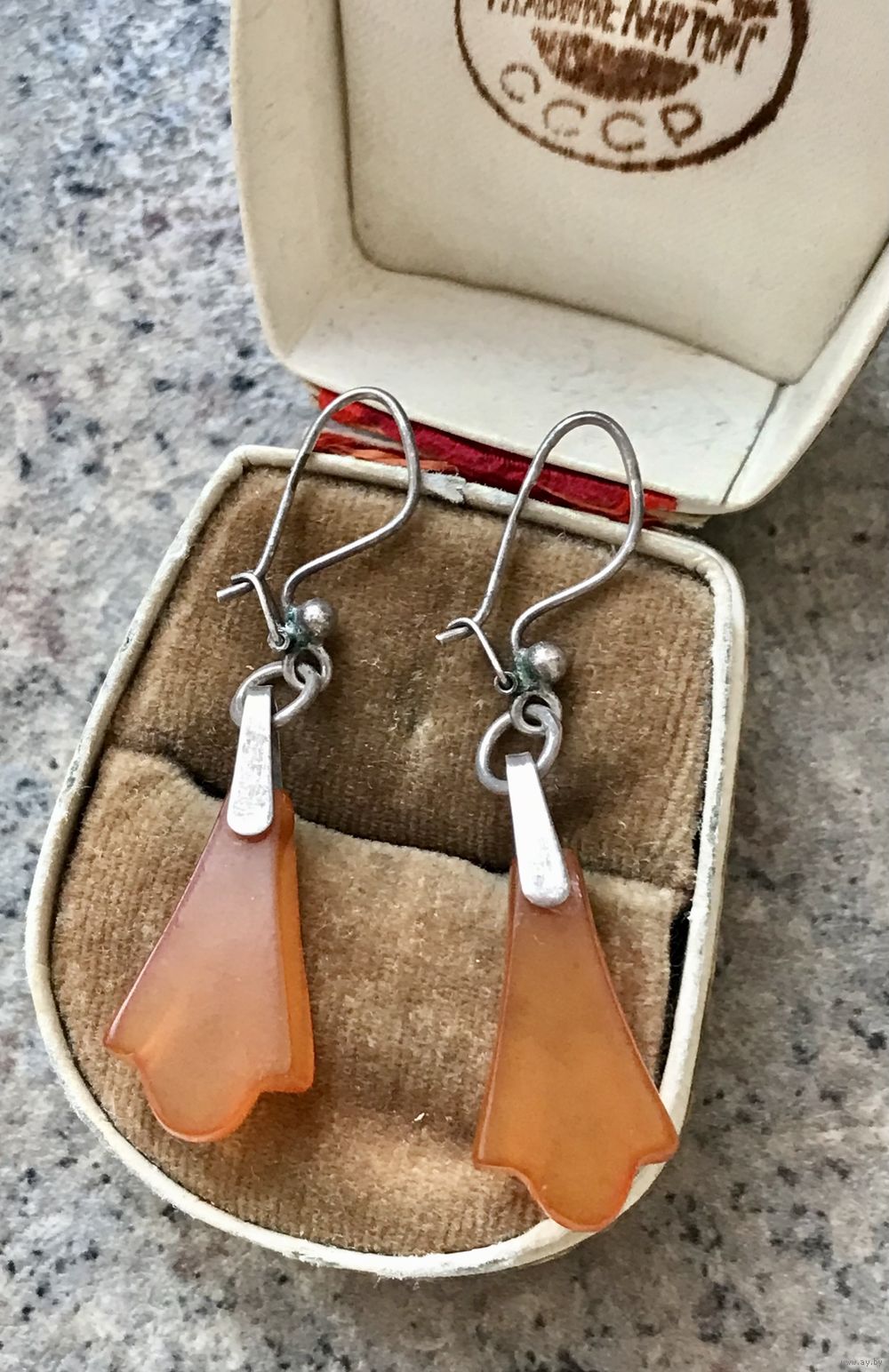 Серьги с основой из серебра 875пр. и подвесок из янтаря. Сделаны в Калининграде в 1987г. Высота серьги 5см., вес пары 3гр. Состояние хорошее.