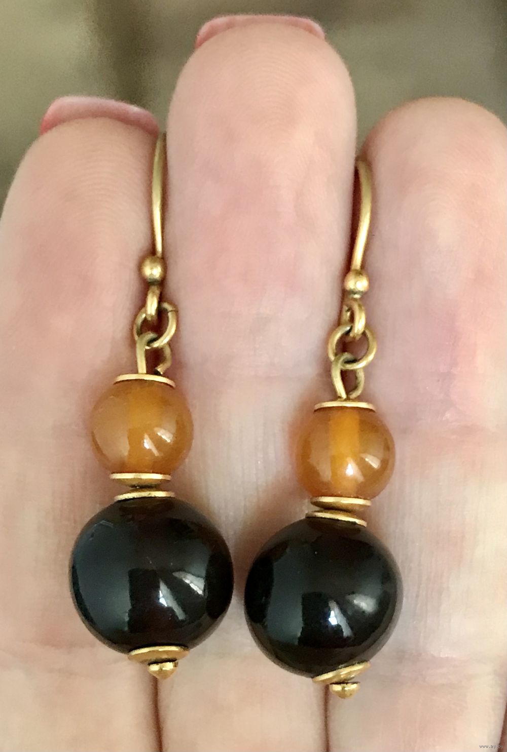 Серьги с основой из латуни и янтаря (пресс). Изготовлены в 1990г. в Калининграде (на крючках стоят отметки :0РЯ). Высота серьги 4,5см. Состояние хорошее.