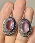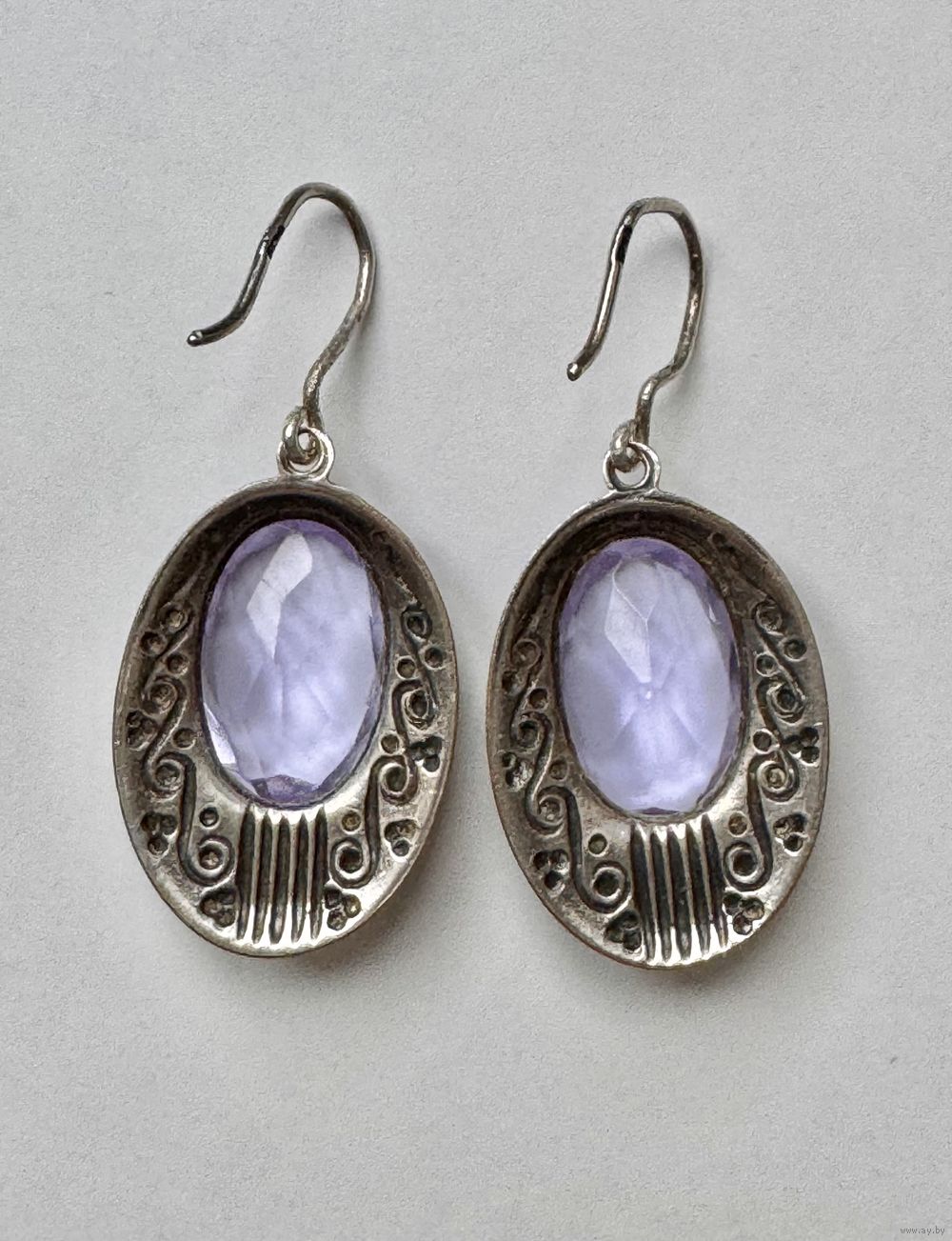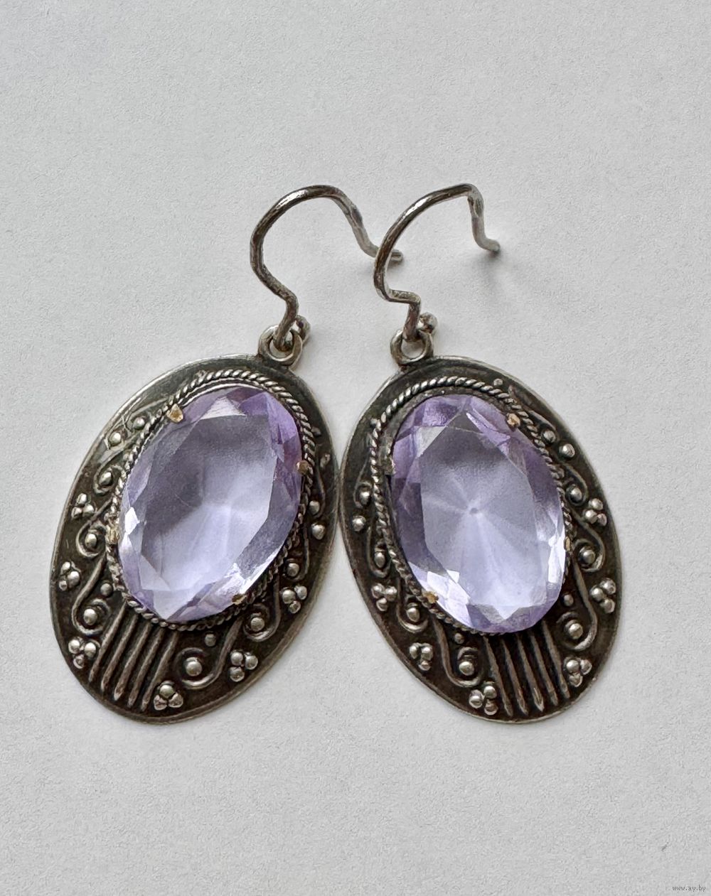 Винтажные серьги из мельхиора и вставок из стекла лавандового цвета. Высота серьги с петлей 4см., размер подвески 2,8х1,8см., размер вставки 1,5х1см. На одной вставке с обратной стороны есть небольшой скольчик.