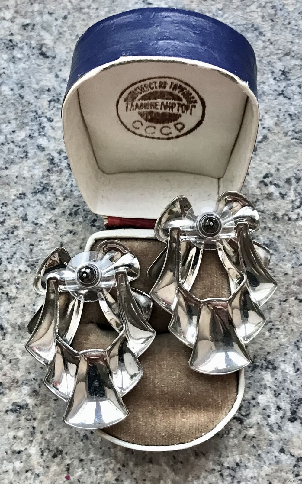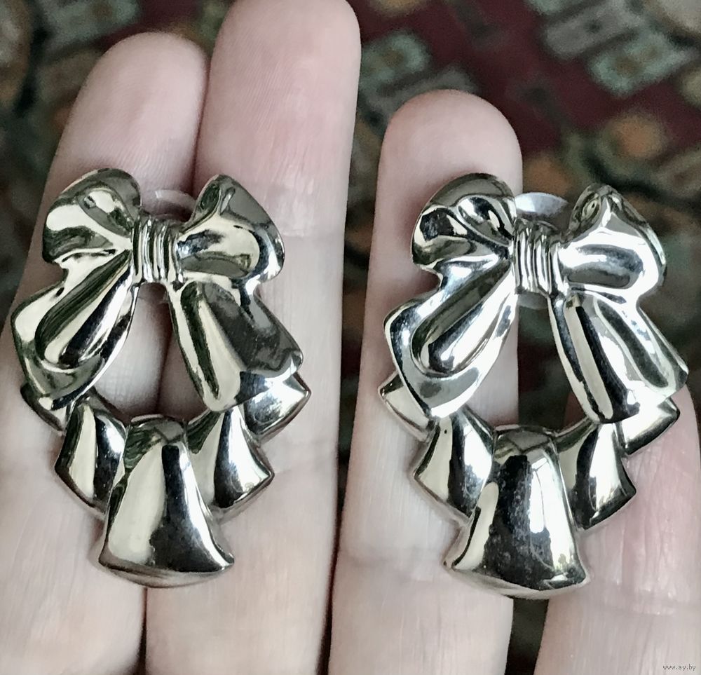 Крупные серьги-пусеты из металла серебристого тона в виде бантов. Размер 4х3см. Состояние хорошее.