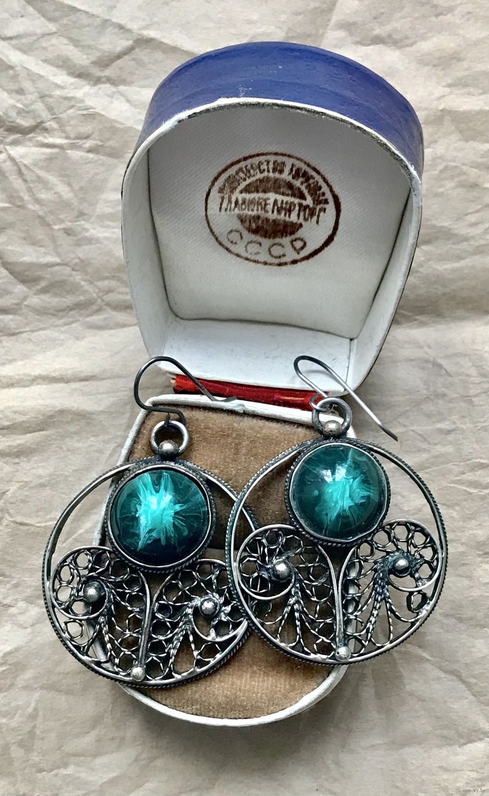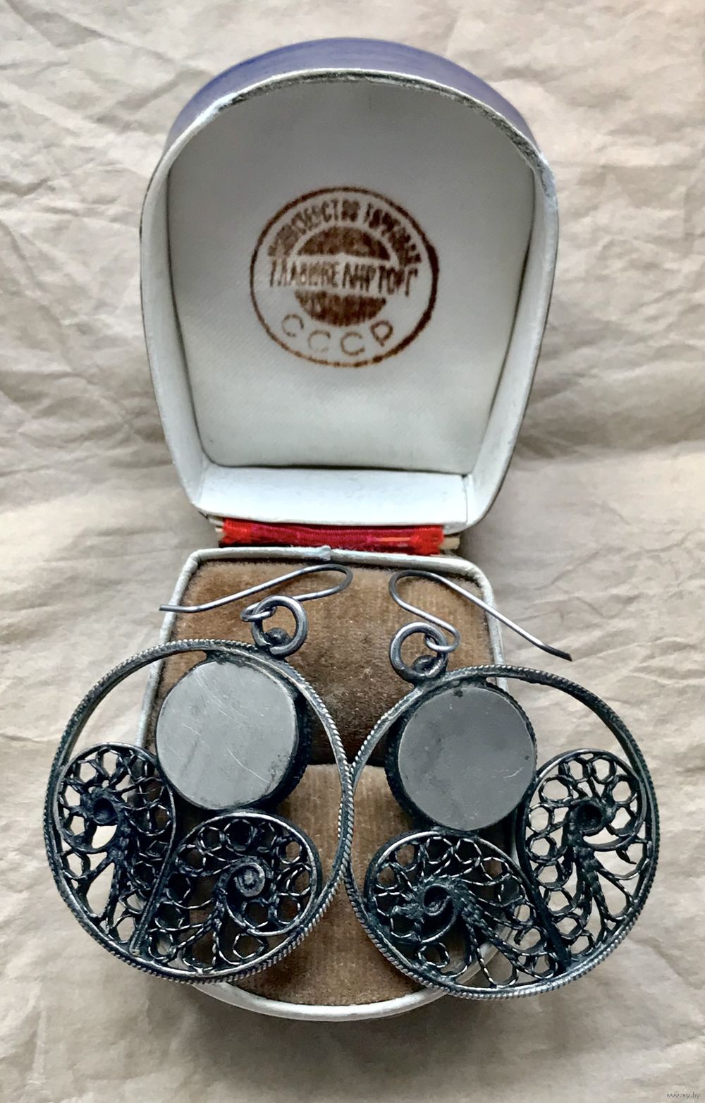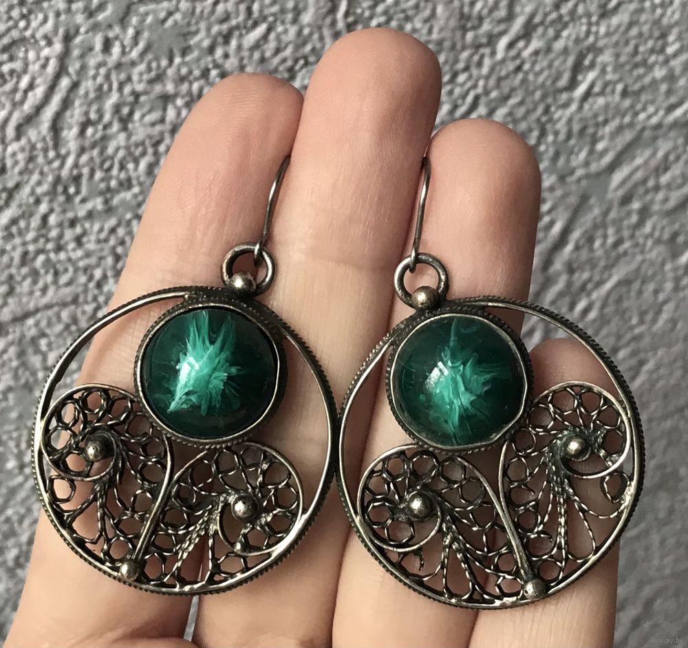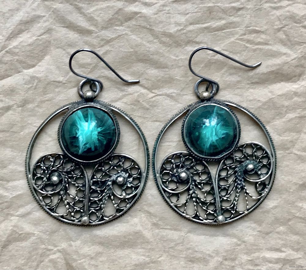 Крупные винтажные серьги с основой из мельхиора, вставки из плотного пластика. Высота серьги 5см., диаметр подвески 3,3см., диаметр вставки 1,3см.