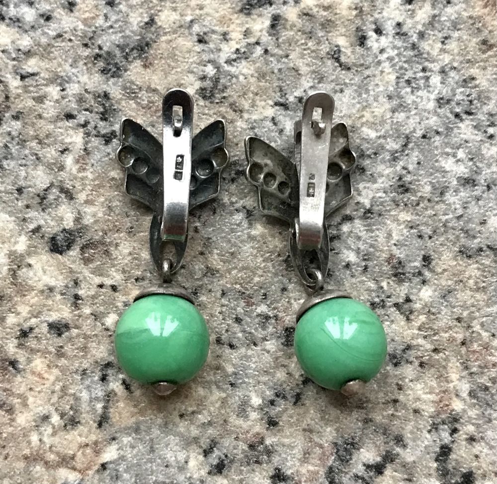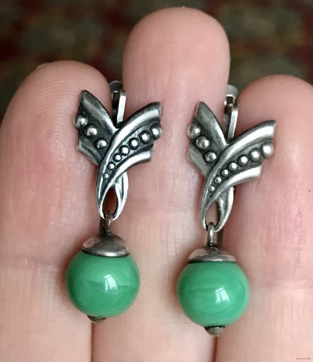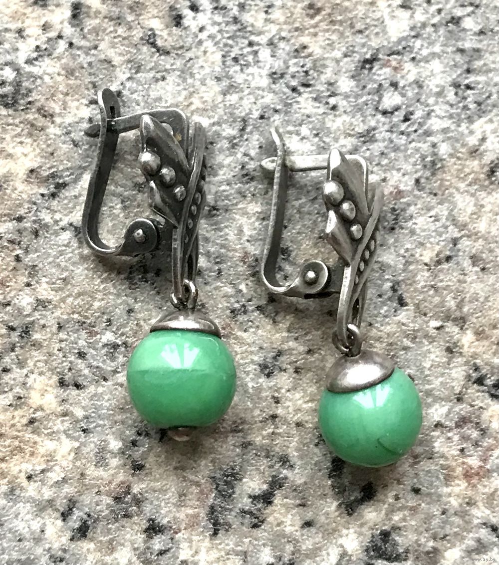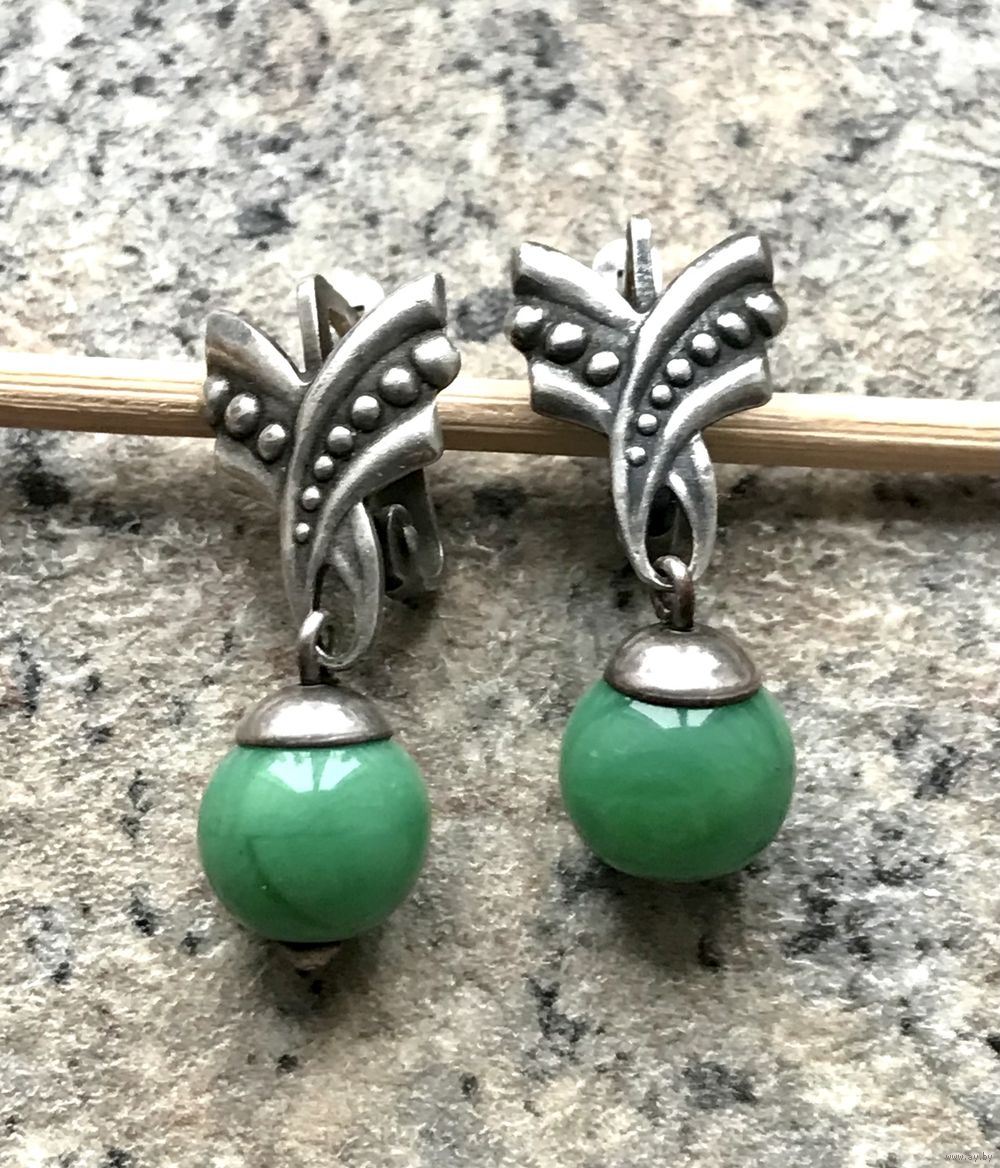 Винтажные серьги с основой из мельхиора и подвесок из худ.стекла. Высота серьги 2,7см., шарик диаметром ~0,8см. Состояние хорошее.