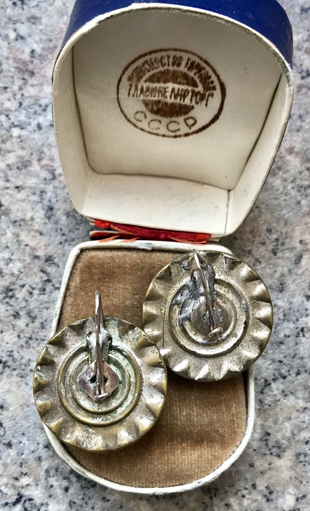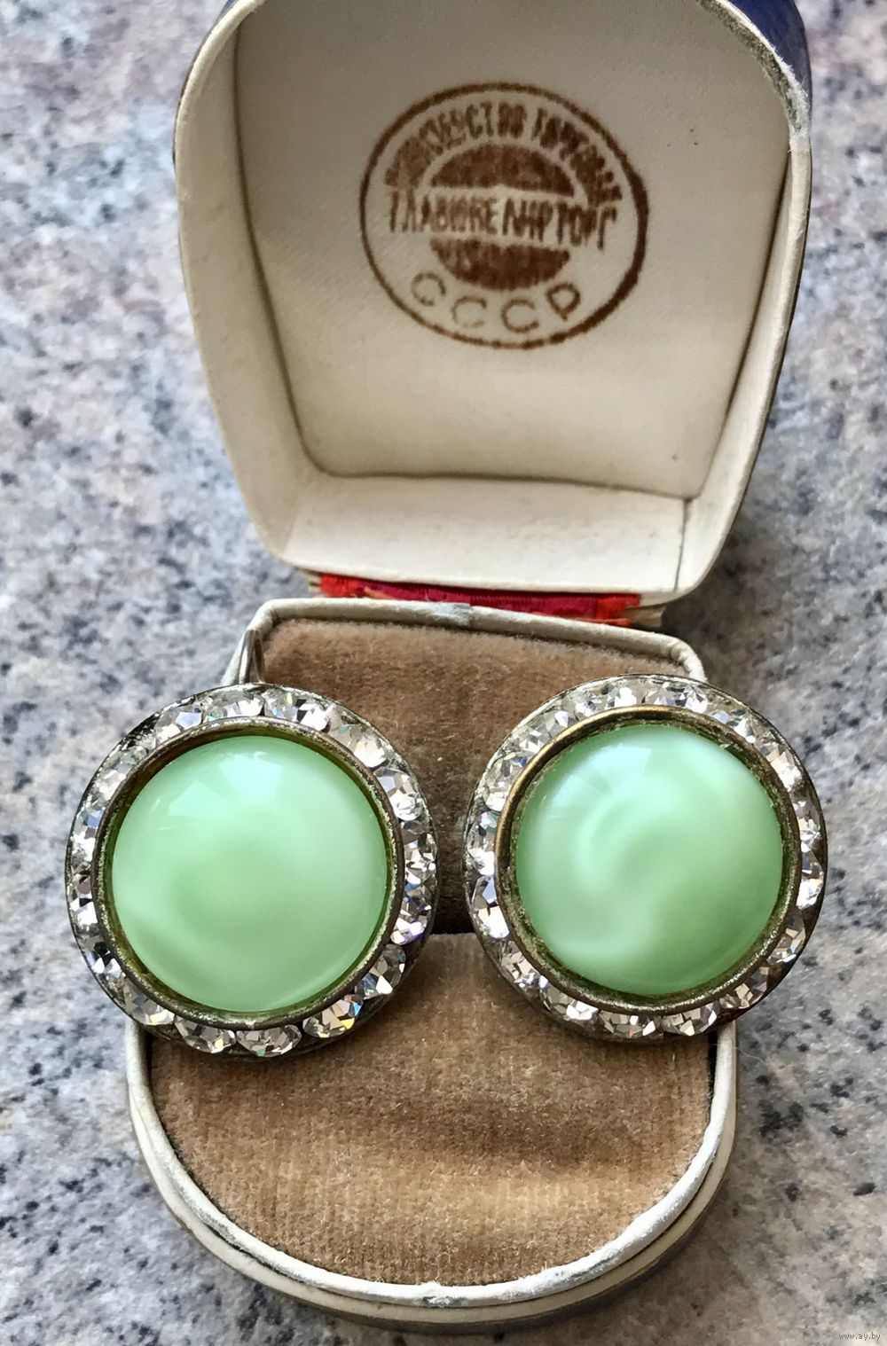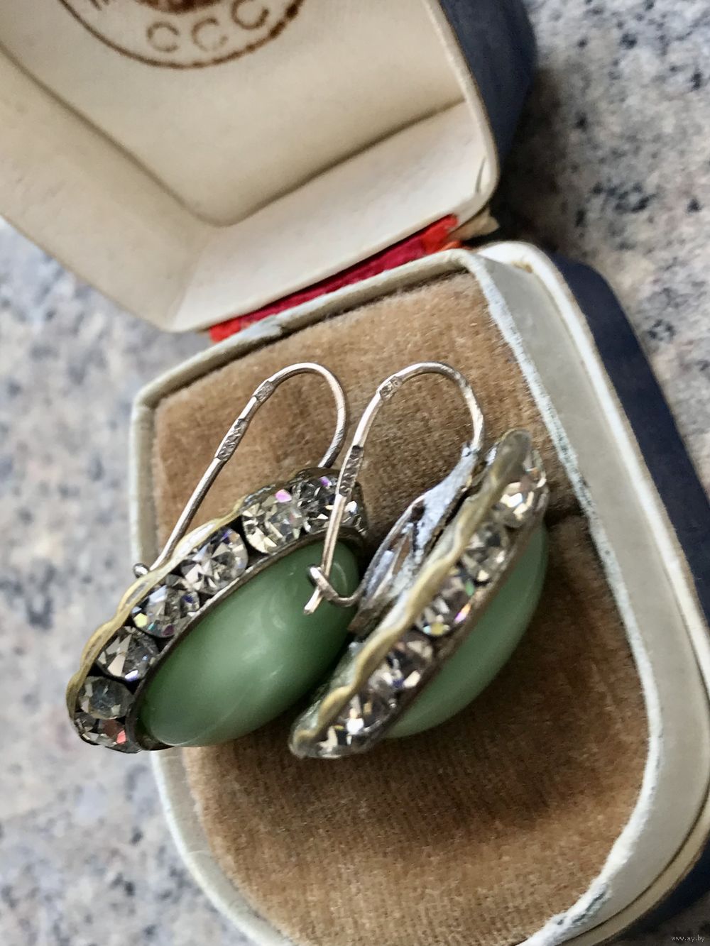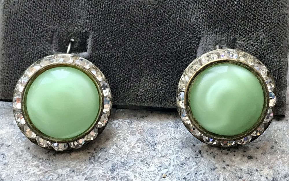 Крупные винтажные серьги с основой из латуни (имеются потёртости на металле) и вставок из художественного стекла и кристаллов. Была произведена замена швенз на серебряные с позолотой (стоит отметка 875). Диаметр серьги 2,5см., диаметр центральной вставки 1,8см.