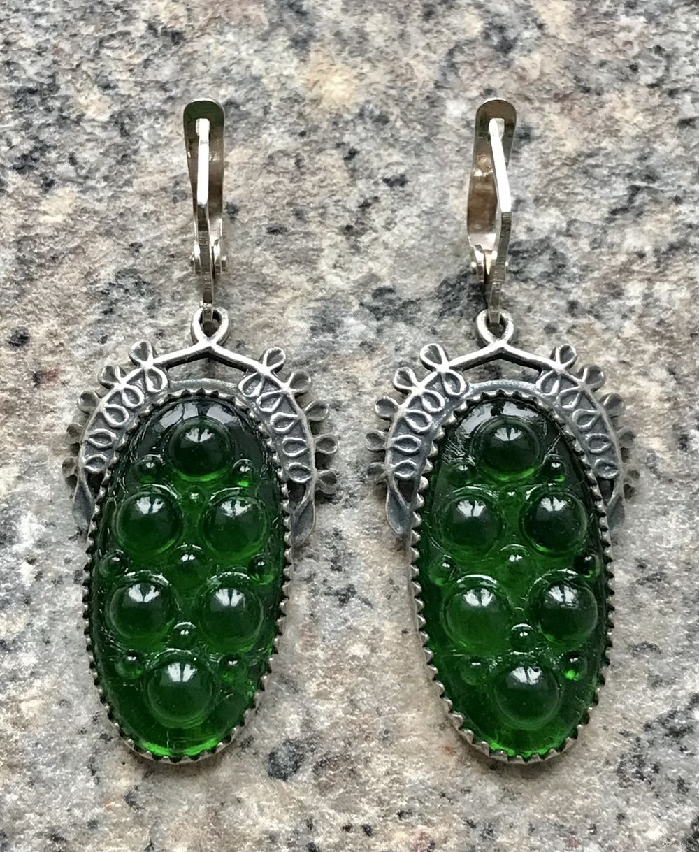 Винтажные крупные серьги с основой из мельхиора (клеймо) и вставками из цветного стекла. Высота серьги 4,5см, размер вставки 2,3х1,3см. Состояние хорошее.