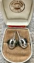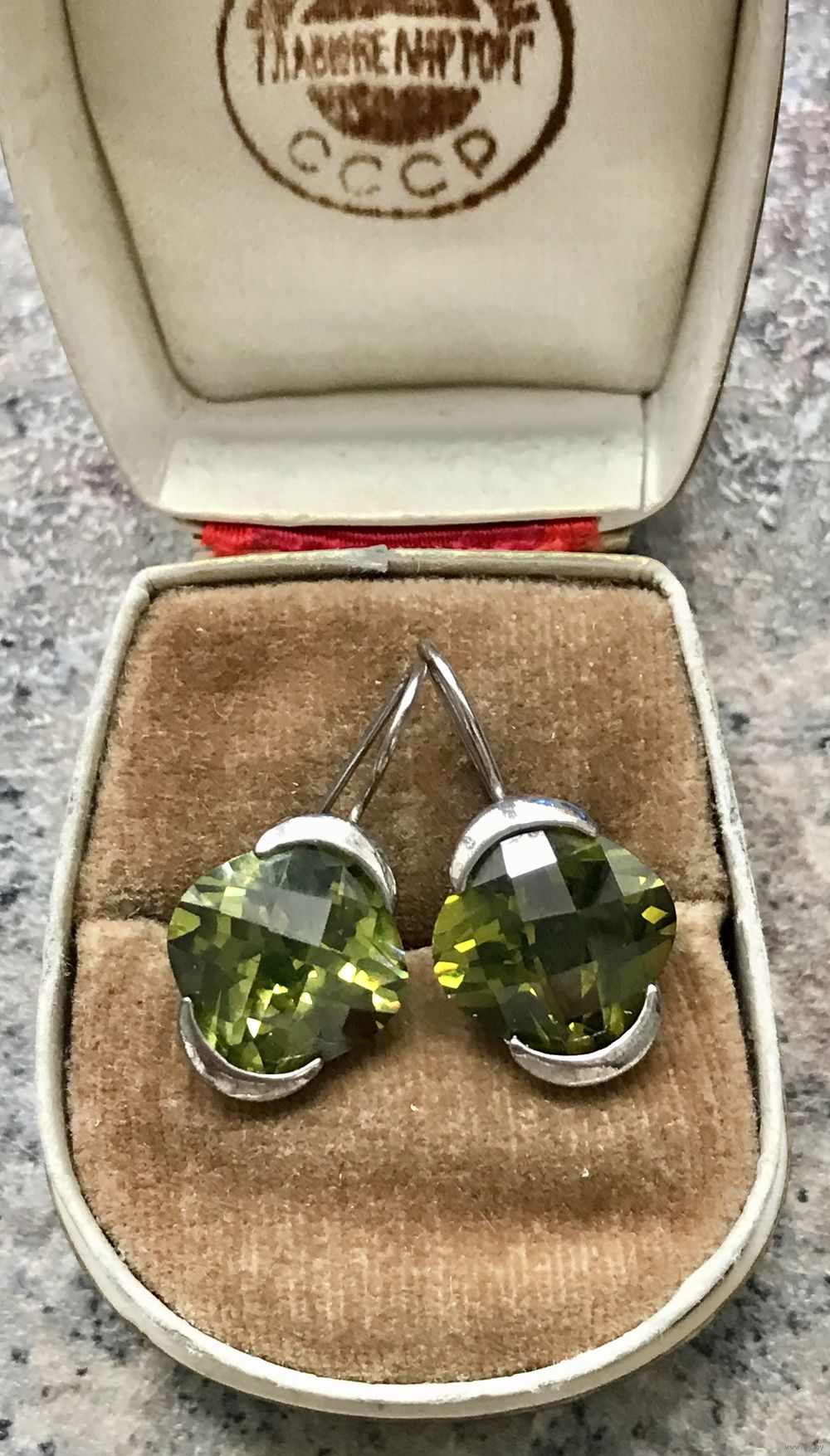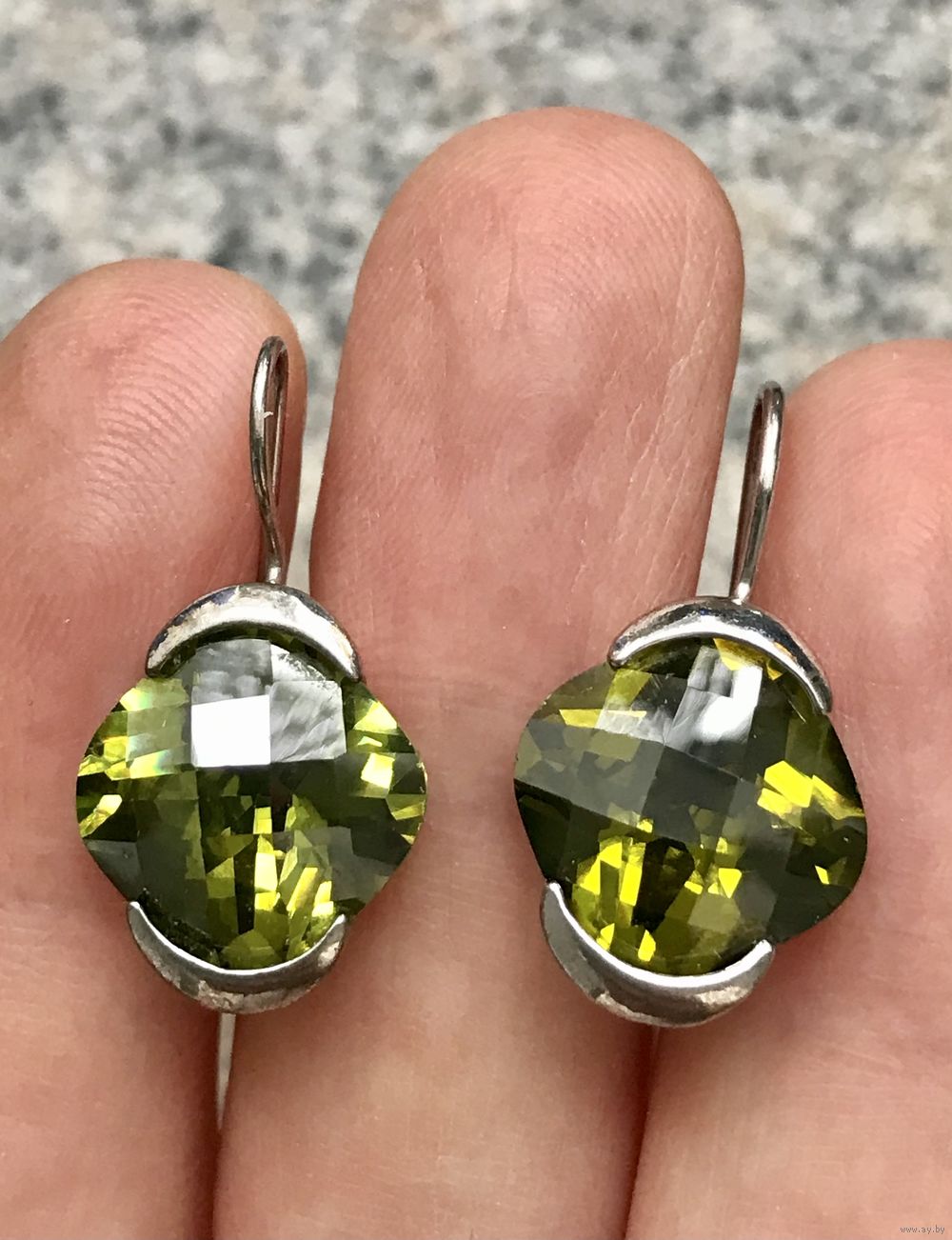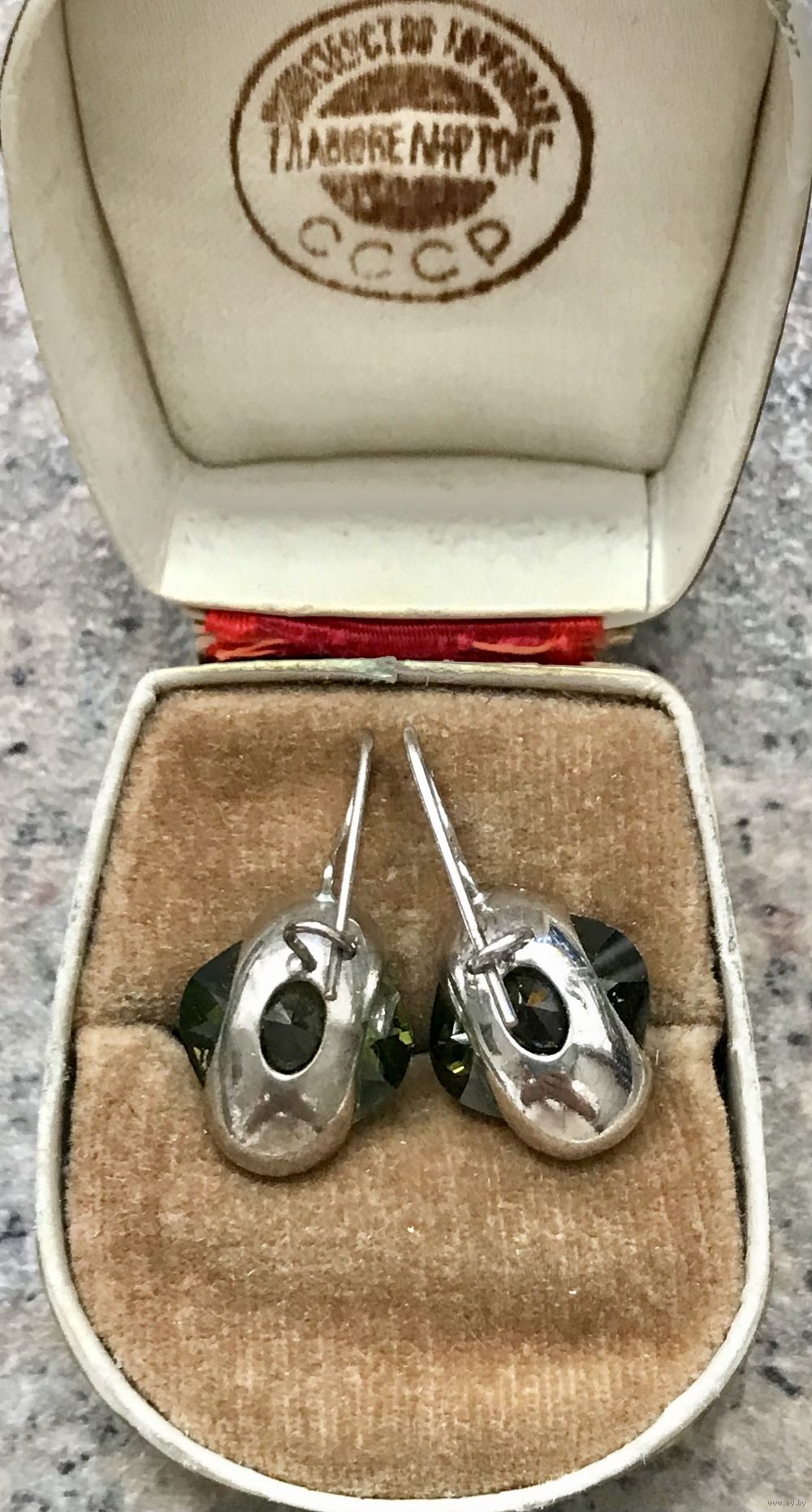 Серьги с основой из металла с серебрением, вставка кристалл насыщенного оливкового цвета. Высота серьги с петлей 2,5см., размер вставки 1,3х1,3см. Состояние хорошее.