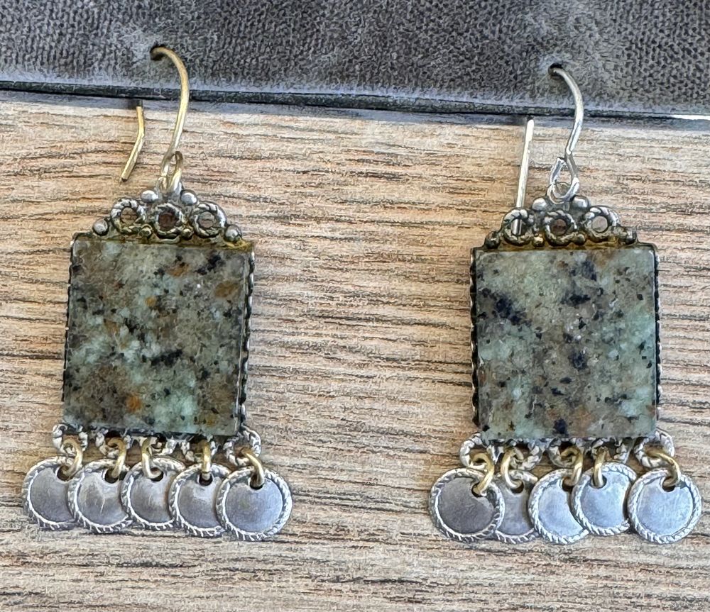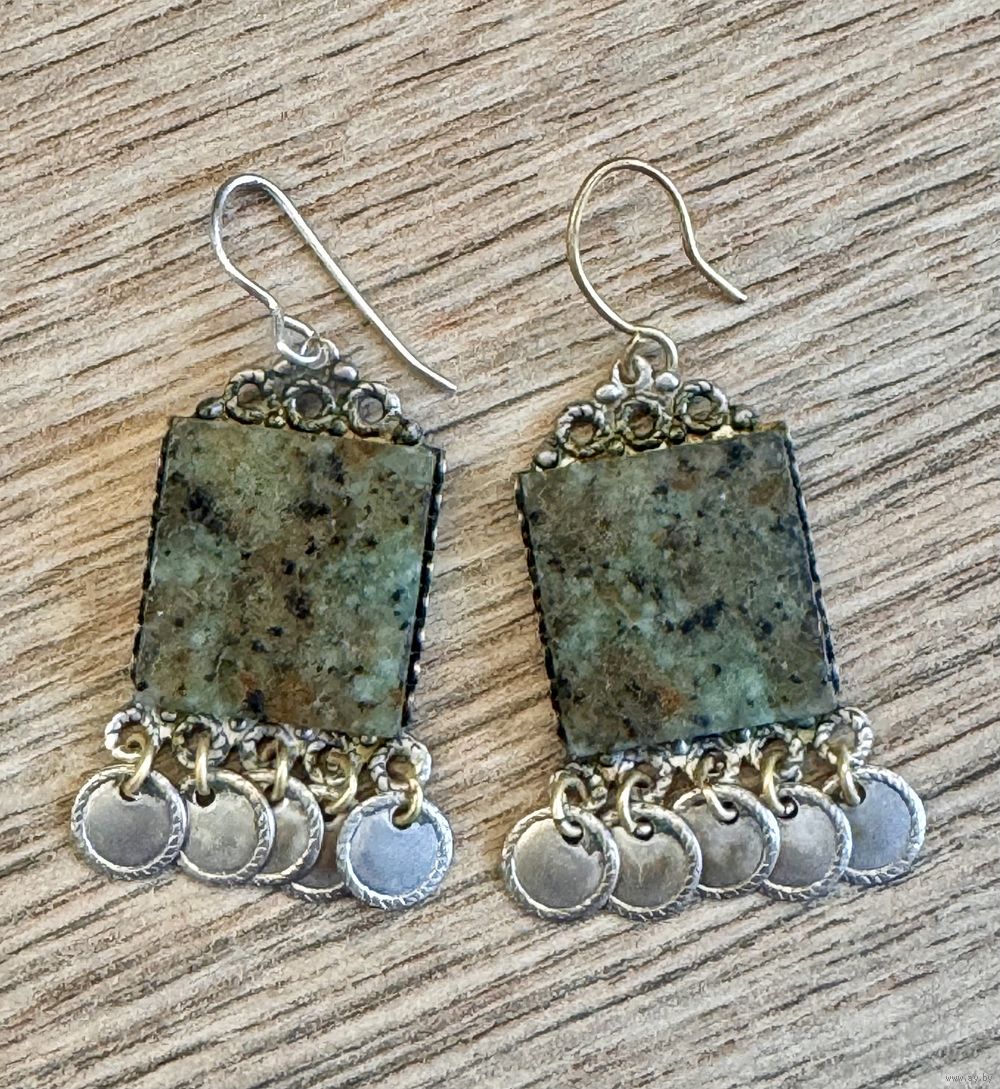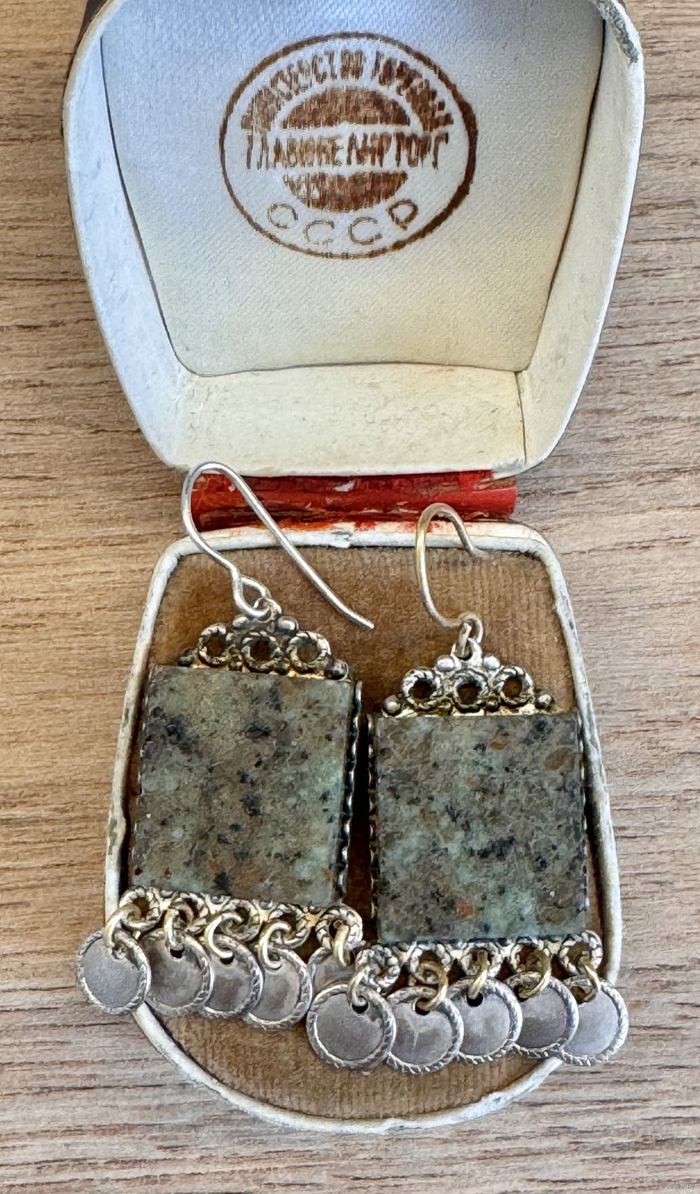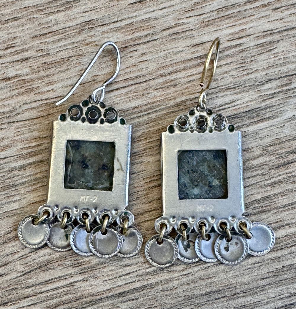 Винтажные серьги с основой из мельхиора с серебрением, на лицевой стороне вставки из камня (яшма).1970-е гг. Мосгалантерея (с обратной стороны на каждой стоит отметка МГ-2). Высота серьги с висюльками 4,5см. В серьгах крючки разного цвета.