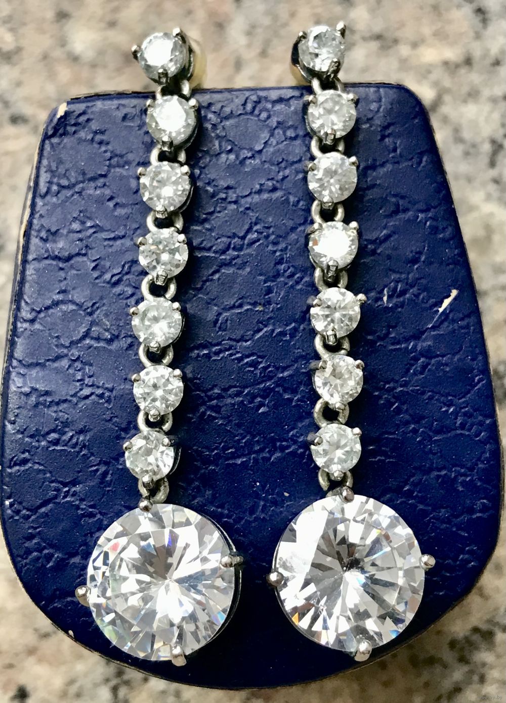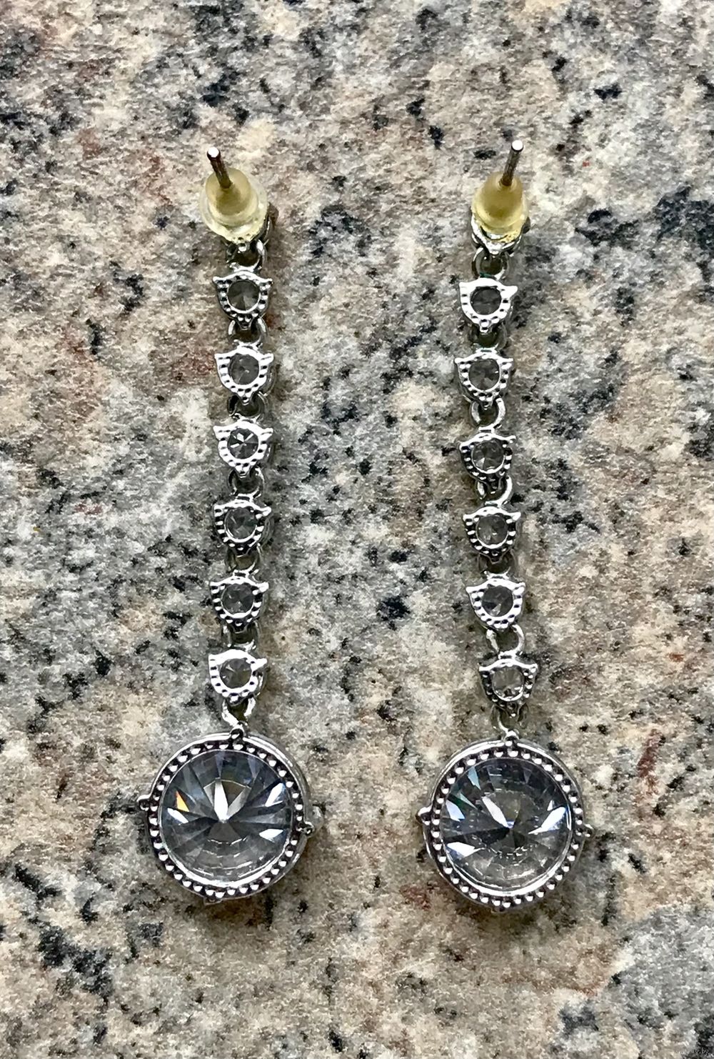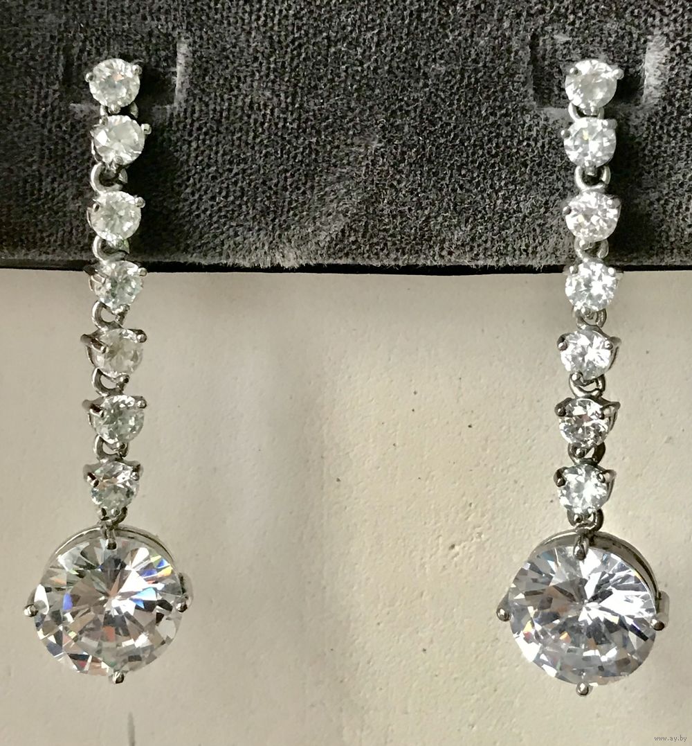 Серьги из бижутерного сплава серебристого тона, вставки -кристаллы. Высота серьги 5см., диаметр нижней подвески 1,6см. Состояние хорошее.