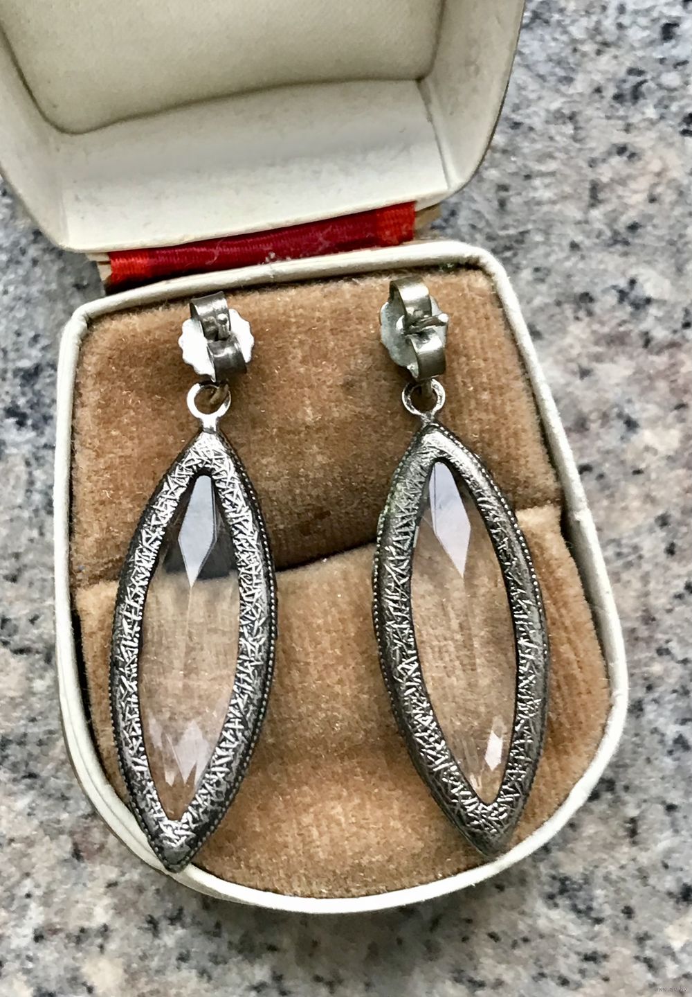 Винтажные (1980-е гг.) чешские серьги-пусеты с основой из бижутерного сплава и вставок из стекла и кристаллов. Высота серьги 4см. Имеются незначительные потёртости на металле, общее состояние хорошее.