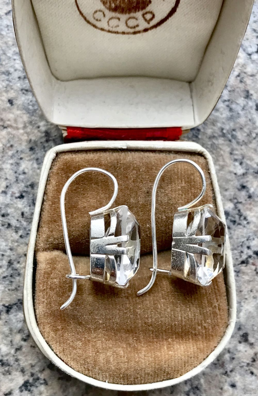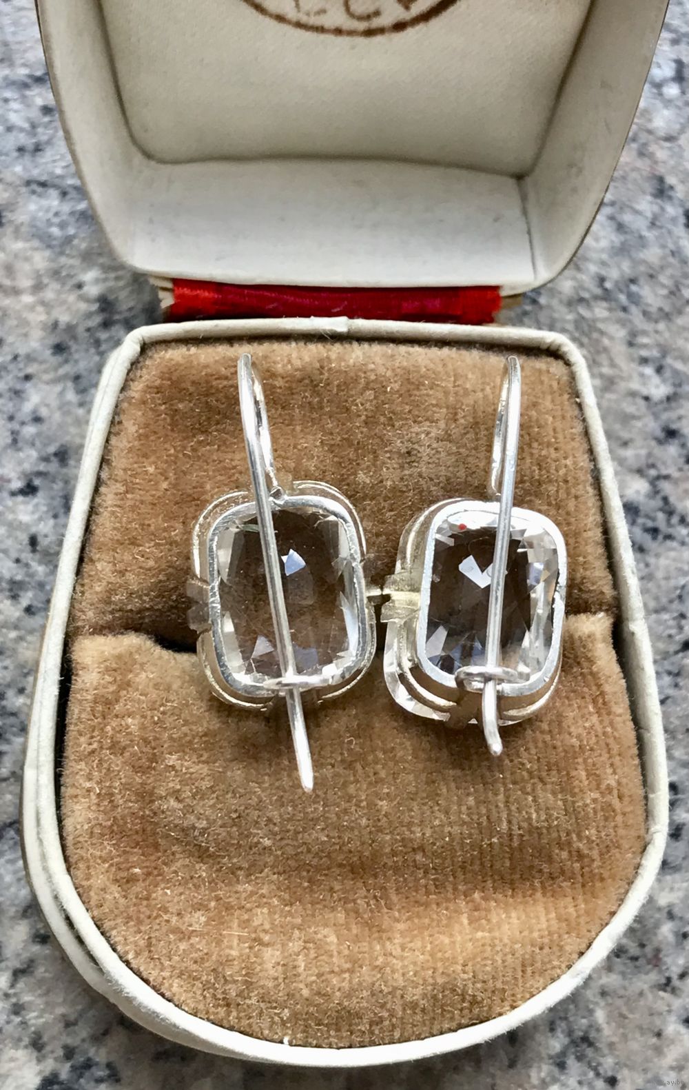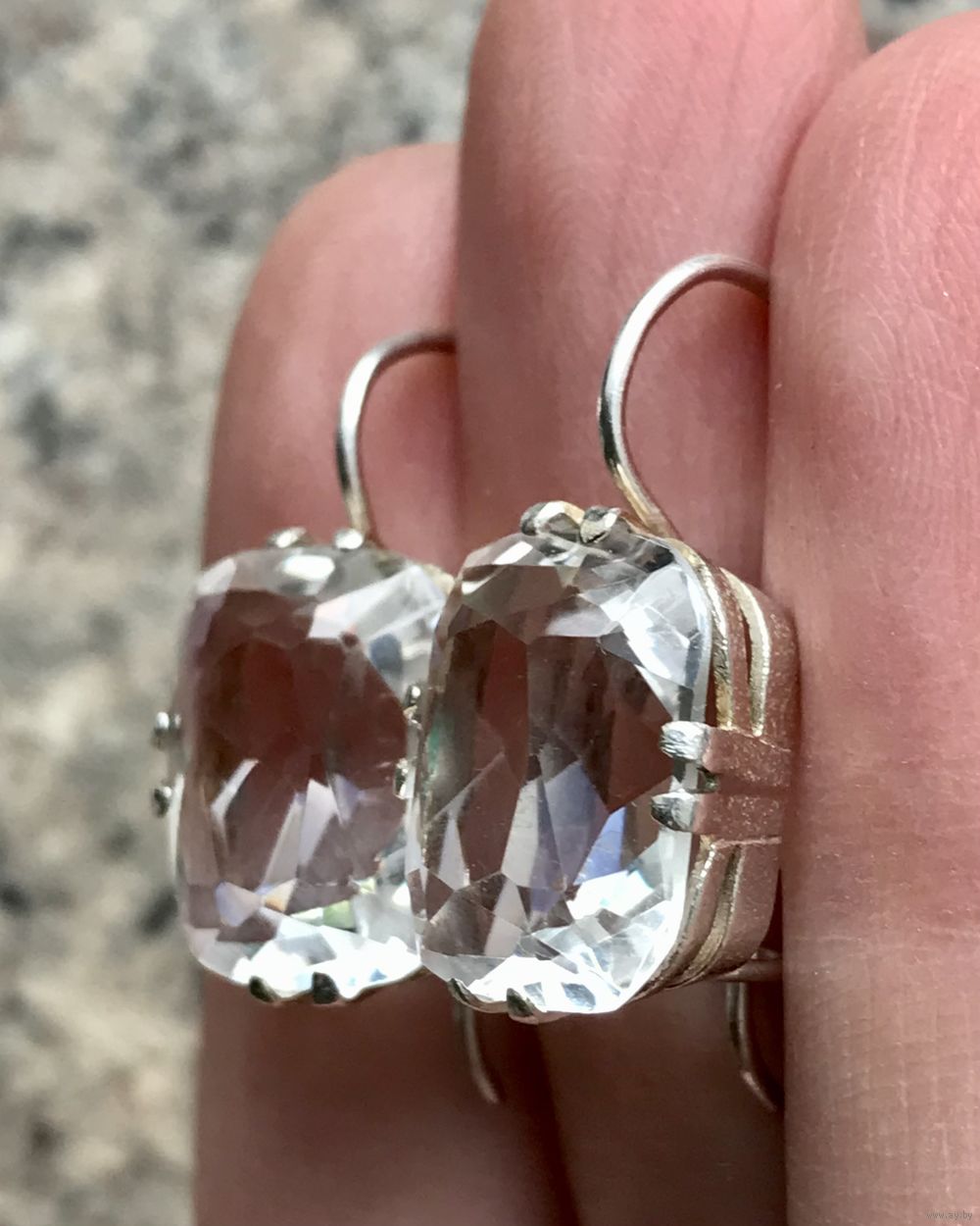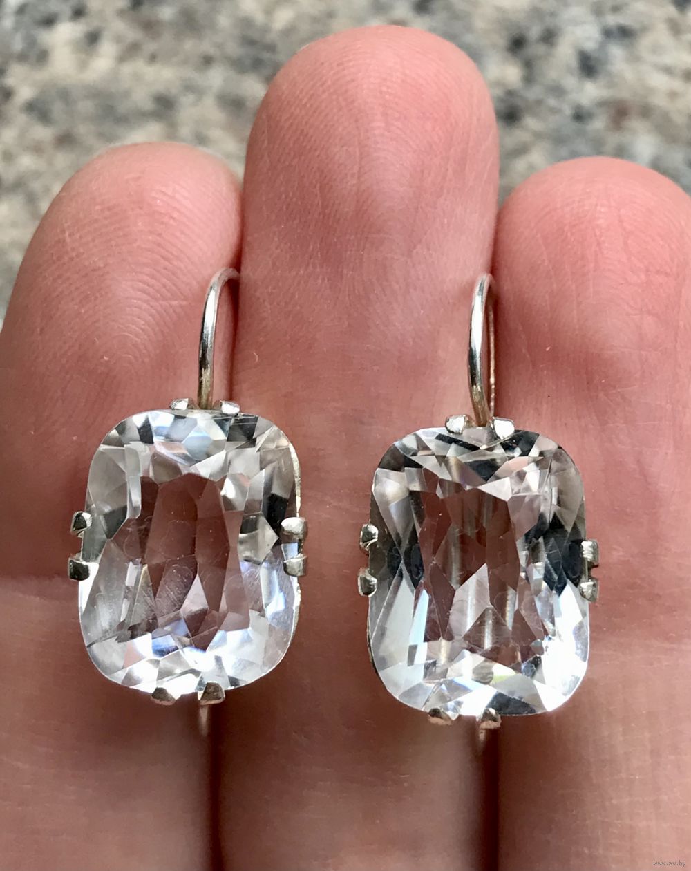 Серьги, сделанные из винтажных серебряных запонок с горным хрусталём (Русские самоцветы). Без сохранения позолоты. Высота серьги 3,5см., размер вставки 1,9х1см. Вставки без сколов и трещин.