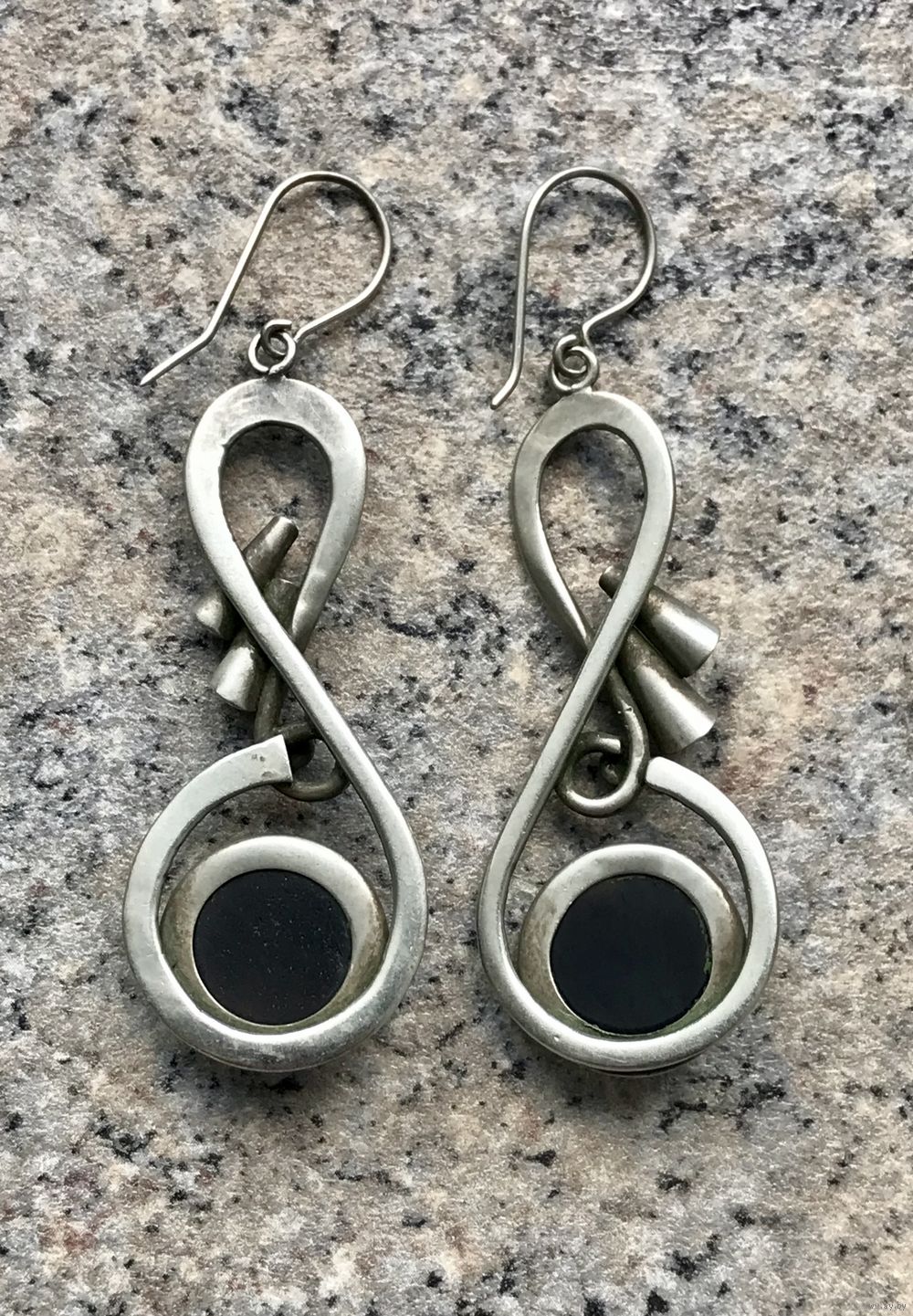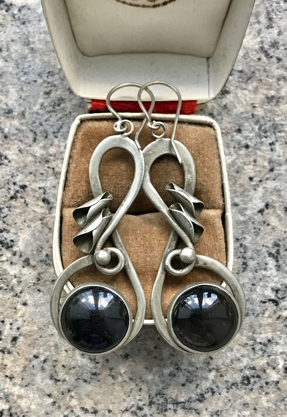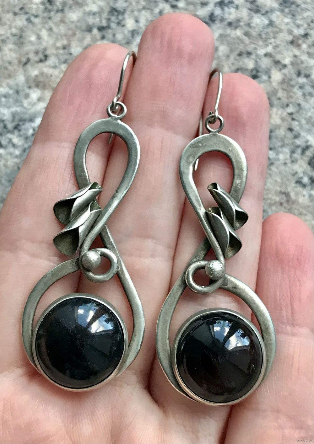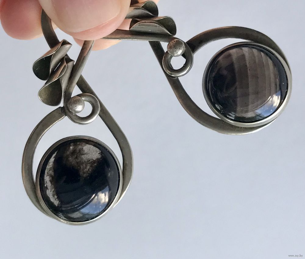 Винтажные крупные серьги с основой из мельхиора и вставок из агата. Рисунок в камнях отличается. Высота серьги 6,5см., диаметр вставки 1,5см. Ручная работа. Состояние хорошее.