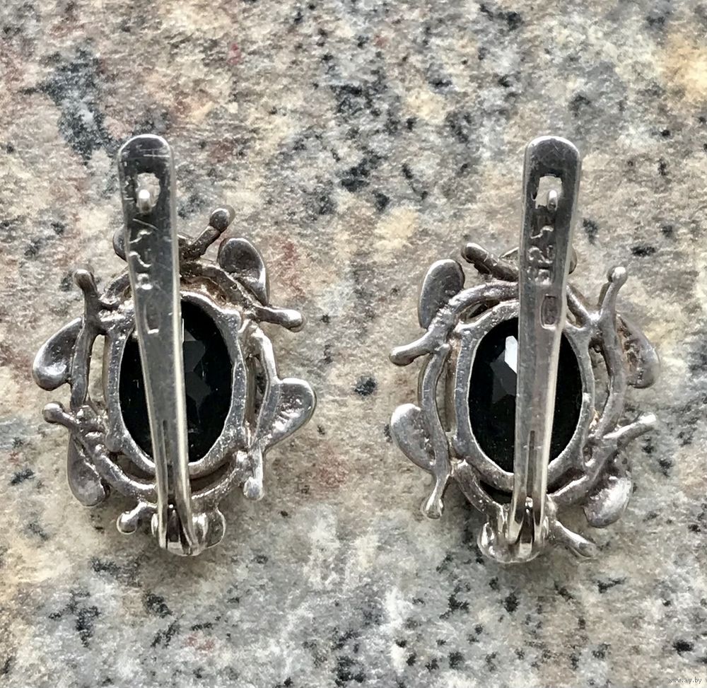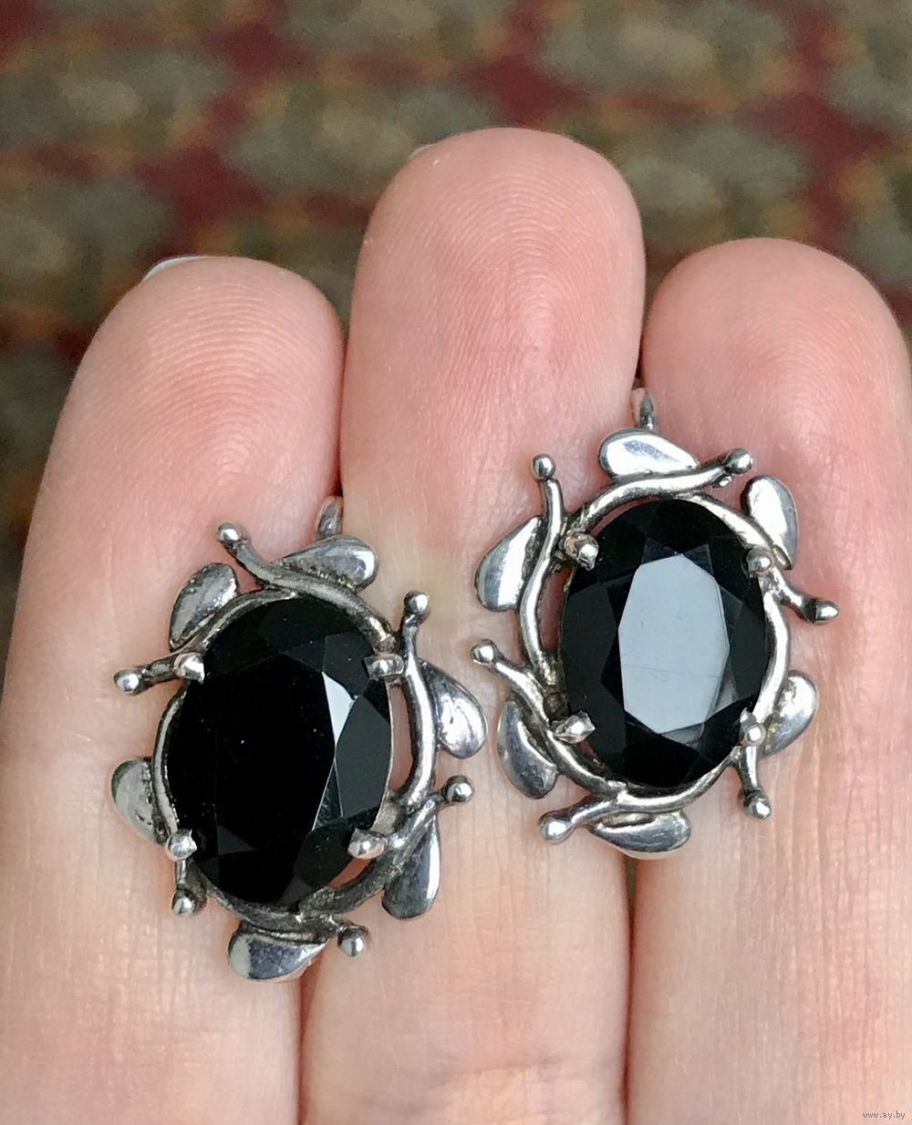 Крупные, эффектные серьги из серебра 925пр.(стоят отметки 925 и пробирное клеймо с зубром) и вставок чёрного цвета. Высота серьги 2,5см., размер вставки 1,3х1см. Вес 9,43гр. Состояние хорошее.