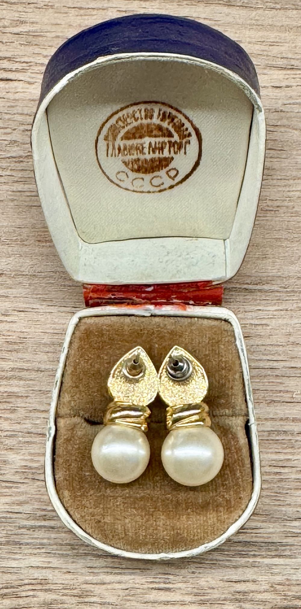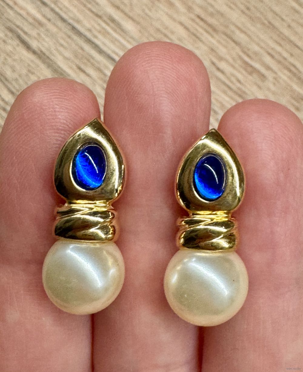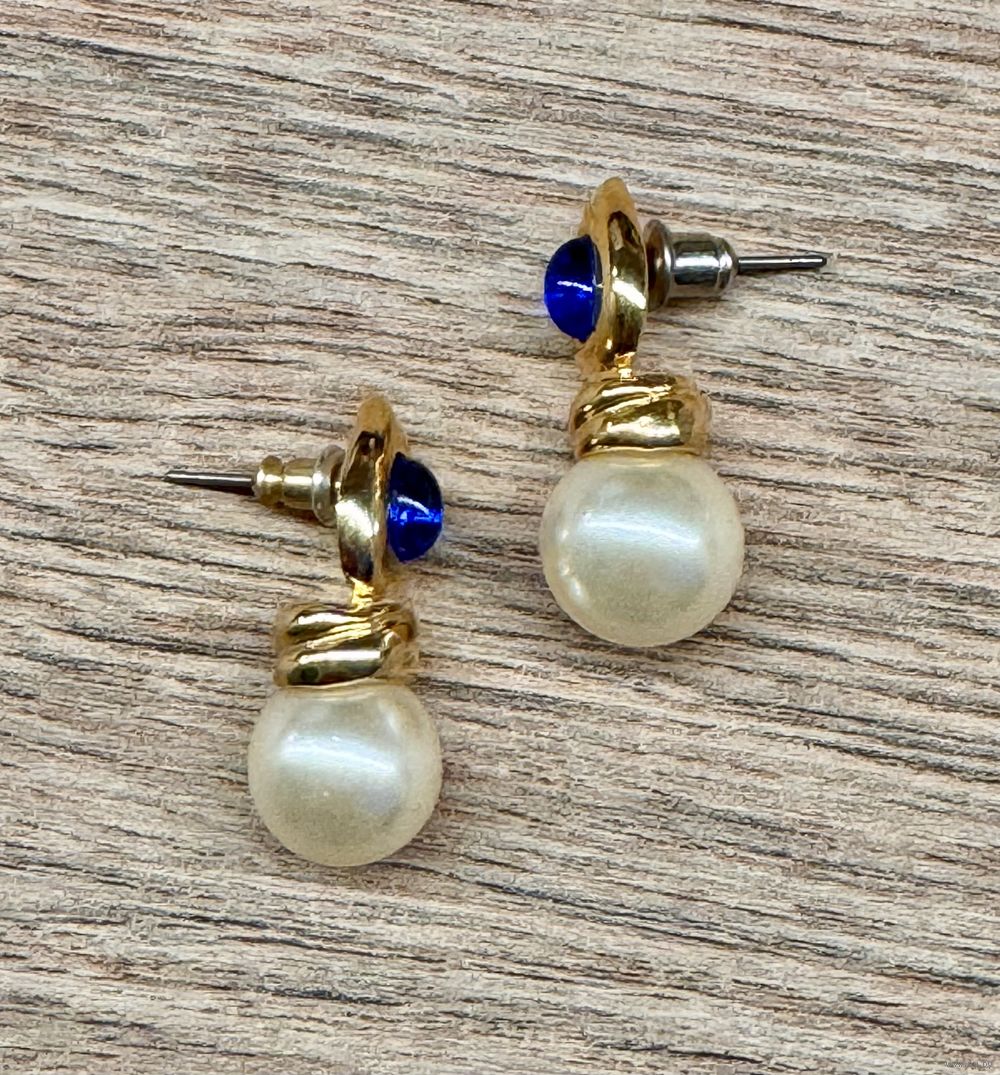 Винтажные серьги-пусеты с основой из металла золотого тона, лицевая сторона украшена вставкой из люцита синего цвета, подвеска из бусины (имитация жемчуга). Высота серьги 2,7см. Состояние хорошее.