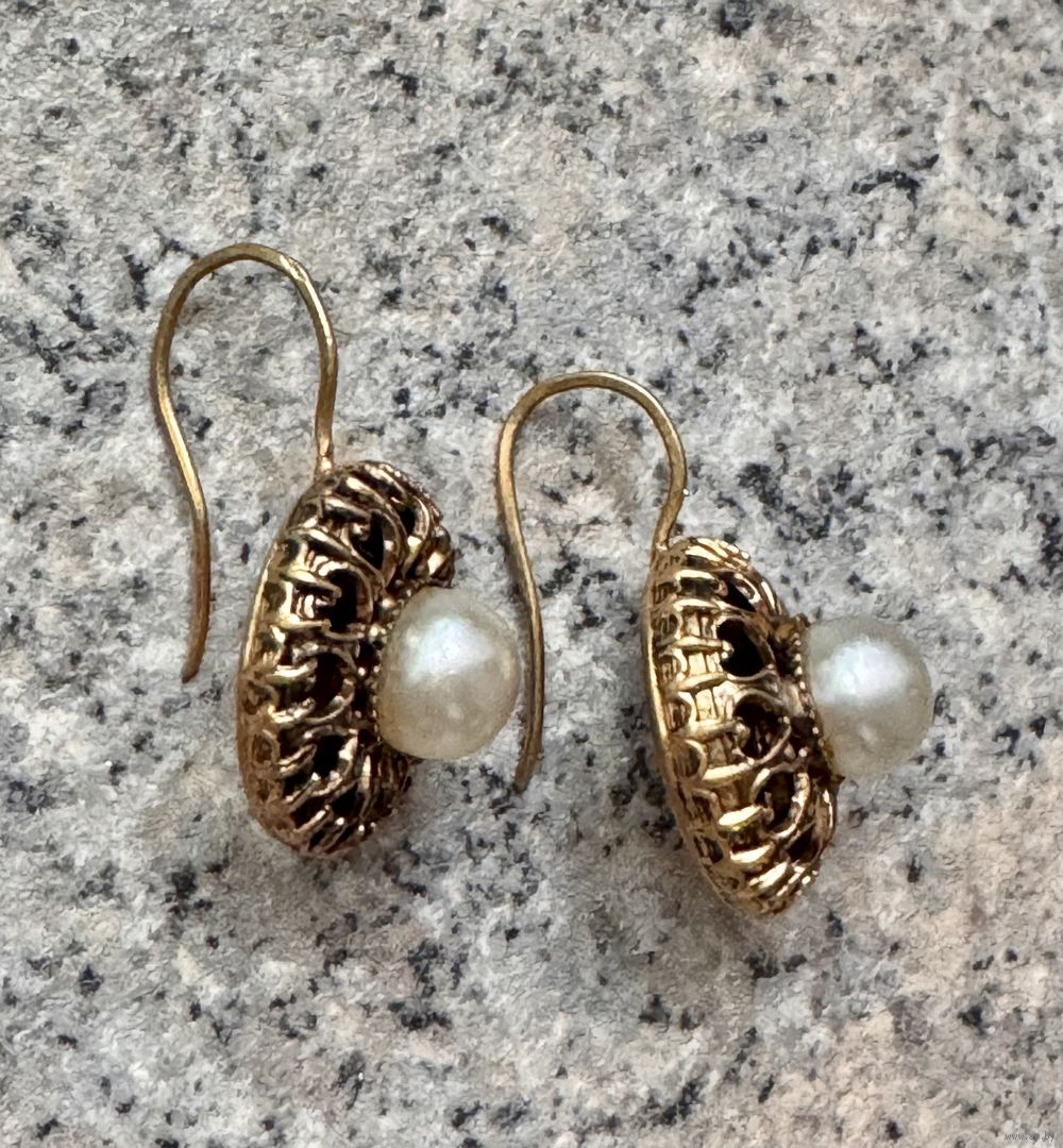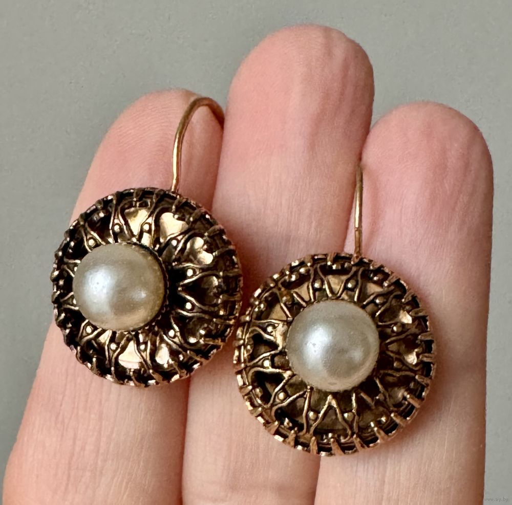 Винтажные чешские серьги с основой из латуни, вставки из стеклянных бусин под жемчуг (имеются незначительные царапки). Высота серьги 3см., диаметр подвески 1,8см. Общее состояние хорошее.