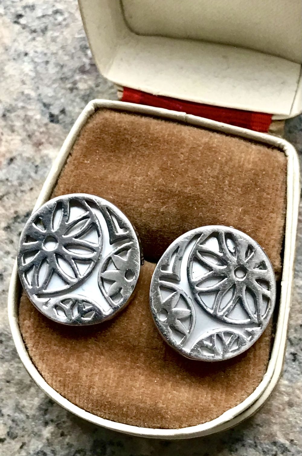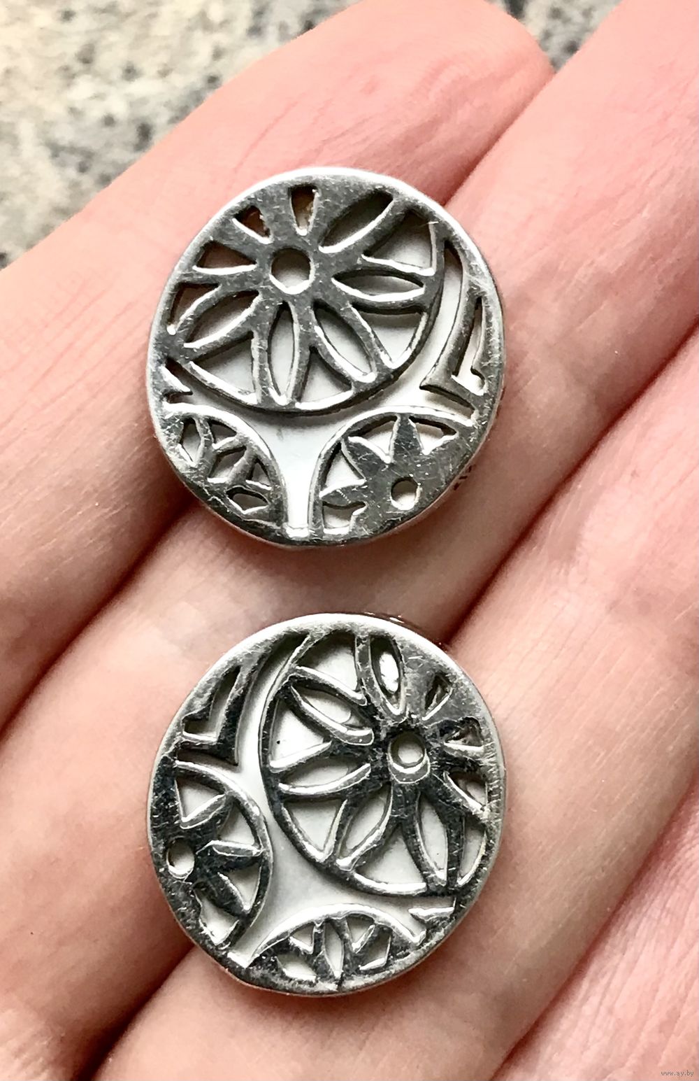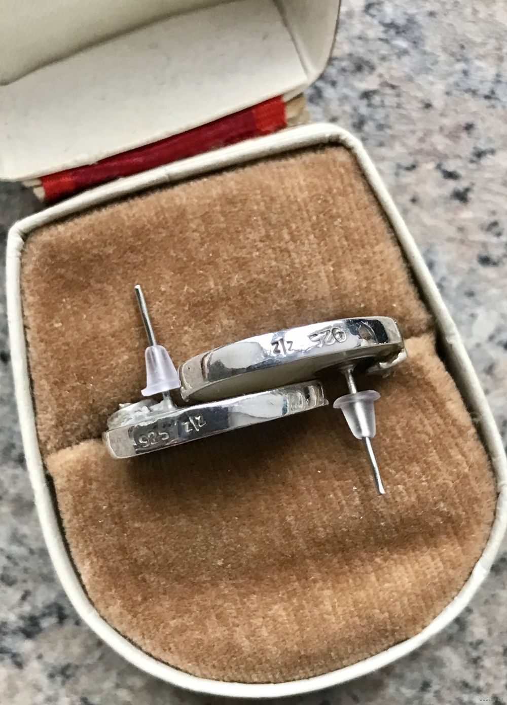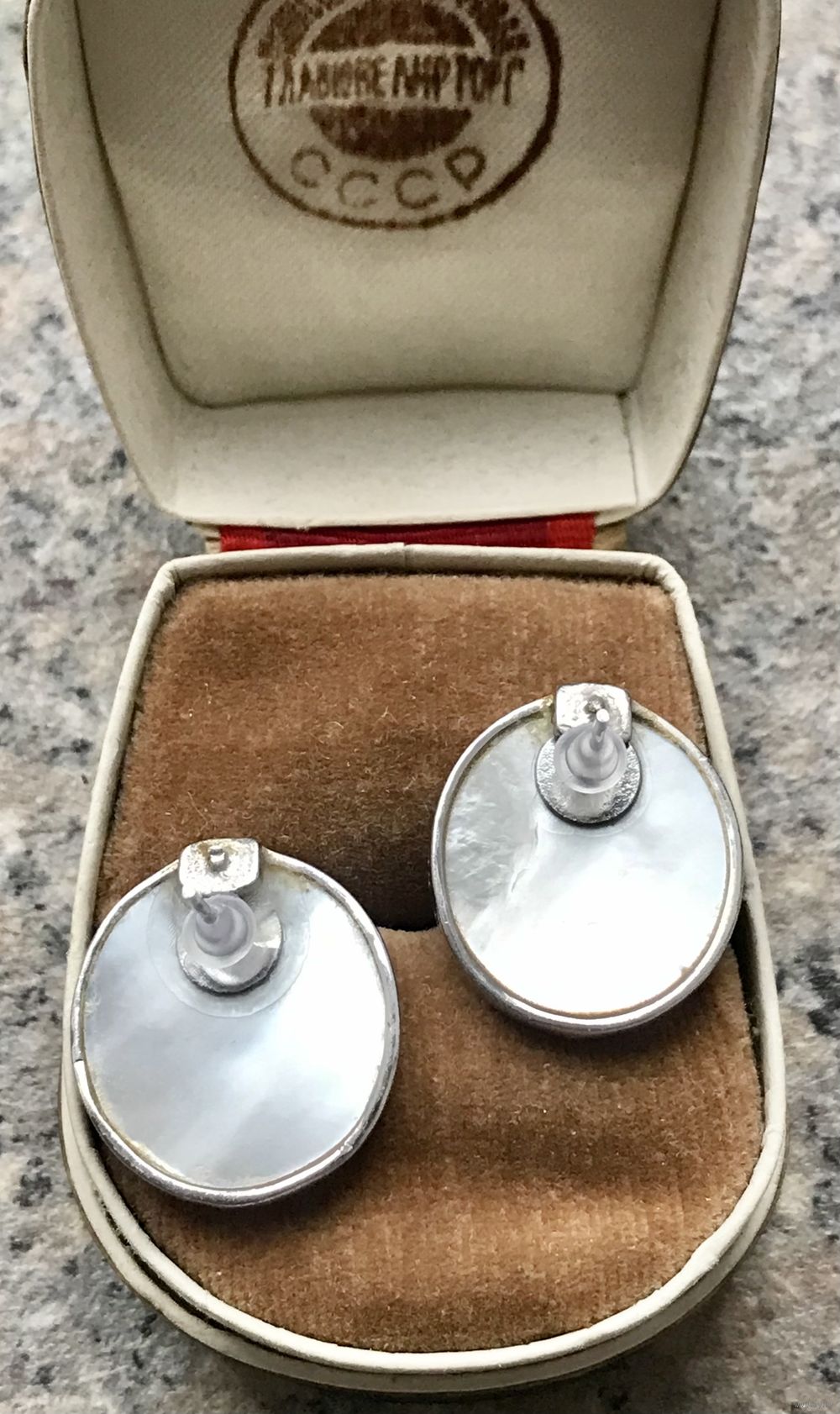 Серьги с основой и декоративной частью из серебра (стоит отметка 925) и вставками из пластин перламутра. Размер серьги 1,9х1,7см. Была произведена замена застёжки, этот нюанс учтён в цене.