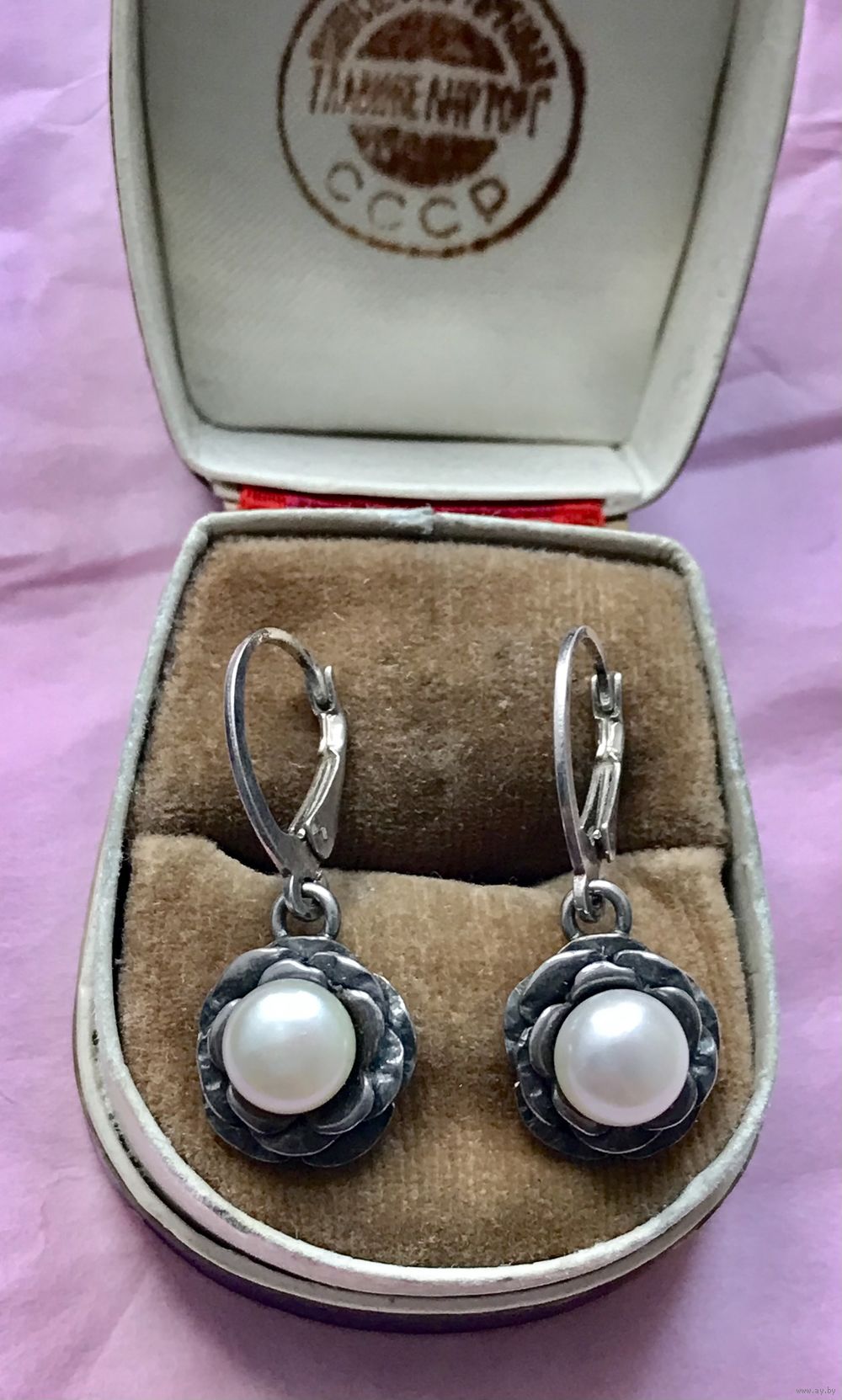 Серьги из серебра и жемчужных вставок. На каждой застёжке стоит отметка 925. Высота серьги 3,2см., диаметр жемчужины 0,7см. Состояние хорошее.
