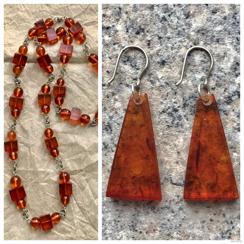Винтажные серьги с подвесками из янтаря (пресс). Крючки из мельхиора. Высота серьги 4,5см. Состояние хорошее. В лотах есть подходящие по цвету колье и бусы.