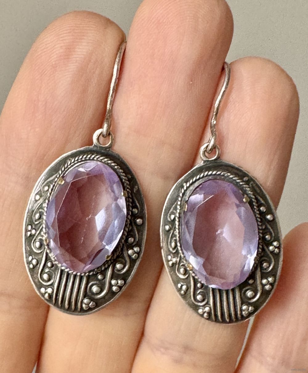 Винтажные серьги из мельхиора и вставок из стекла лавандового цвета. Высота серьги с петлей 4см., размер подвески 2,8х1,8см., размер вставки 1,5х1см. На одной вставке с обратной стороны есть небольшой скольчик.