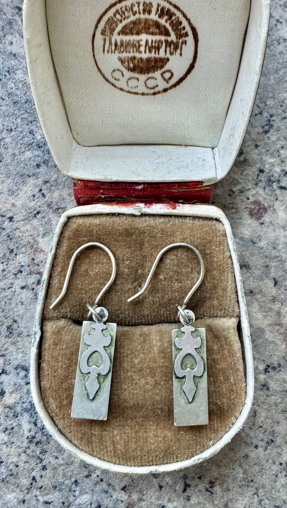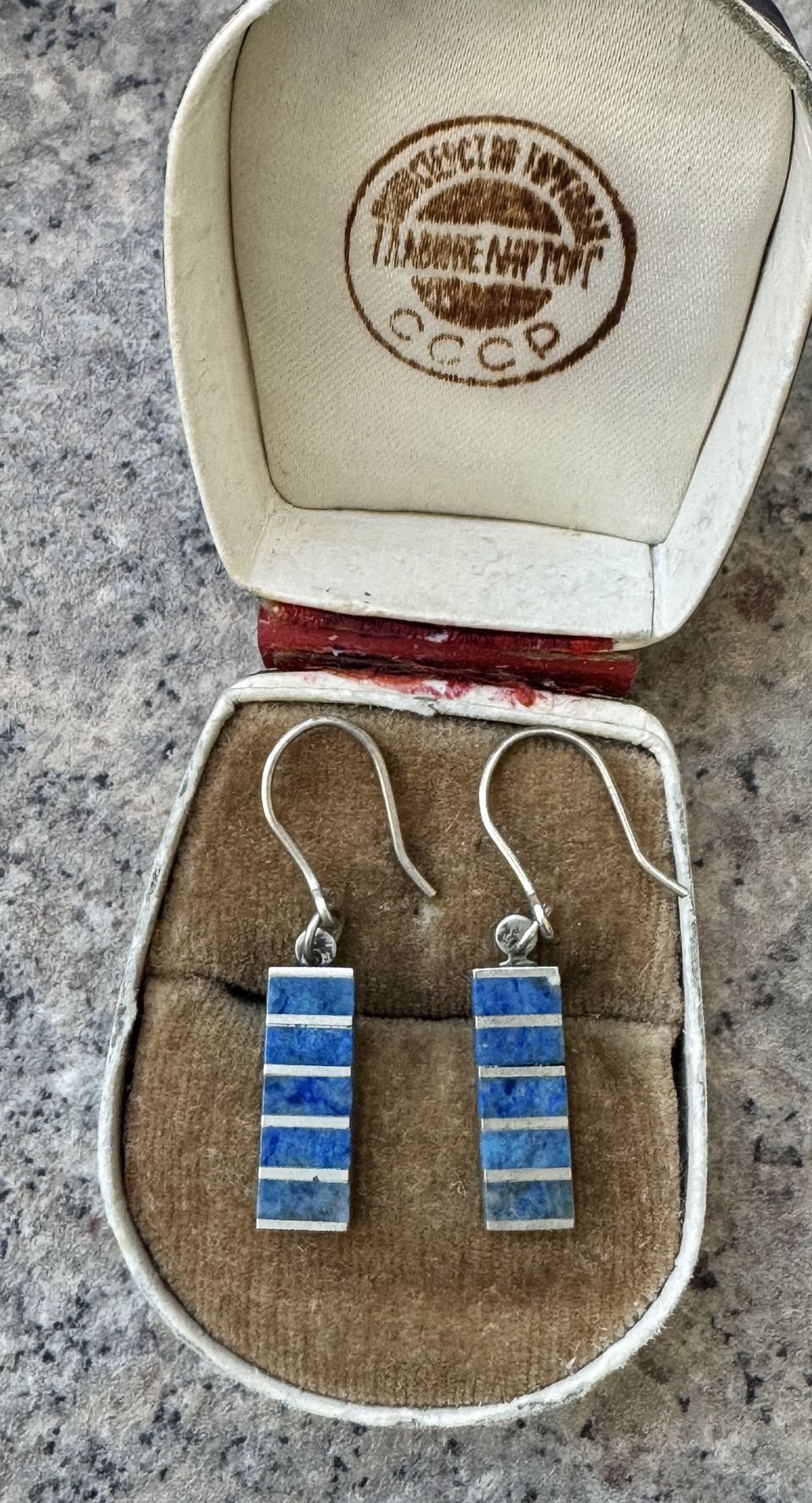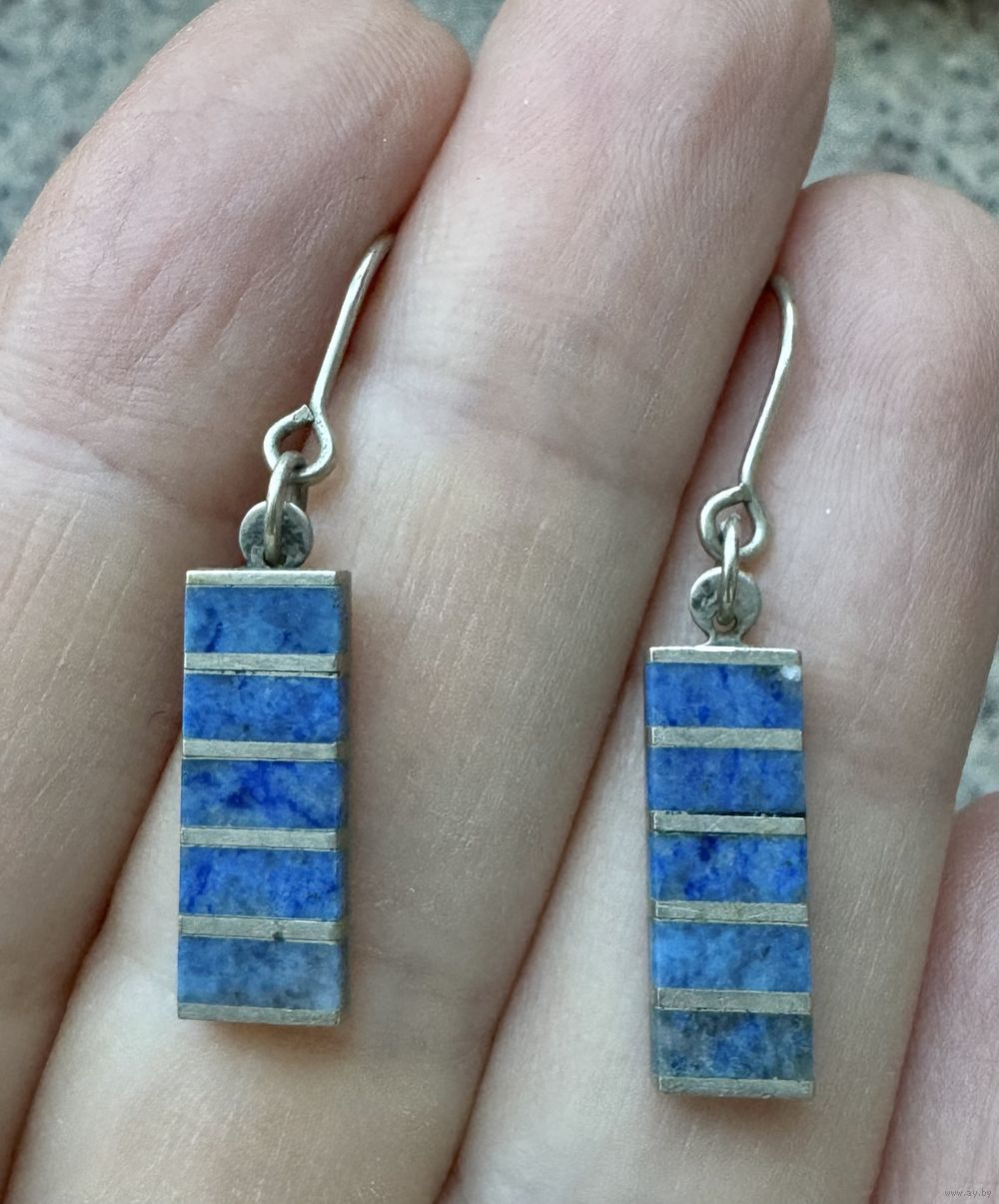 Небольшие винтажные серьги с основой из мельхиора, на лицевой стороне вставки из лазурита. Высота серьги 3,3см., размер подвески 1,8х0,6см. Состояние хорошее.