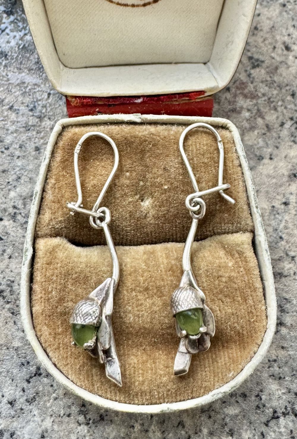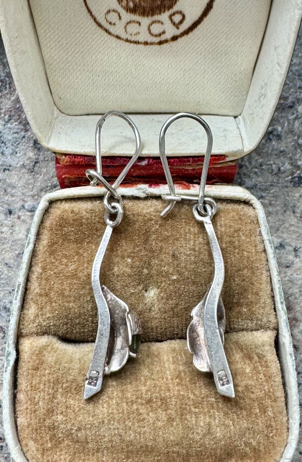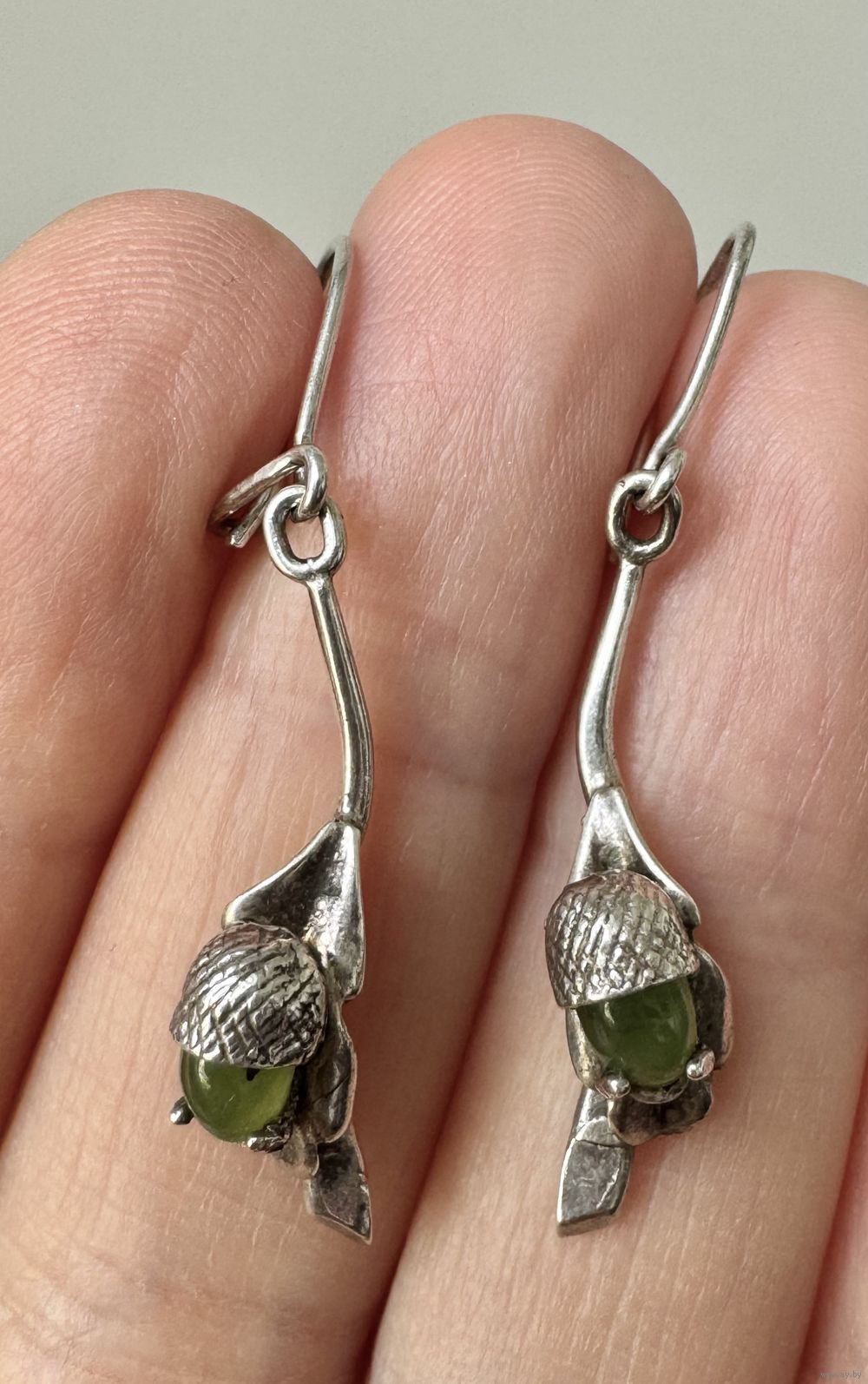 Винтажные серьги из серебра 925пр.(стоят пробирные клейма Польши) и вставок зелёного цвета. Высота серьги 4,2см., вес 2,74гр. Состояние хорошее.