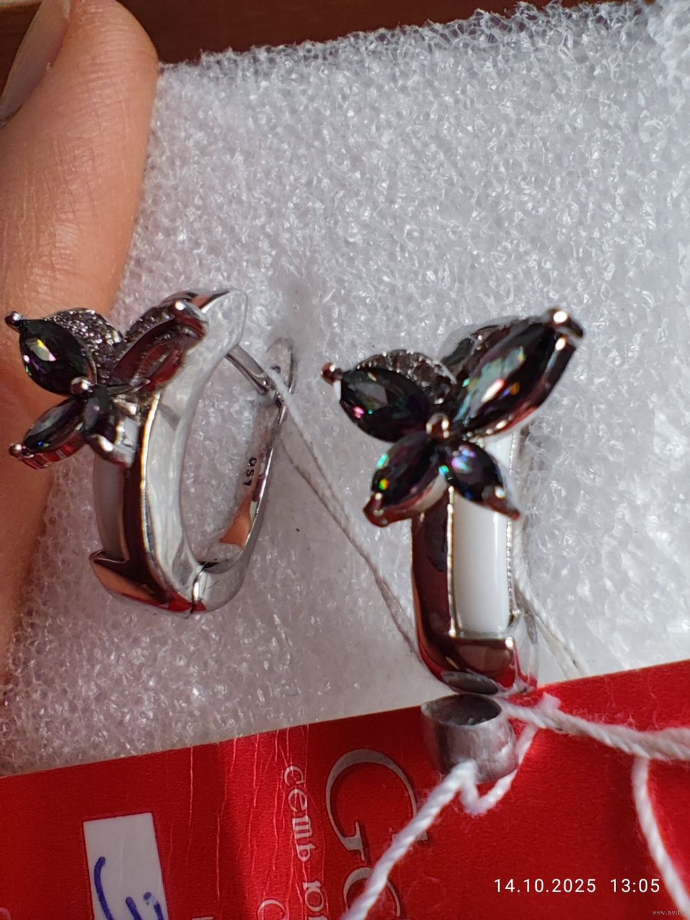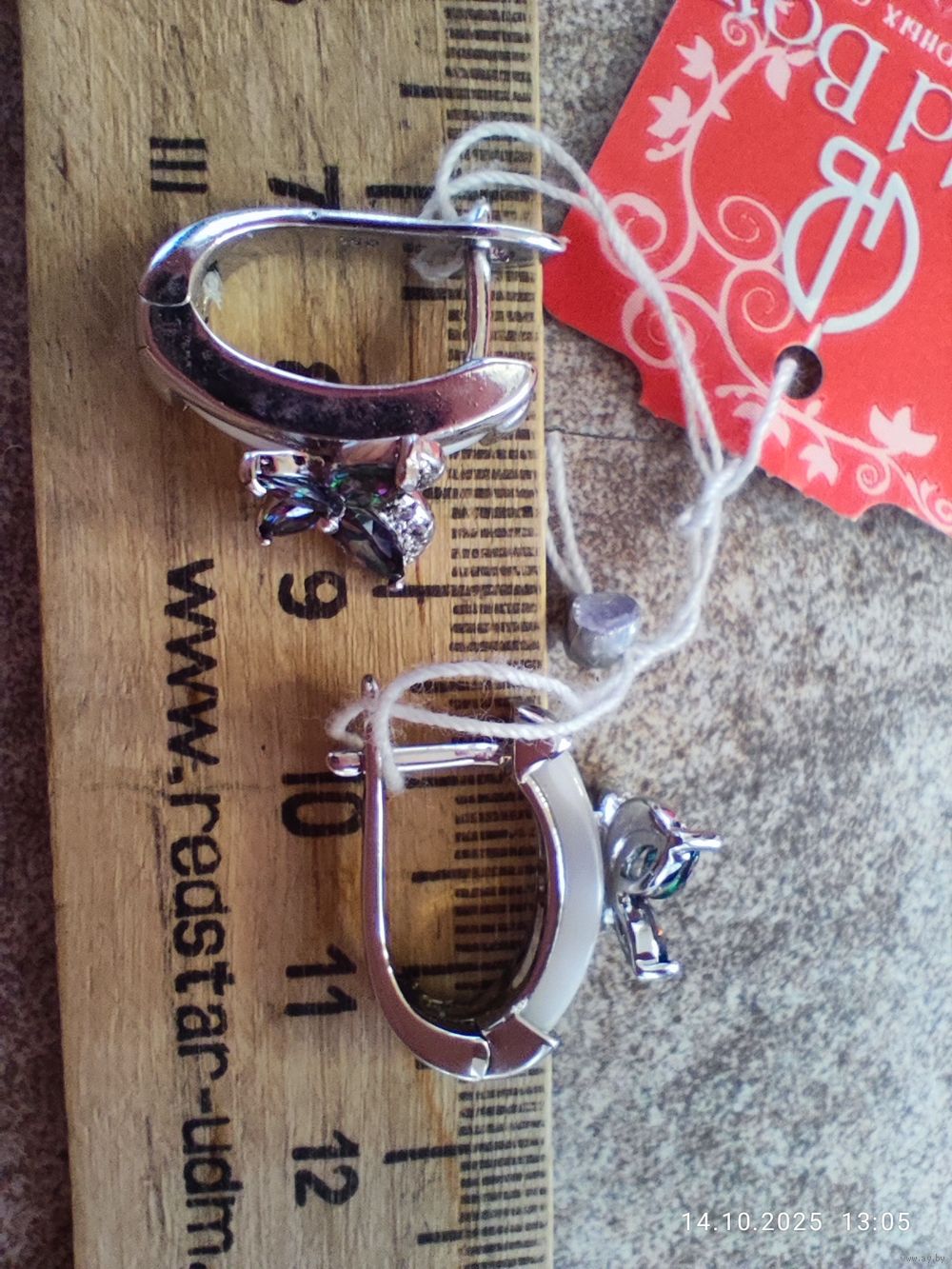 Серьги новые, куплены давным-давно в российском магазине. Клеймо импортное, соответствует 925. Вставки: керамика, фианиты, мистик кварц. Вес примерно 6 гр.