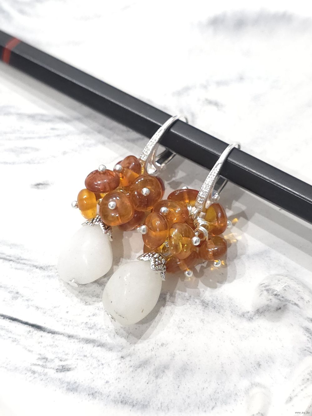 Серьги из натурального балтийского коньячного янтаря, натуральный белый агат.