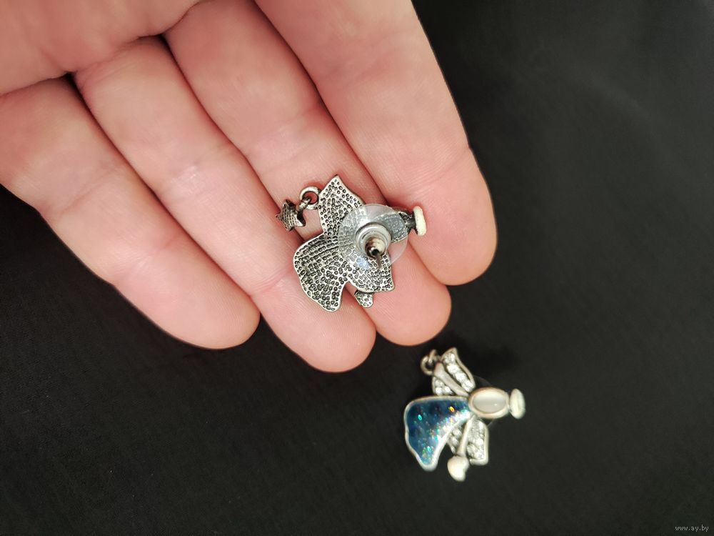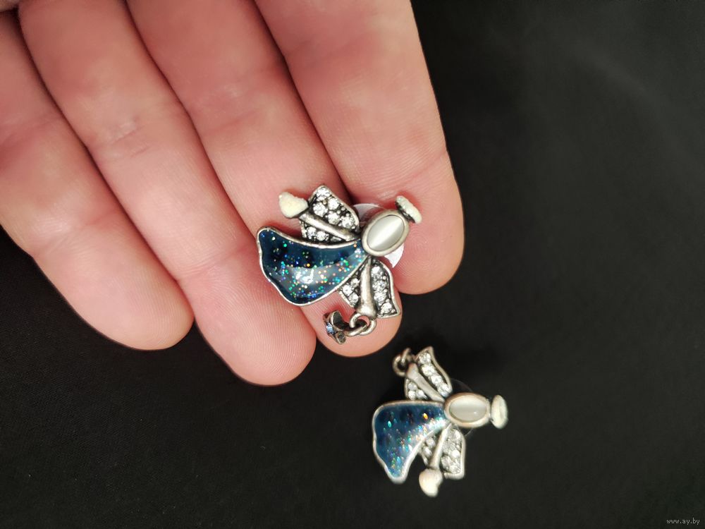 серьги-гвоздики в форме ангелов с синей эмалью и стразами.
