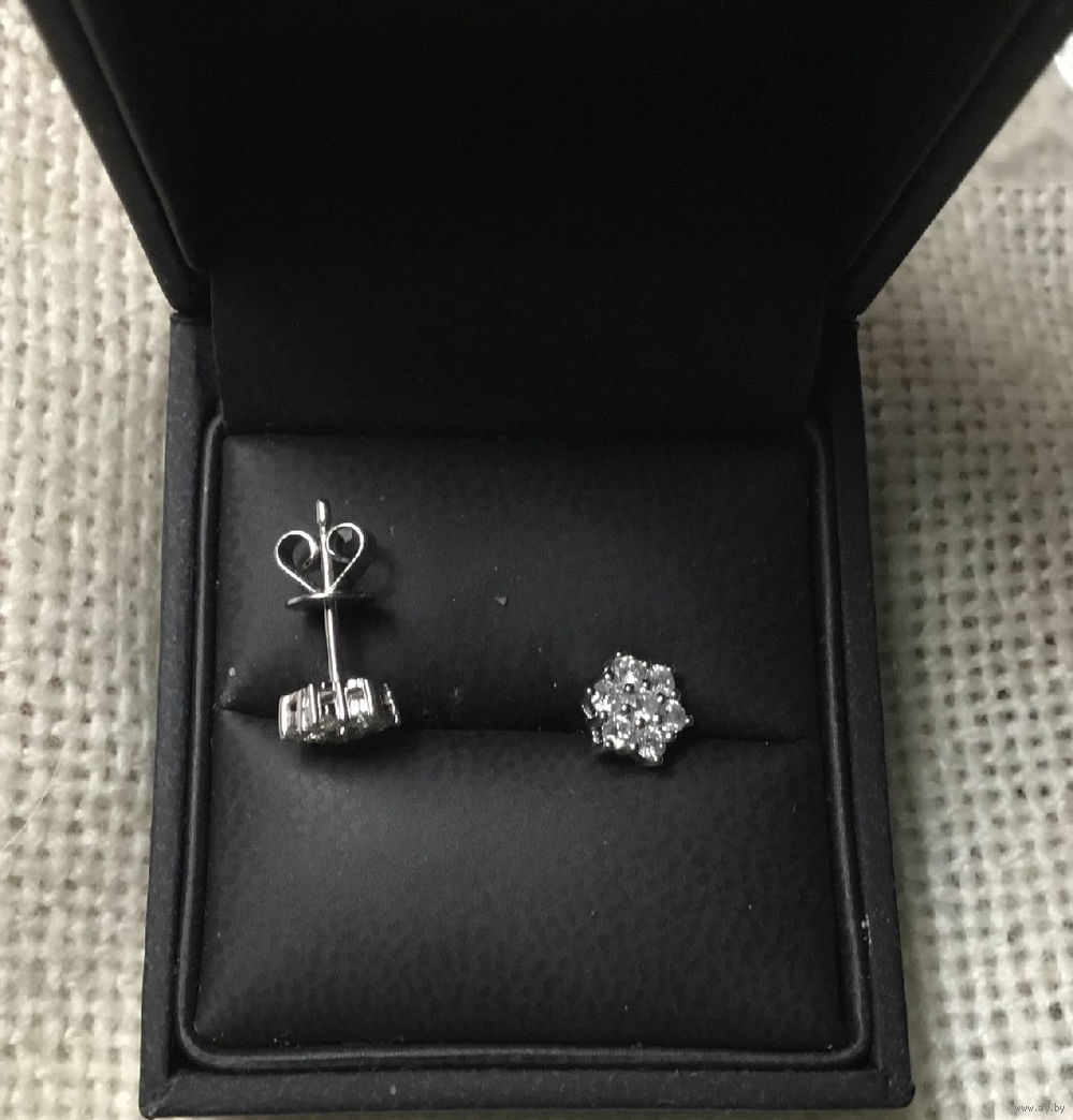 Серьги Гвоздики- белое золото 18 к или 750 проба , есть маркировка , вес 2 гр,вставки бриллианты, общая сумма 0,50 карат, на каждой серьге есть клеймо D- 0,25 , смотрятся как большой камень вместе, тугая застежка, держит очень хорошо, Отличный подарок
