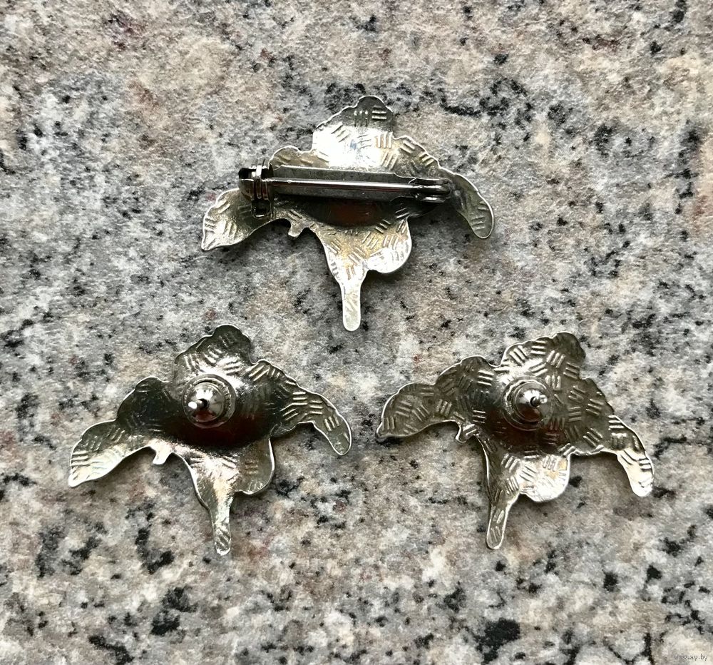Винтажный комплект известного английского бренда Fish&Crown. Серьги-пусеты и брошь размером 2,8х2,3см. Состояние хорошее. Не маркированы,но узнаваемы по фирменному рефленому узору на обратной стороне.