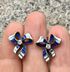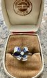 Винтажный комплект «бантики» с основой из мельхиора, лицевая сторона украшена горячей эмалью и вставками из фианитов. Размер серьги 1,8х1,7см. Размер кольца 19. Состояние хорошее.