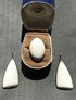 Крупный эффектный комплект с основой из мельхиора и вставками из кости. Высота серьги 5,3см., размер вставки 3,8х2см. Высота каста в кольце 3см., размер вставки 2,8х1,9см., размер кольца 19. Состояние хорошее.