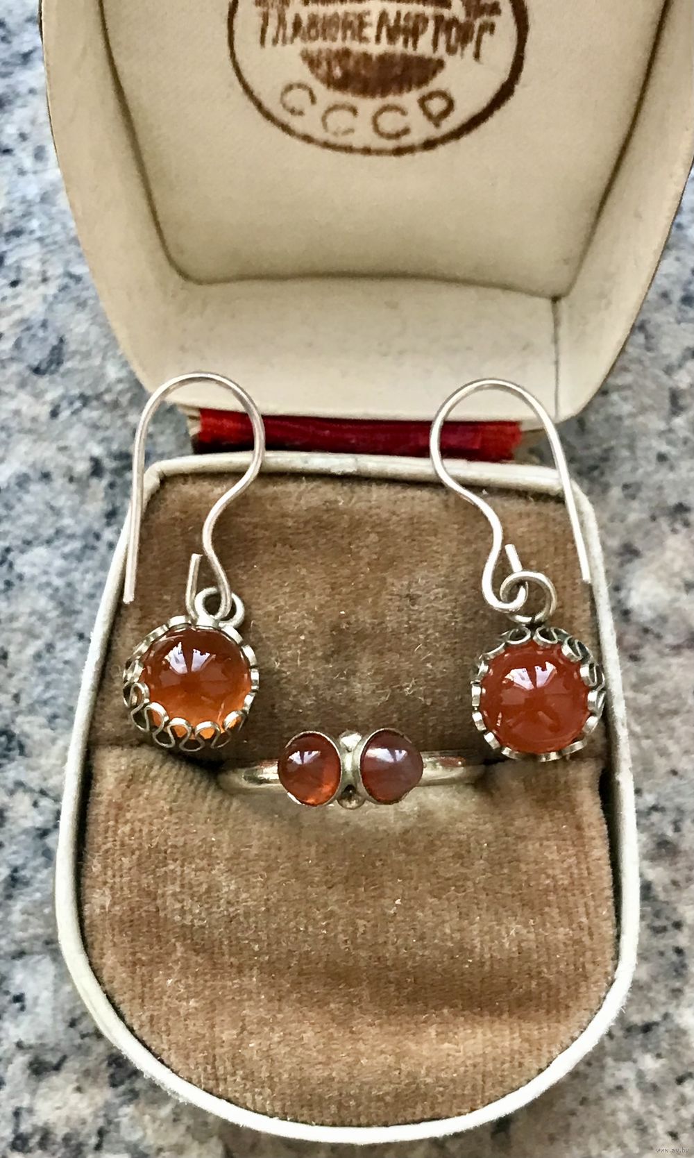 Небольшой сборный комплект из мельхиора и сердолика. Высота серьги 3см., диаметр подвески 1см., размер кольца 15-16, состояние хорошее.