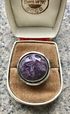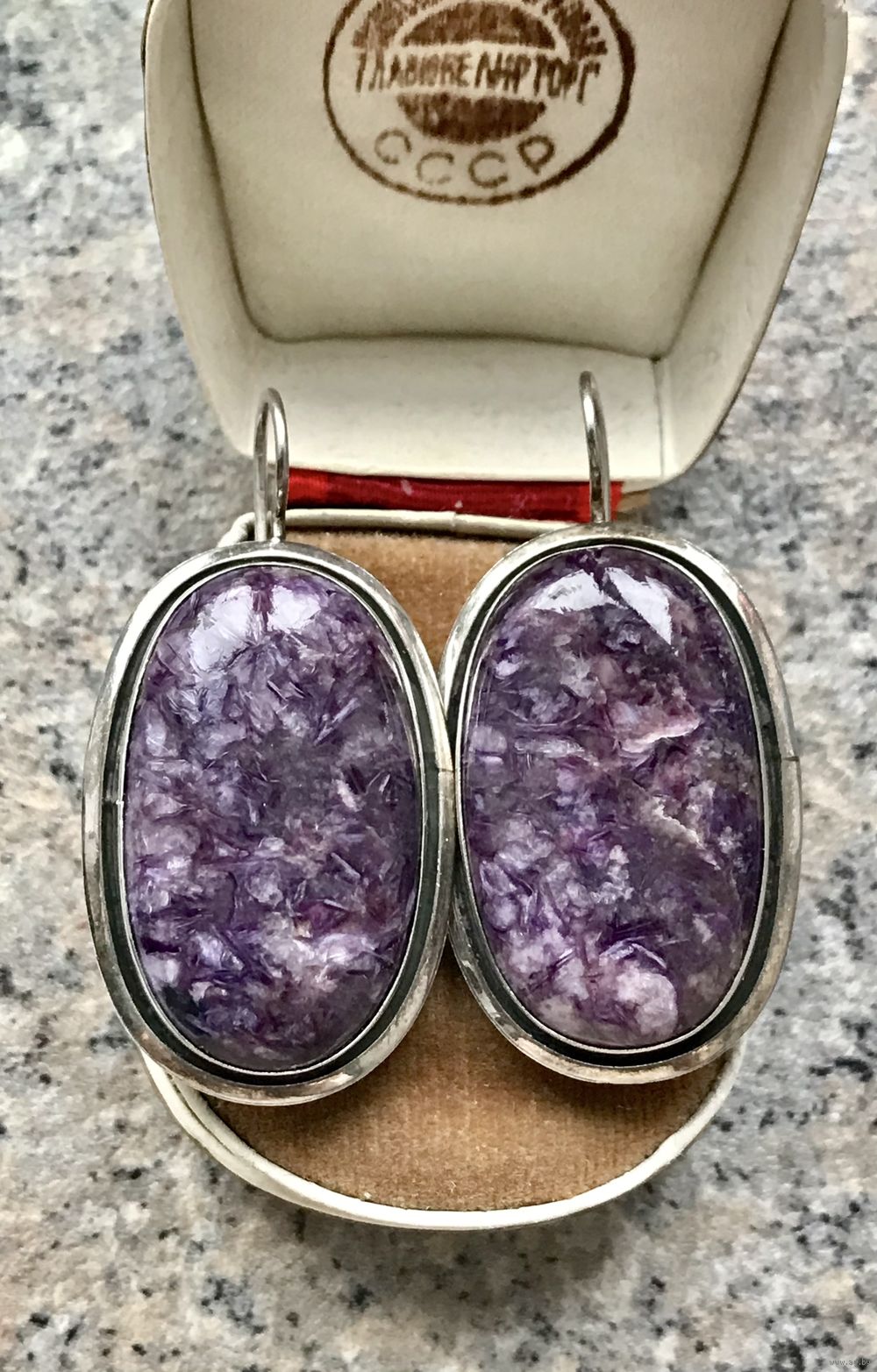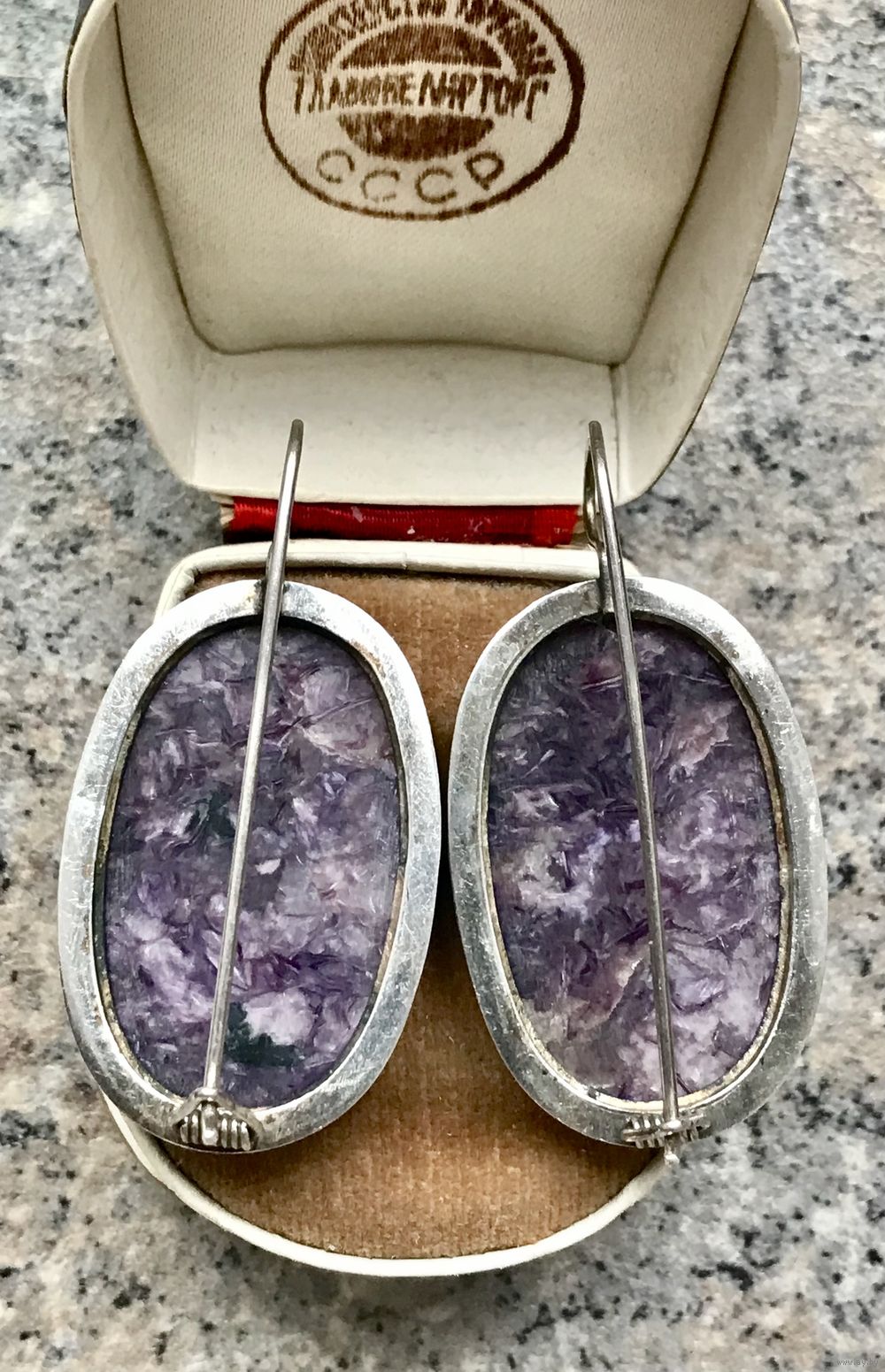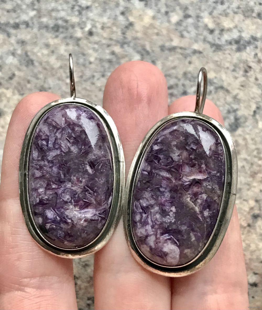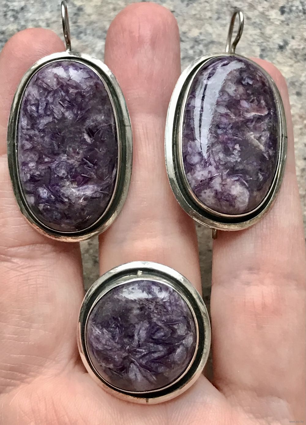 Крупный комплект с основой из металла с глубоким серебрением и вставок из чароита. Высота серьги с петлей 4,5см., размер вставки 3х1,7см. Высота каста в кольце 2,4см., диаметр вставки 1,8см., размер 18-19. Состояние хорошее.
