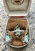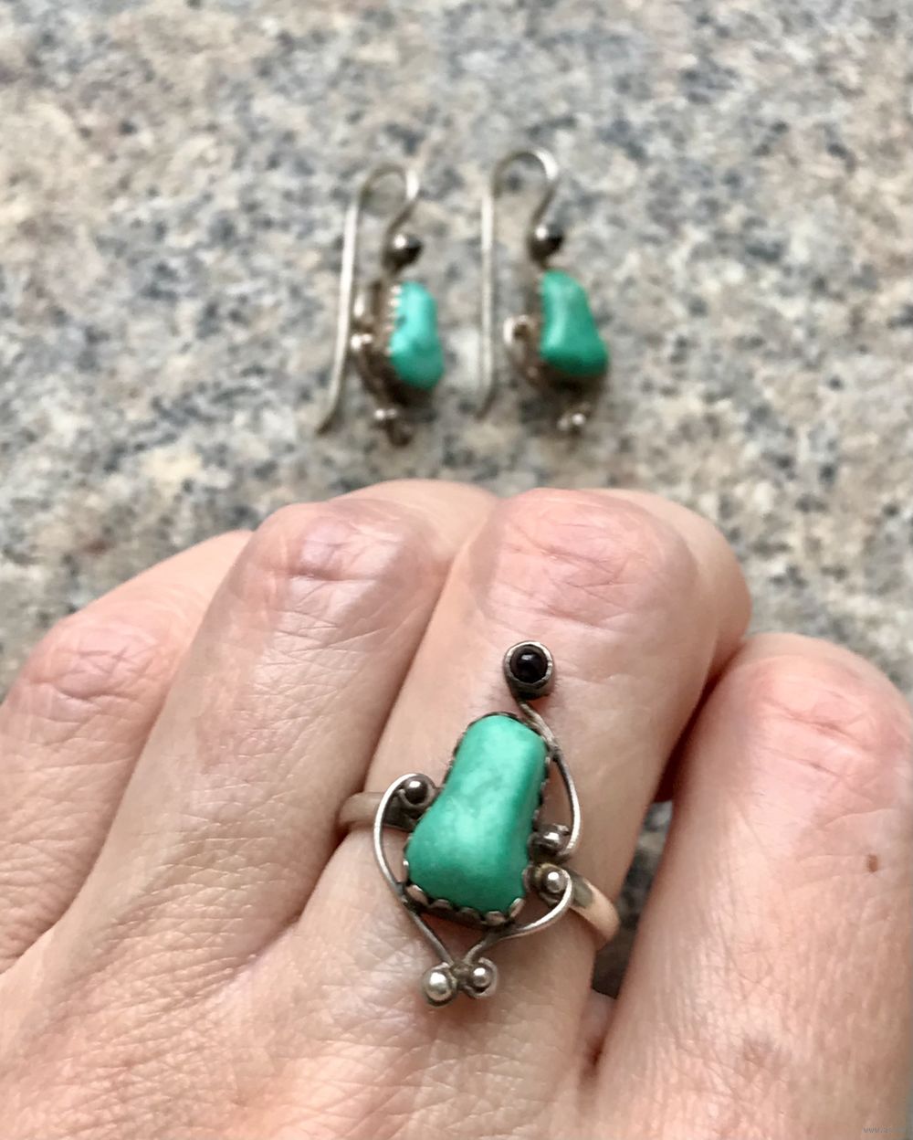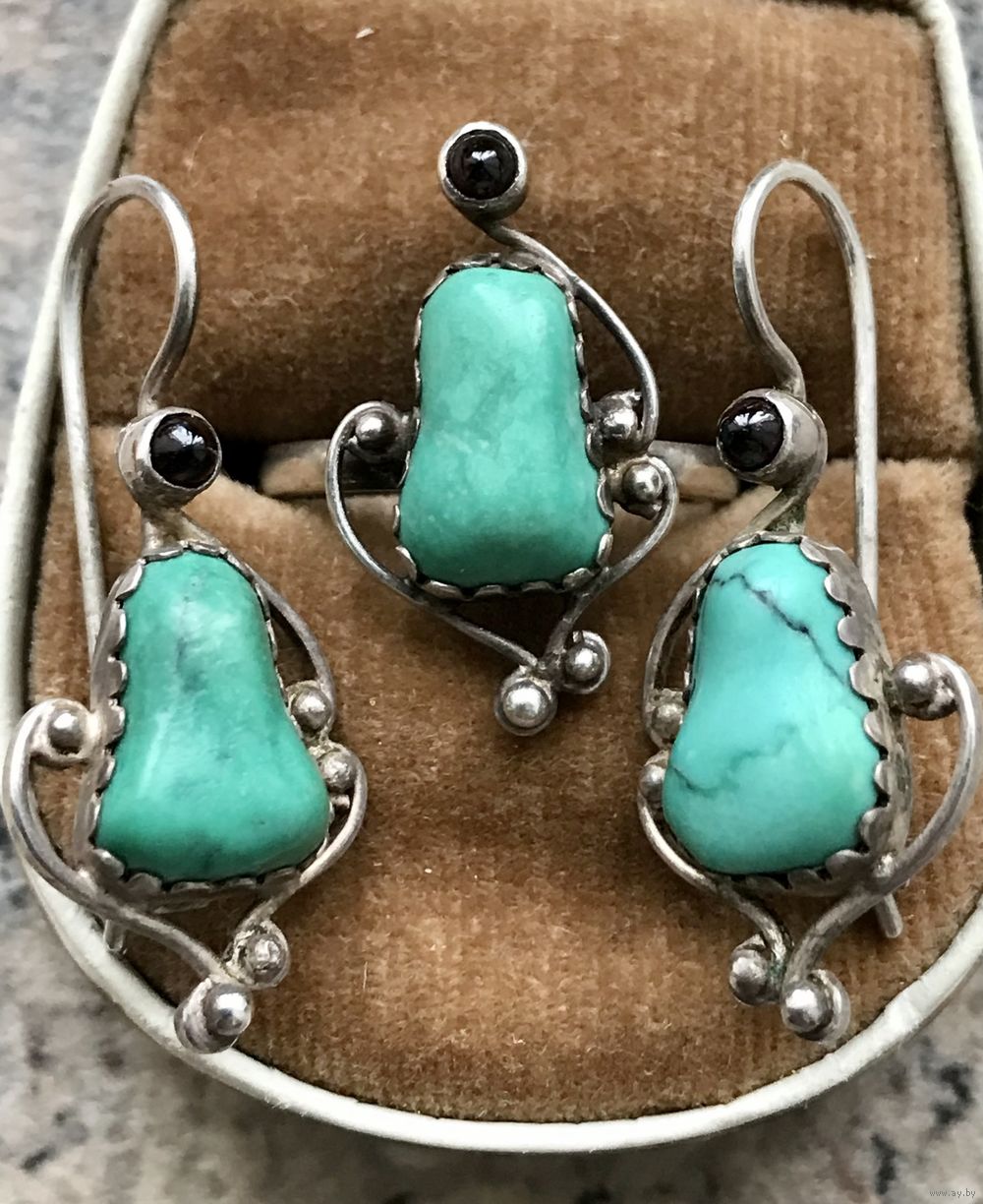 Винтажный комплект из серебра со вставками из природной бирюзы и граната. Комплект был изготовлен на заказ (никаких отметок нет), ручная работа. Размер кольца 17-18, высота центральной части 2,2см., вставка бирюзы высотой 1,1см., ширина от 0,5до 0,8см. Высота серьги 3см., вставка бирюзы высотой 1,1см. ширина от 0,5до 0,9см. В одной серьге бирюза немного отличается по цвету. Состояние комплекта хорошее.
