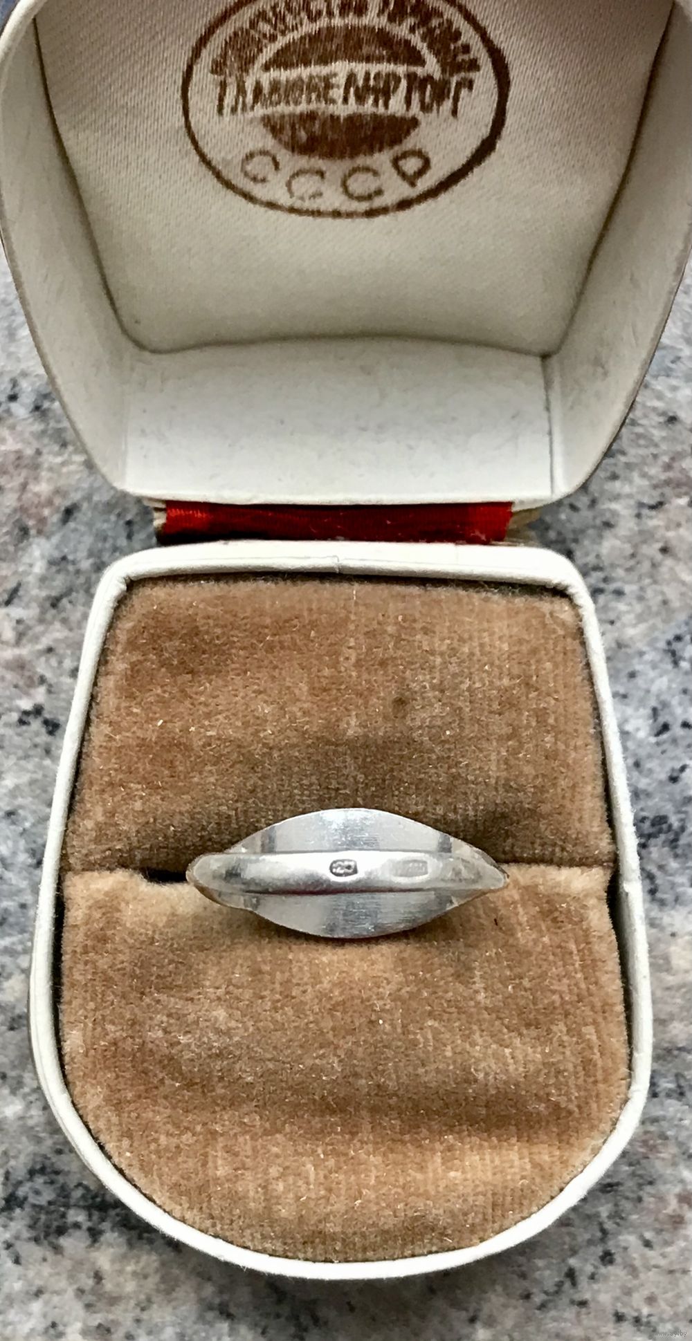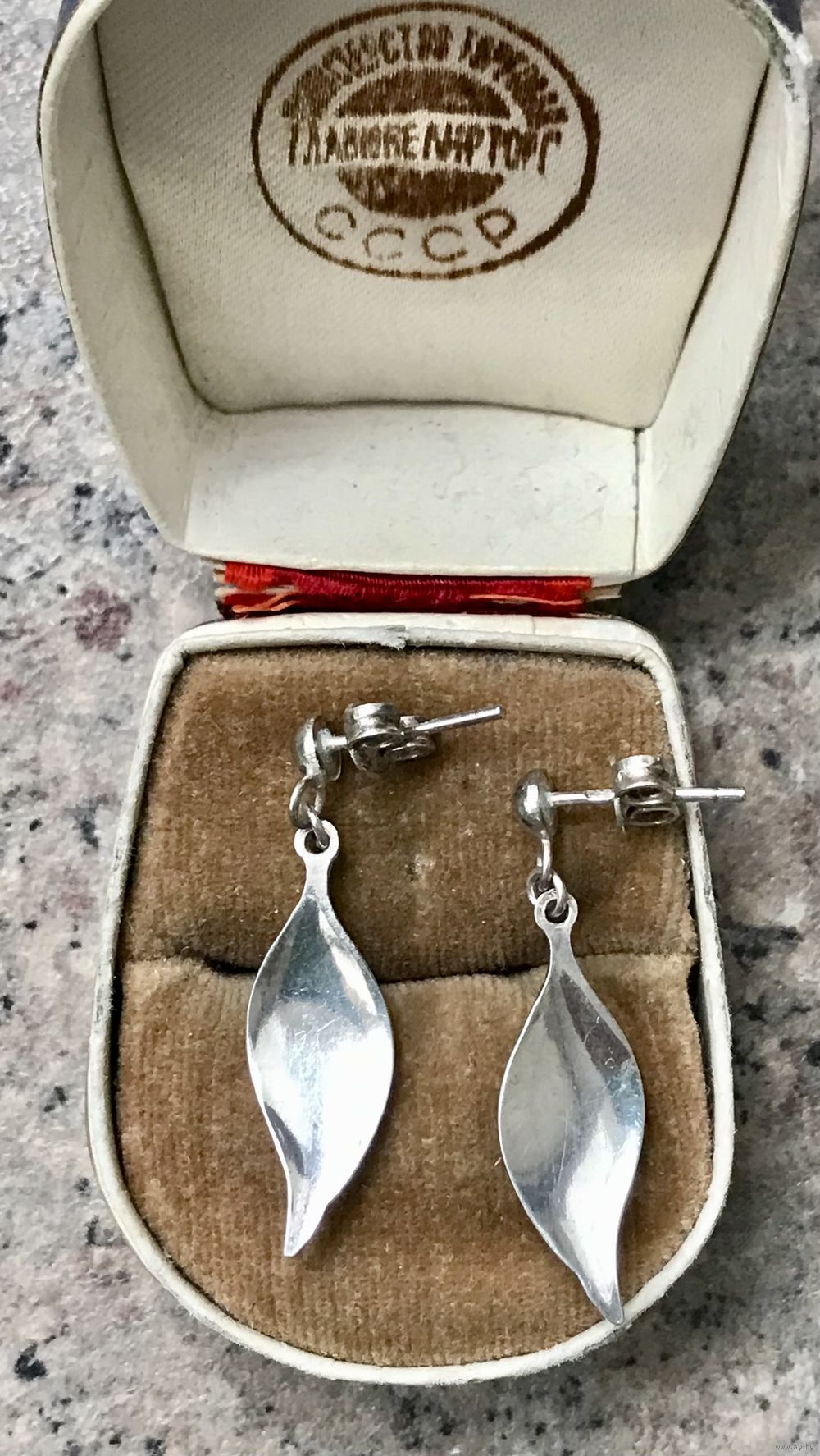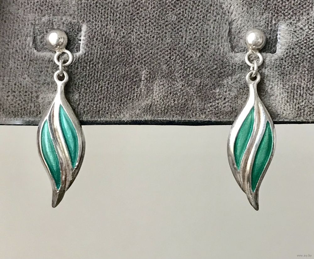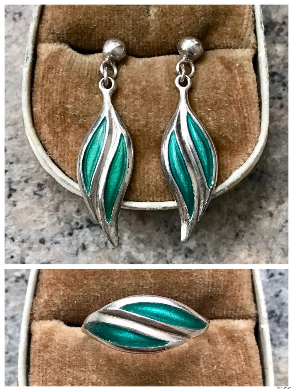 Комплект из серебра 925пр.(звезда), изготовлен в 1992г. на Таллинском ювелирном заводе (именник :2J). Лицевая сторона украшена эмалью. Высота серьги 3,4см, размер кольца 17. Состояние хорошее.