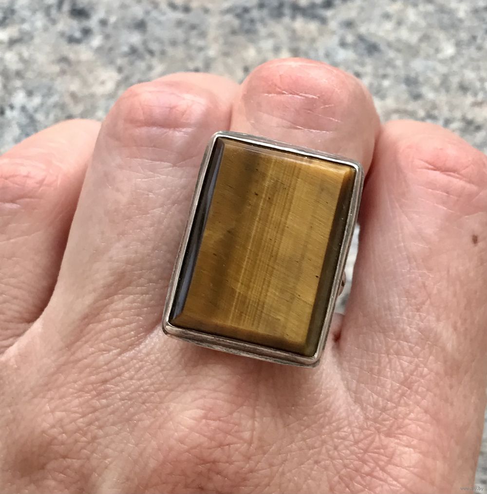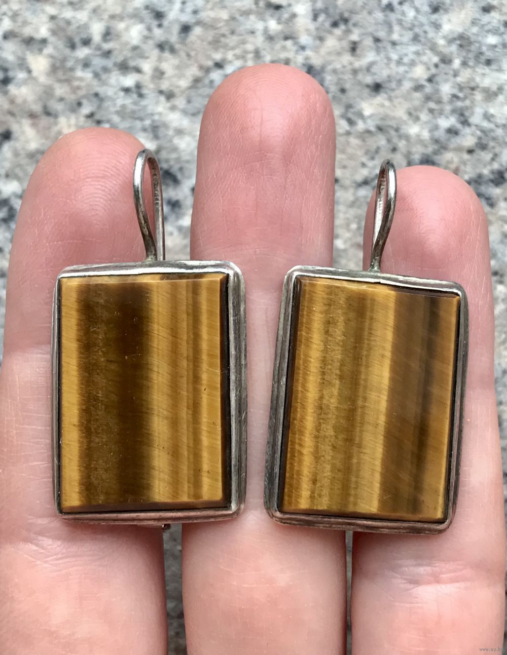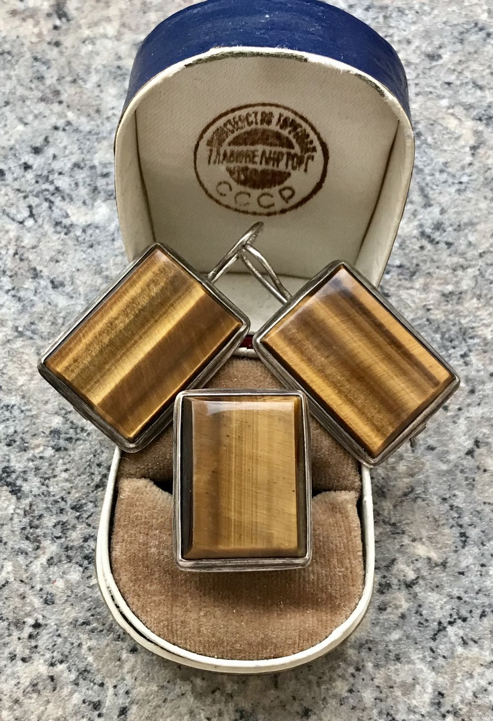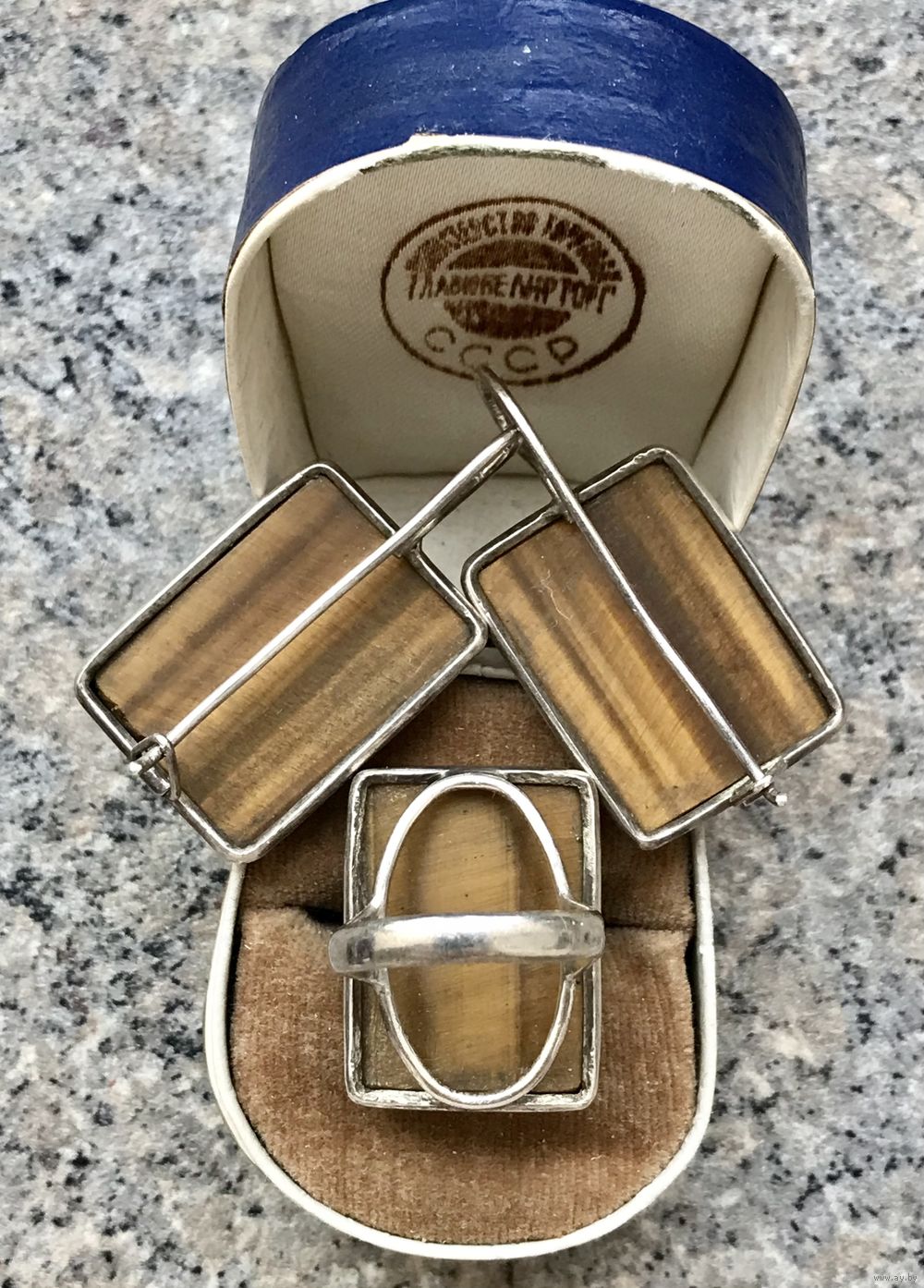 Крупный комплект с основой из металла с глубоким серебрением и вставок из камня тигровый глаз. Высота каста в кольце 2,5см., размер вставки 2,2х1,7см., размер 18-18,5. Высота серьги с петлей 4см., размер вставки 2,4х1,7см. Состояние хорошее.