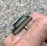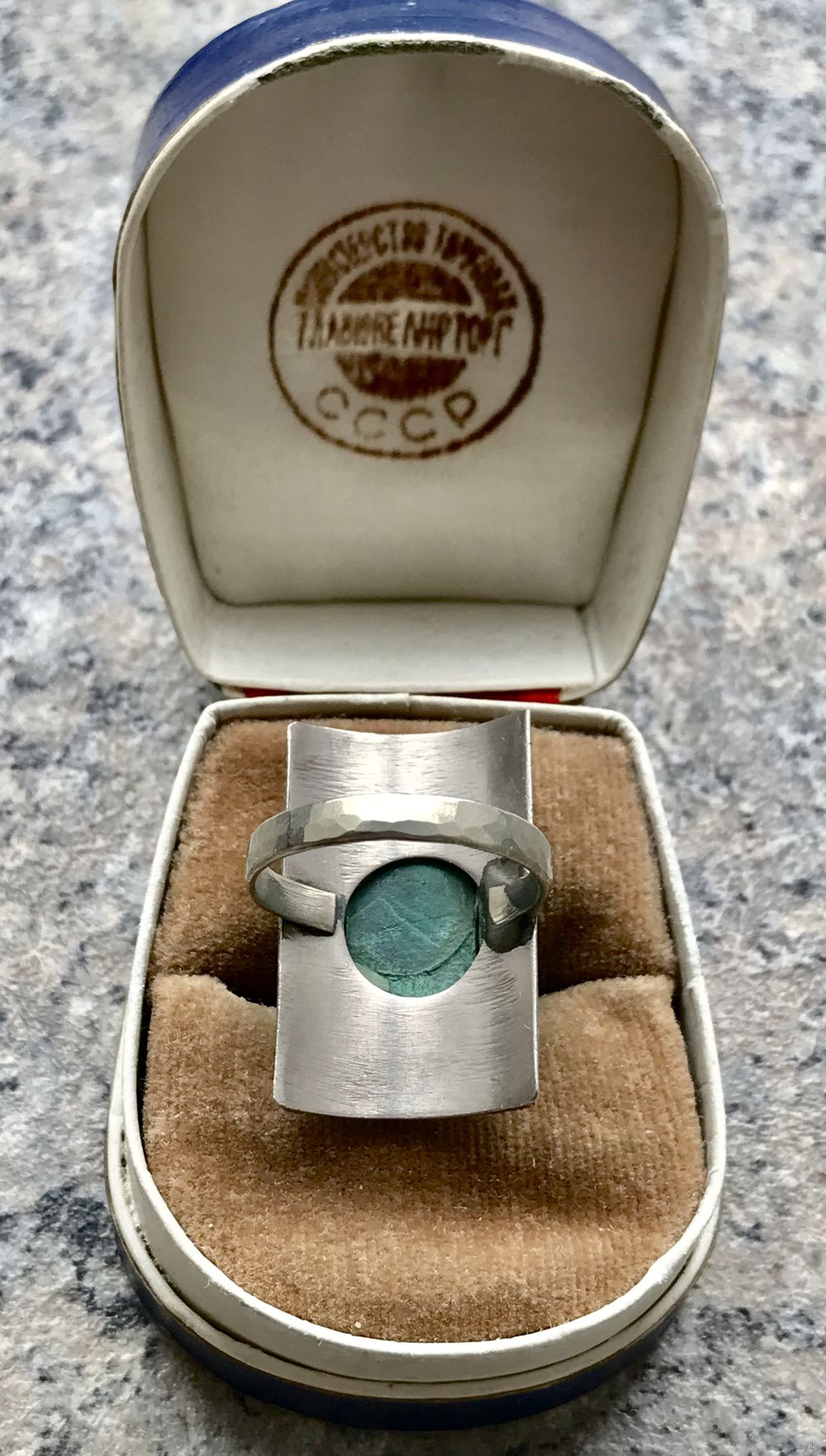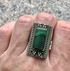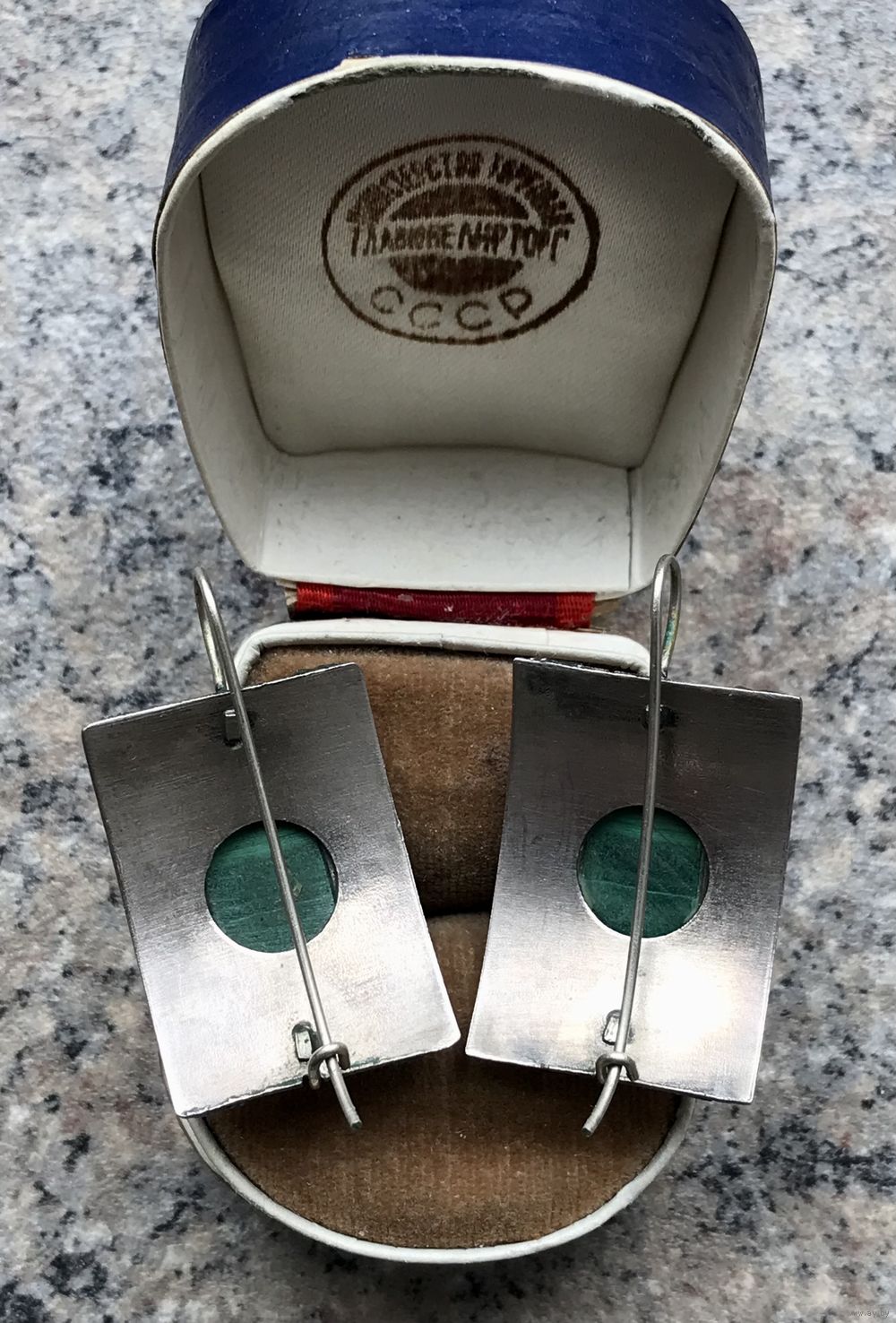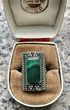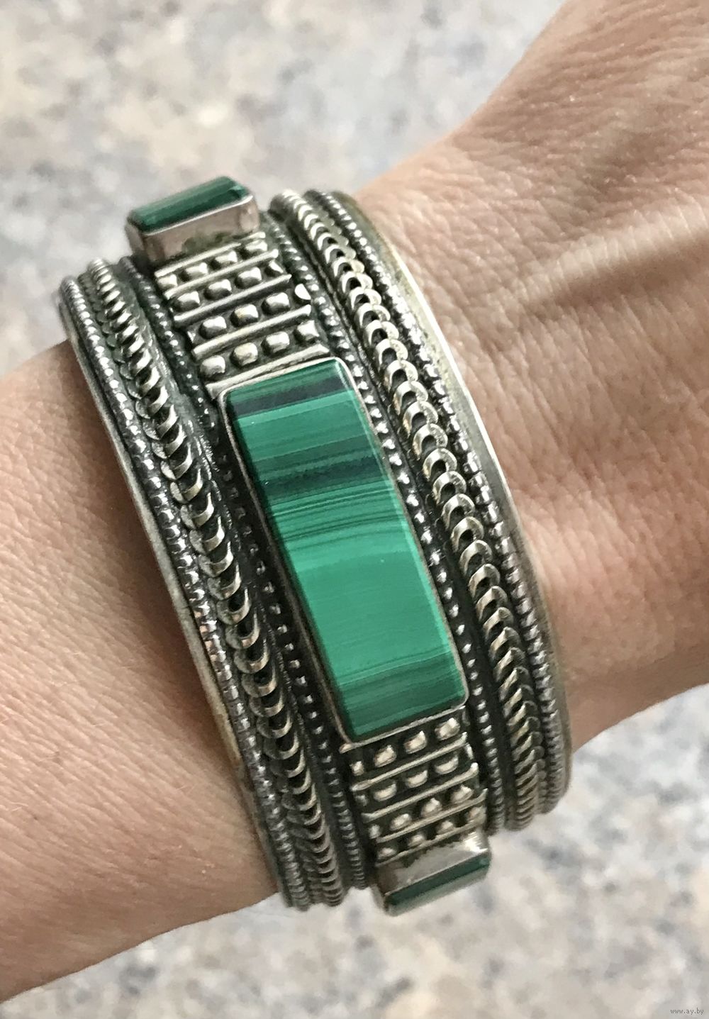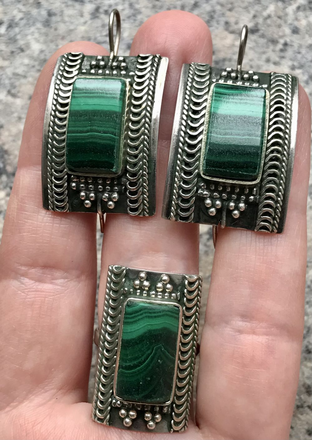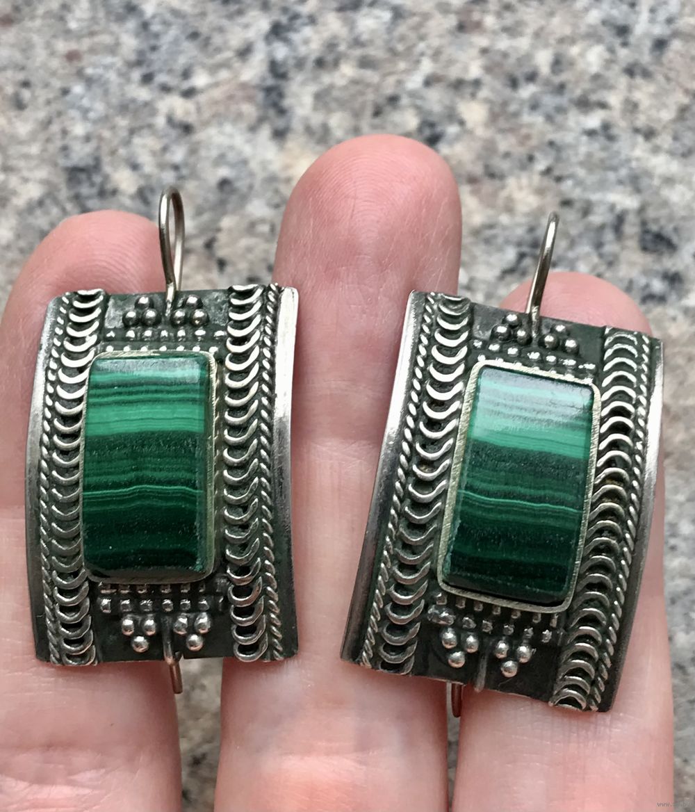 Крупный комплект с основой из мельхиора и вставок из малахита. Автор художник-ювелир Вахтанг Нармания. Комплект называется «Тамар» и сделан по эскизам украшений царицы Тамары, с именем которой связан «Золотой век» в истории Грузии. Высота серьги с петлей 4см. ширина 2,2см., размер вставки 0,9х1,6см. Высота кольца 2,7см., вставка 0,9х1,5см., размер 18-19 (возможно был ремонт, на фото видно, на внешний вид не влияет). На гранях вставок имеются незначительные потёртости. Общее состояние украшений хорошее.