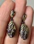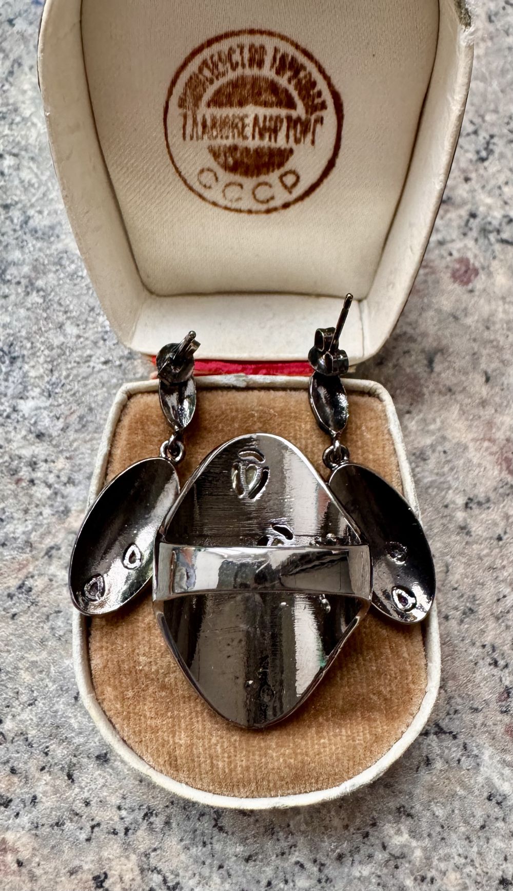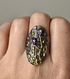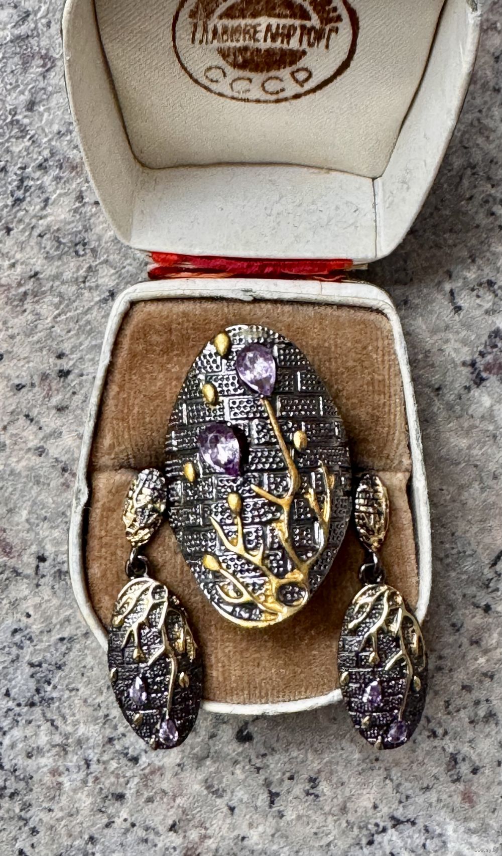 Крупный комплект с основой из металла и вставками из цветного стекла. Высота серьги 3см., высота кольца 3см., размер 19. Состояние хорошее.