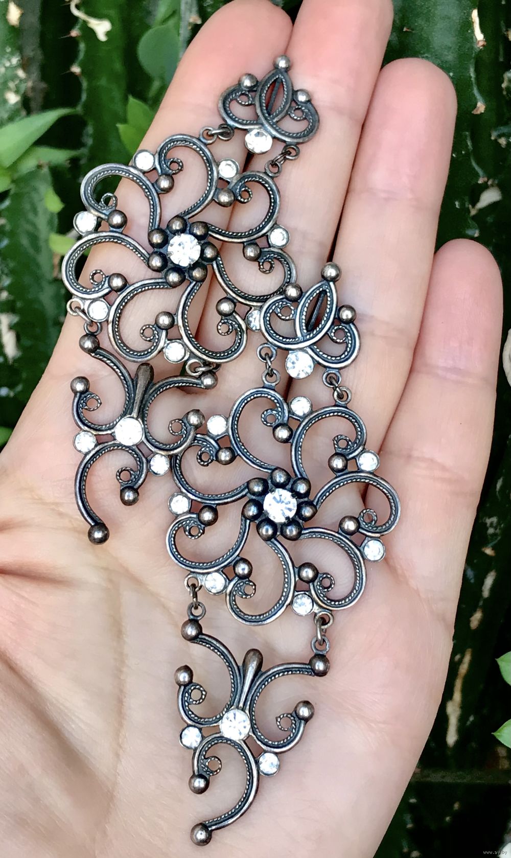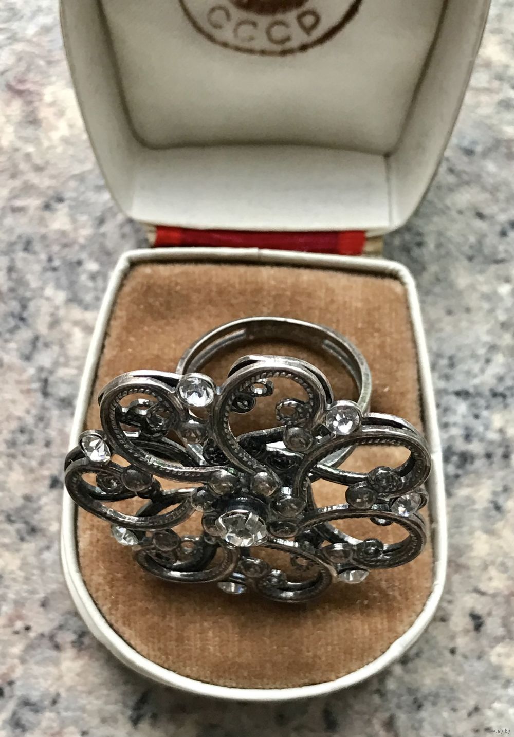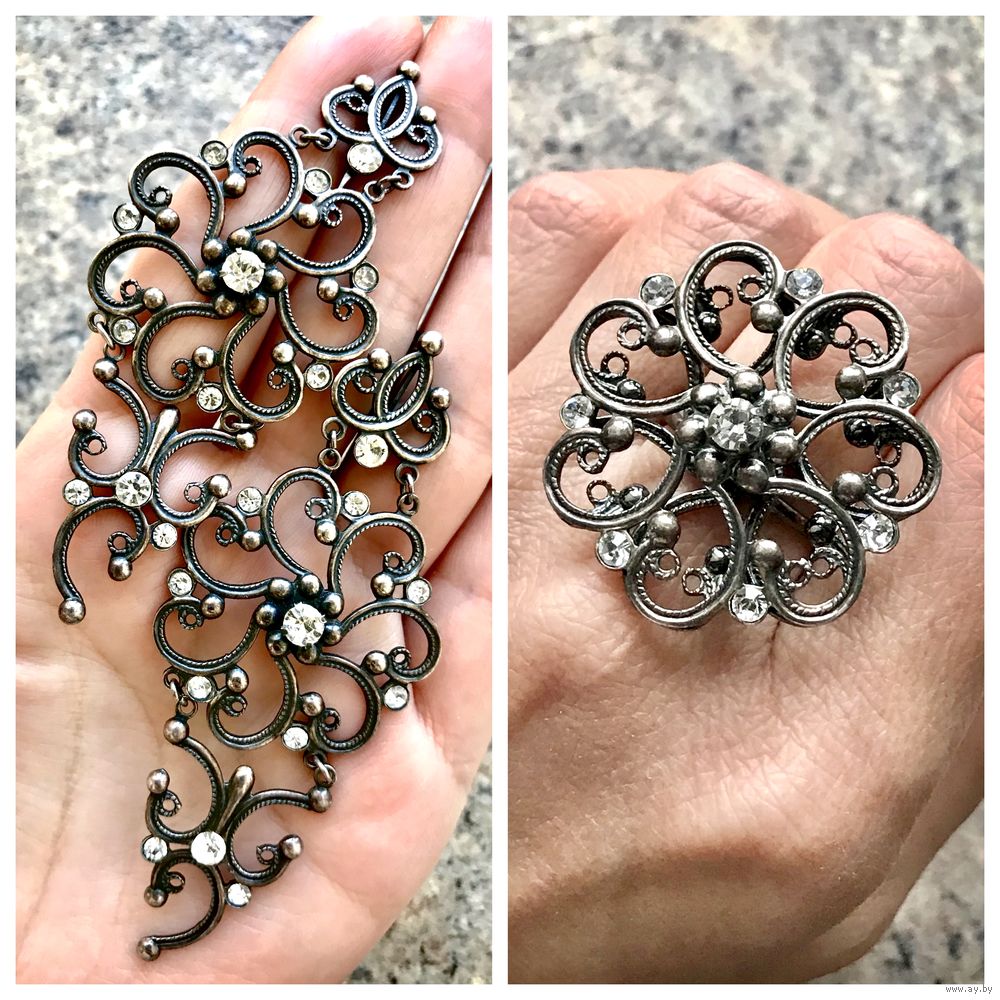 Крупный комплект с основой из металла с серебрением (стоит клеймо) и вставок из юв.стекла. Высота серьги 8,5см., диаметр средней подвески 3,5см. Вся конструкция серьги подвижная. Размер кольца 18, высота каста 3,5см. Состояние хорошее.