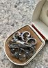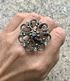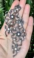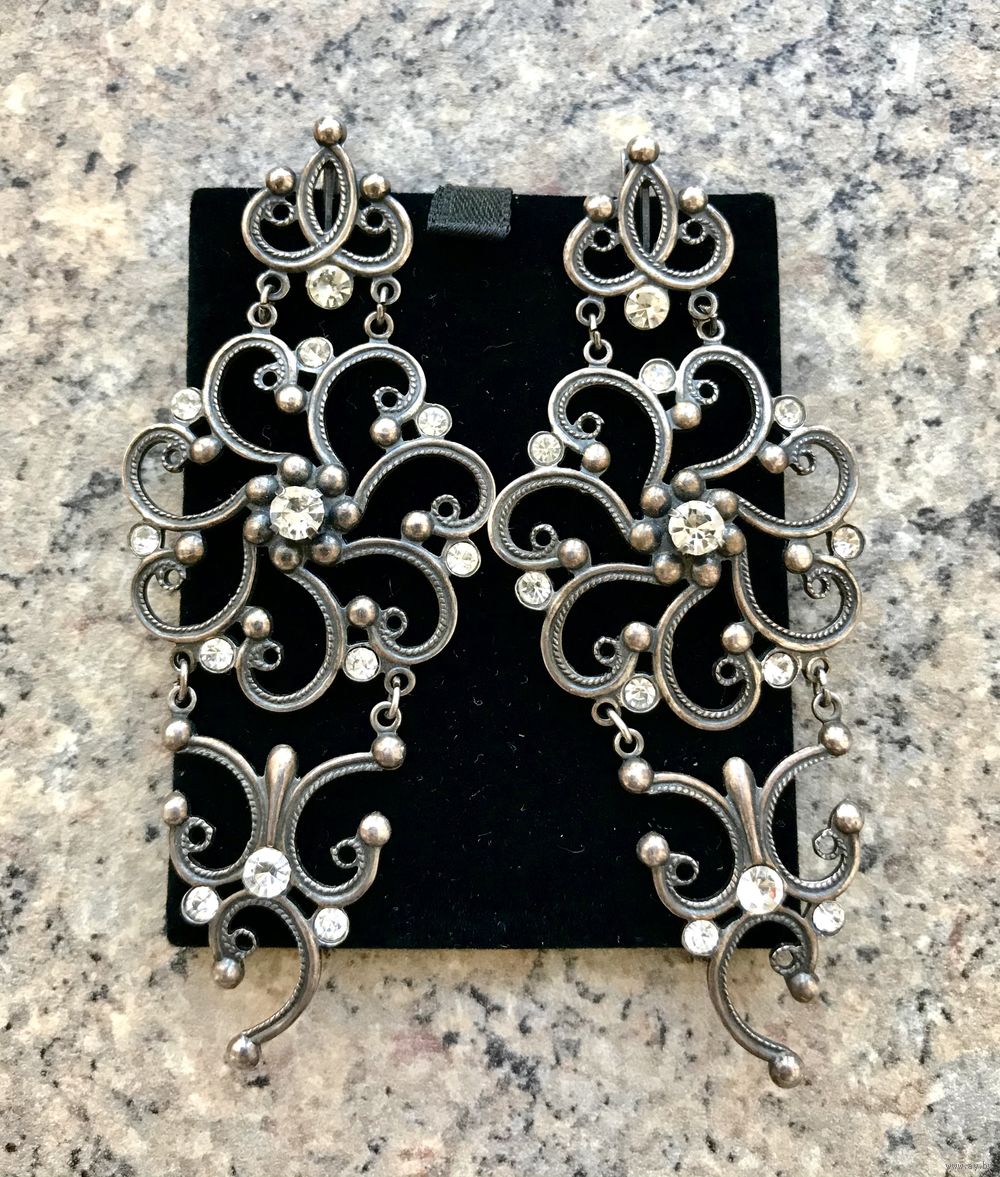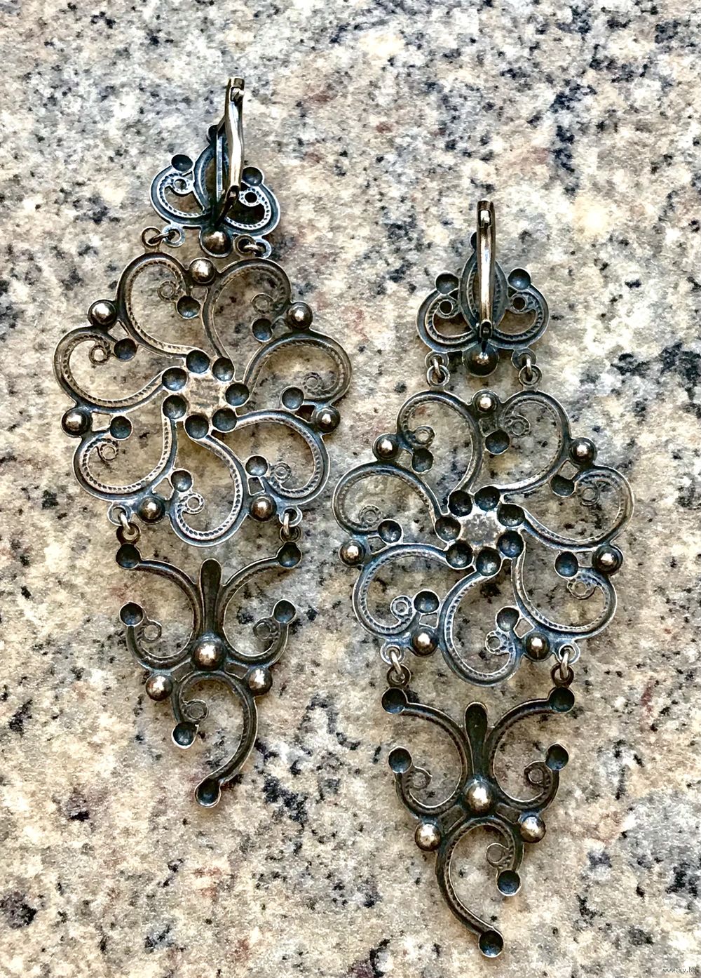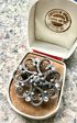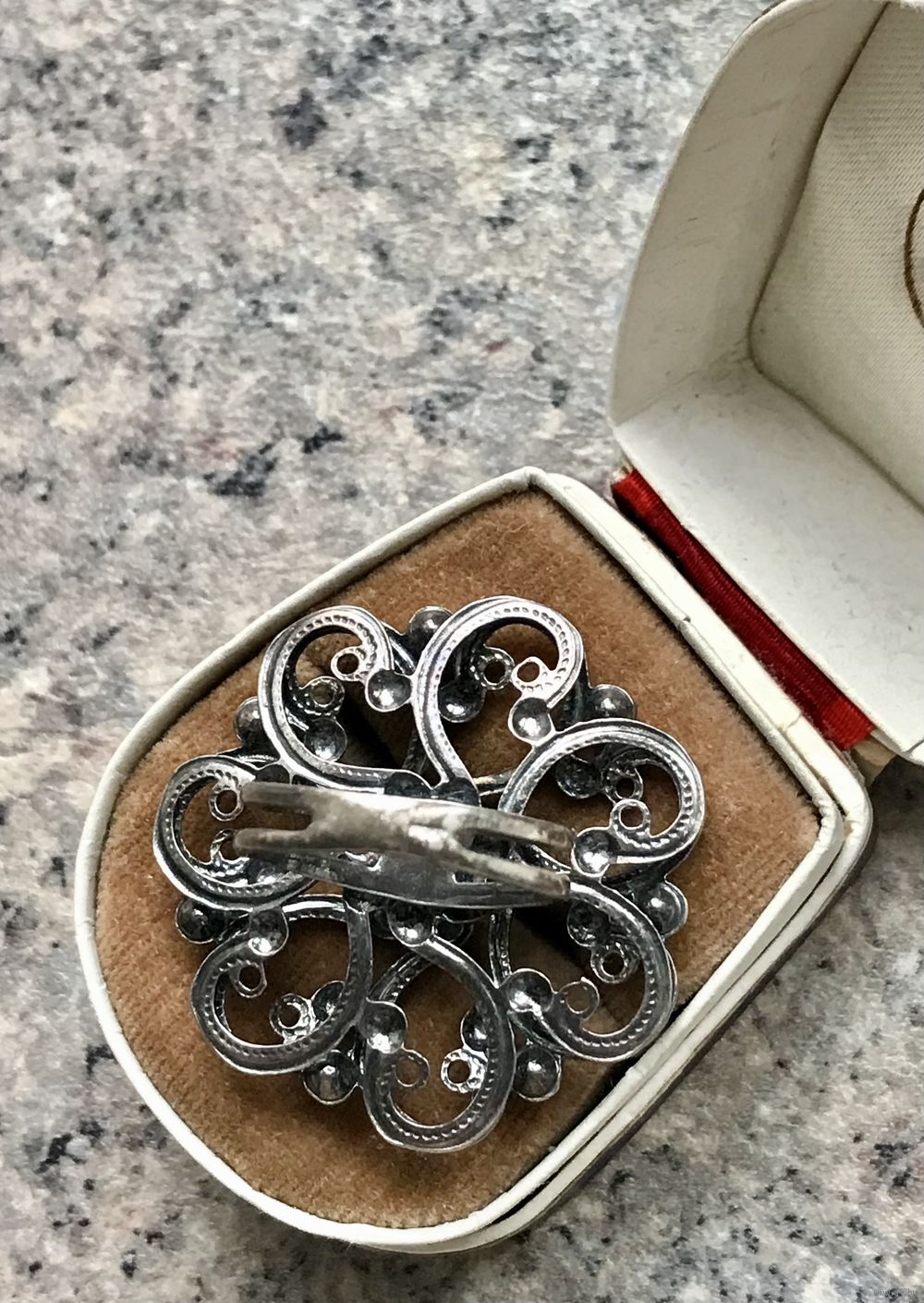 Крупный комплект с основой из металла с серебрением (стоит клеймо) и вставок из юв.стекла. Высота серьги 8,5см., диаметр средней подвески 3,5см. Вся конструкция серьги подвижная. Размер кольца 18, высота каста 3,5см. Состояние хорошее.