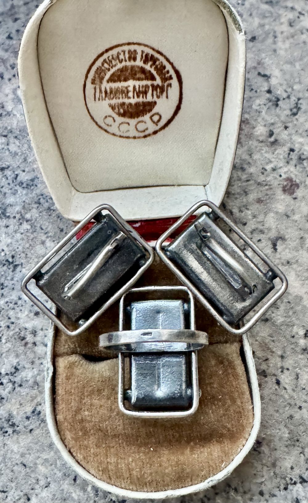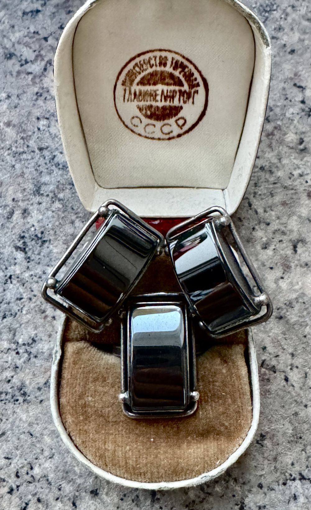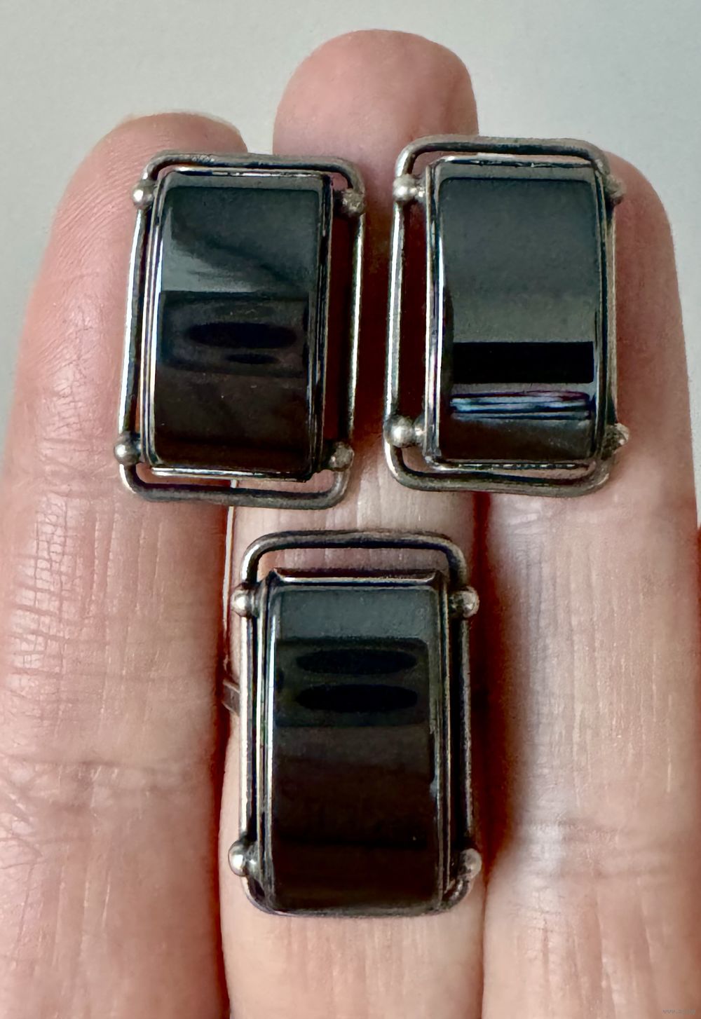 Крупный винтажный комплект из мельхиора и вставок из гематита. Высота серьги 2,3см., ширина 1,5см., размер кольца 16. Состояние хорошее.